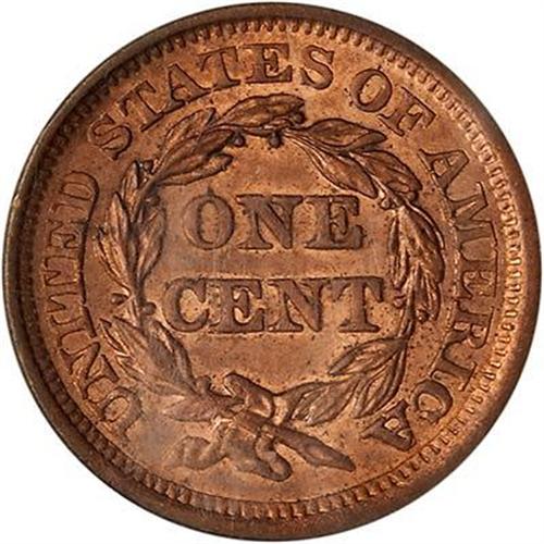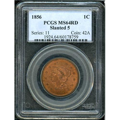 1856 Coronet Head Cent. Slanting 5. Newcomb-14. Rarity-1. Frosty mint red mellowing to light steel brown, at least two-thirds of the mint color remaining. The only defects are some tiny specks of darker toning sprinkled about both sides, only a few of these visible without a strong glass. The notable specks are one in the field between stars 6 & 7 and another at the top of the O in ONE. Scarce E-MDS, die state a late, showing traces of the top of a stray 1 punched into the field under the right side of the 8 in the date. The top of the coronet is not quite fully struck, but it is much stronger than usual for this variety. EAC grade MS63. (#1924)