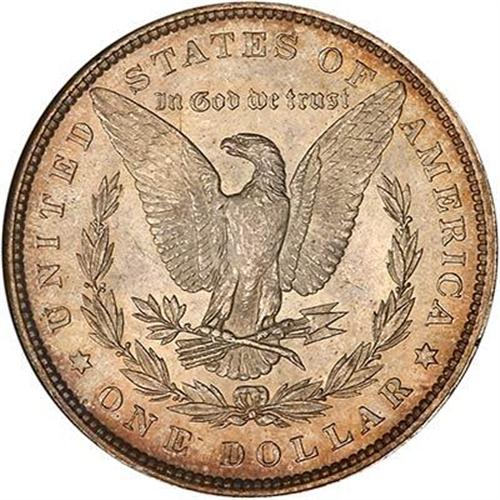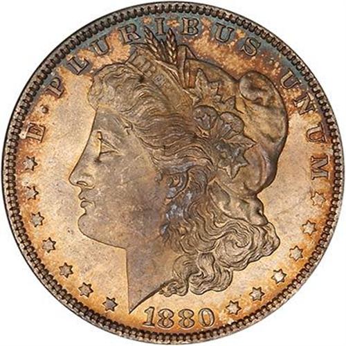 1880 Morgan Dollar. A satin-frosted toned gem that spares no compromises with its rich golden amber iridescence on both sides. Strike is much sharper than average for the 1880 issue, and the surfaces have grand displays of eye-appeal. (#7096)