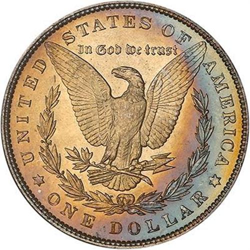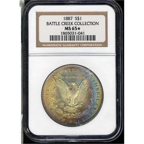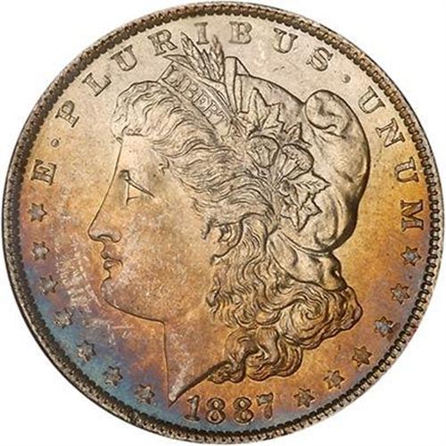 1887 Morgan Dollar. Agreeable obverse toning continues onto the reverse in a long crescent of wildly iridescent sky blue with pale gold. Gemmy quality throughout, of course, and well struck. (#7172)<p><i>from The Battle Creek Collection, Part III</i>