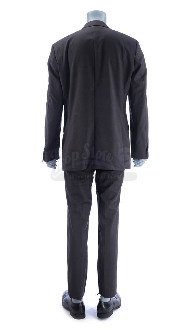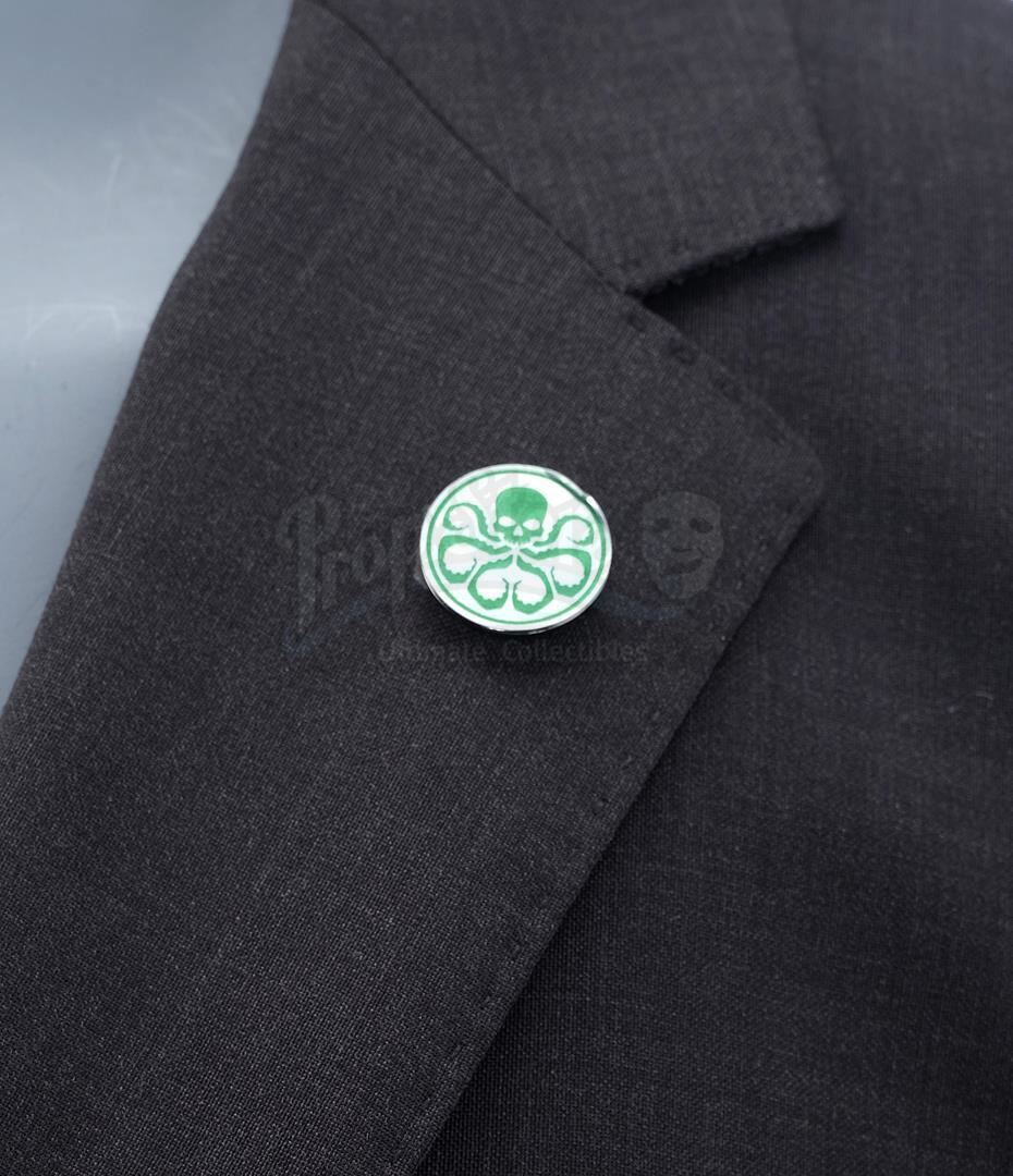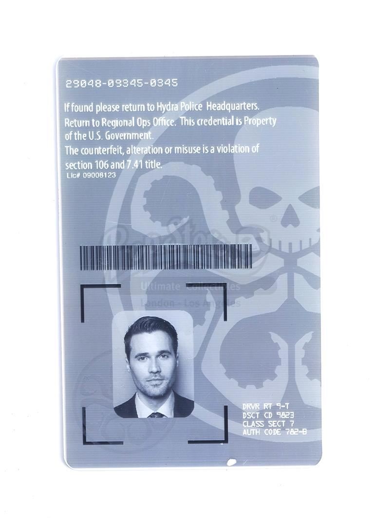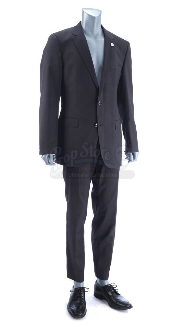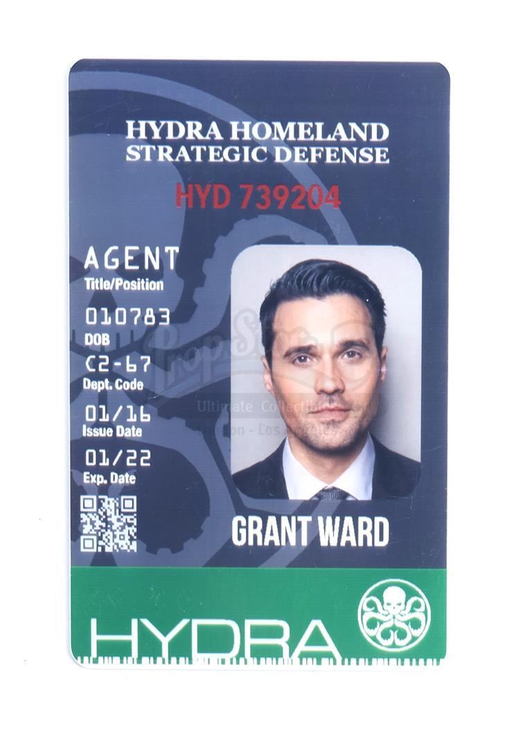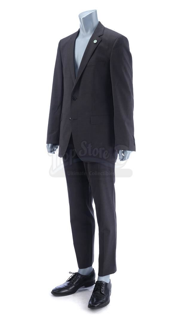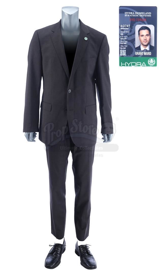Grant Ward's Framework suit and Hydra ID from the episode 'What If...' (416) of Marvel's Agents of S.H.I.E.L.D. In the episode, the Framework simulation of Ward wears his suit while he and Daisy Johnson, who are secretly members of S.H.I.E.L.D, operate as double-agents claiming to work for Hydra. This lot consists of a navy wool-blend jacket affixed with a green and silver-colored metal and urethane Hydra lapel pin and matching pants, a pair of black rubber and leather dress shoes, and a gray, green, white and red urethane Hydra ID card with a picture of Ward affixed to it which was made for production, but ultimately unseen on screen. It is in excellent overall condition with minor wear from production on all items.
