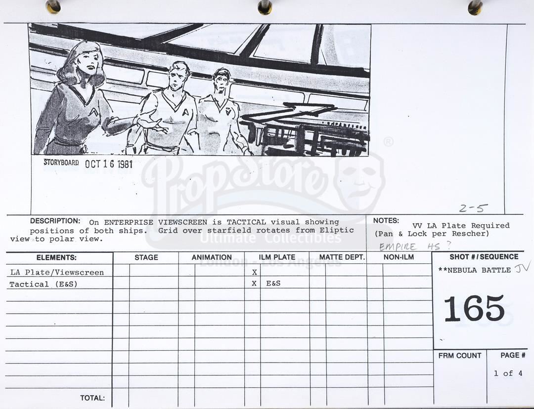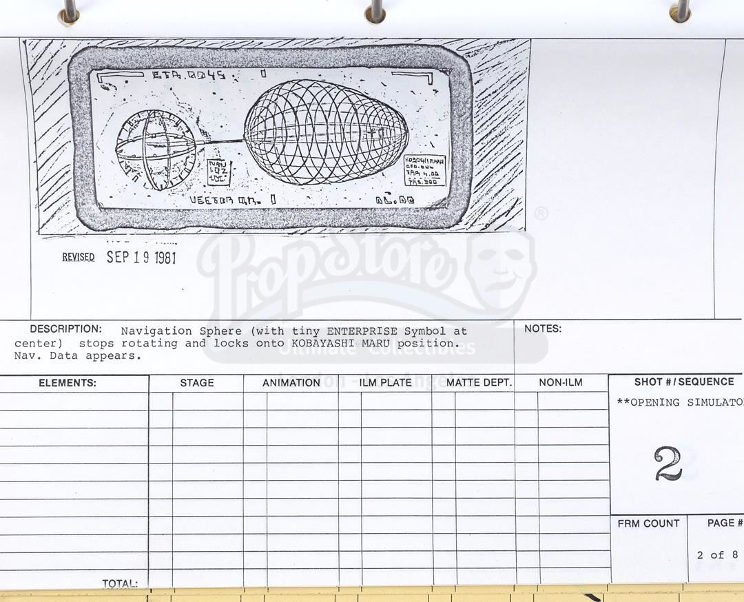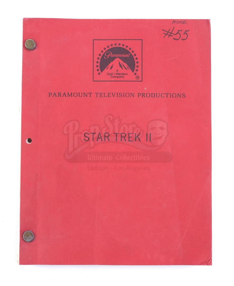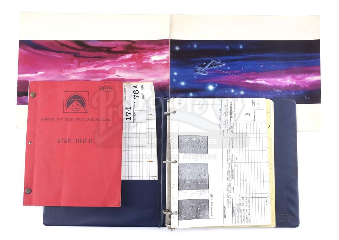 This lot will be auctioned on Tuesday, June 29th. The auction will begin at 9:00am PDT and lots are sold sequentially via live auctioneer; tune in to the live streaming broadcast on auction day to follow the pace. Note other lots in the auction may close on June 30th or July 1st. A production-used Industrial Light & Magic (ILM) storyboard set, script, and artwork prints from Nicholas Meyer's sci-fi sequel Star Trek II: The Wrath of Khan. This lot consists of two glossy prints of paintings by illustrator Thomas W. Lay, Jr. depicting the Enterprise facing off against the Reliant; a hand-annotated and highlighted Paramount Television Productions script; and a navy binder of printed visual effects storyboards labeled "Star Trek II Storyboard No. 11." All are in good overall condition with some edge wear and creasing from use. Dimensions (largest): 14" x 11" (35.75 cm x 28 cm); (smallest): 11" x 9" x 1" (28 cm x 23 cm x 2.75 cm) Estimate: $1,500 - 2,500