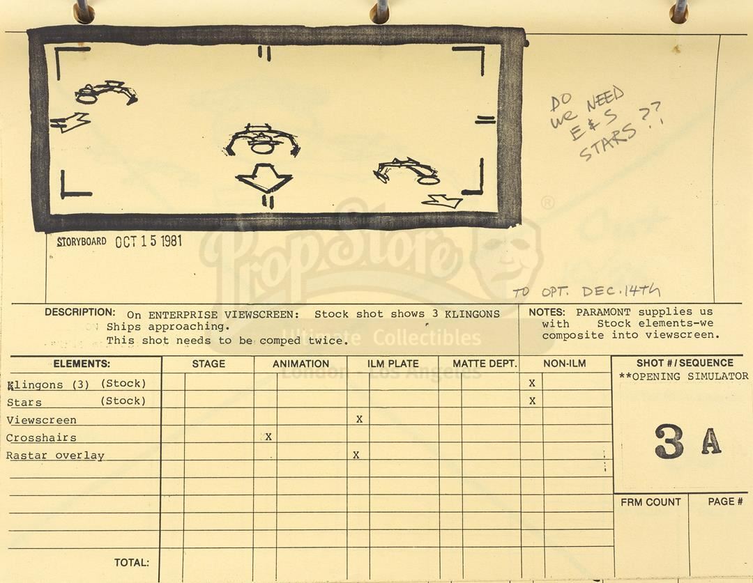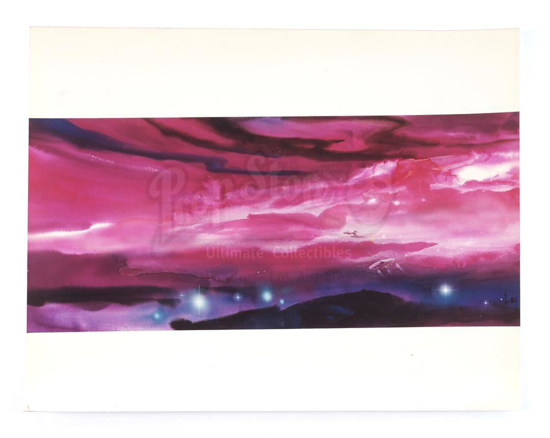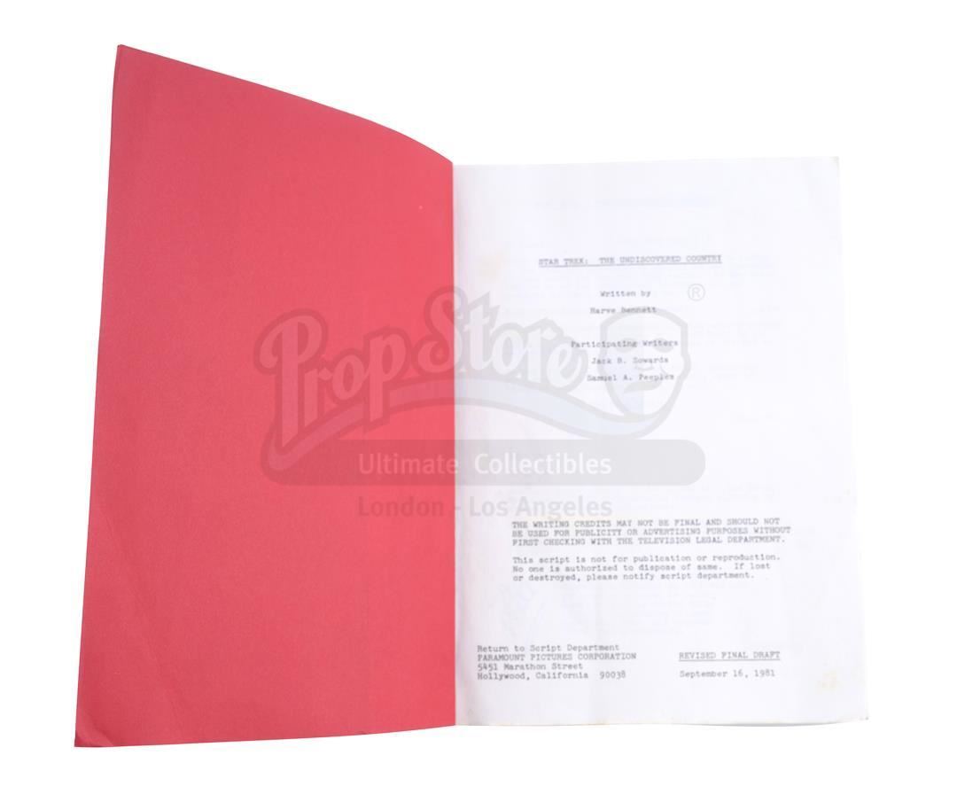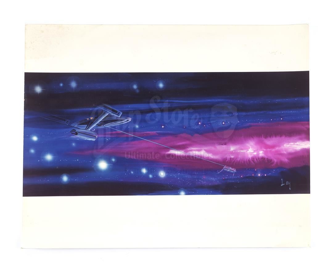 This lot will be auctioned on Tuesday, June 29th. The auction will begin at 9:00am PDT and lots are sold sequentially via live auctioneer; tune in to the live streaming broadcast on auction day to follow the pace. Note other lots in the auction may close on June 30th or July 1st. A production-used Industrial Light & Magic (ILM) storyboard set, script, and artwork prints from Nicholas Meyer's sci-fi sequel Star Trek II: The Wrath of Khan. This lot consists of two glossy prints of paintings by illustrator Thomas W. Lay, Jr. depicting the Enterprise facing off against the Reliant; a hand-annotated and highlighted Paramount Television Productions script; and a navy binder of printed visual effects storyboards labeled "Star Trek II Storyboard No. 11." All are in good overall condition with some edge wear and creasing from use. Dimensions (largest): 14" x 11" (35.75 cm x 28 cm); (smallest): 11" x 9" x 1" (28 cm x 23 cm x 2.75 cm) Estimate: $1,500 - 2,500