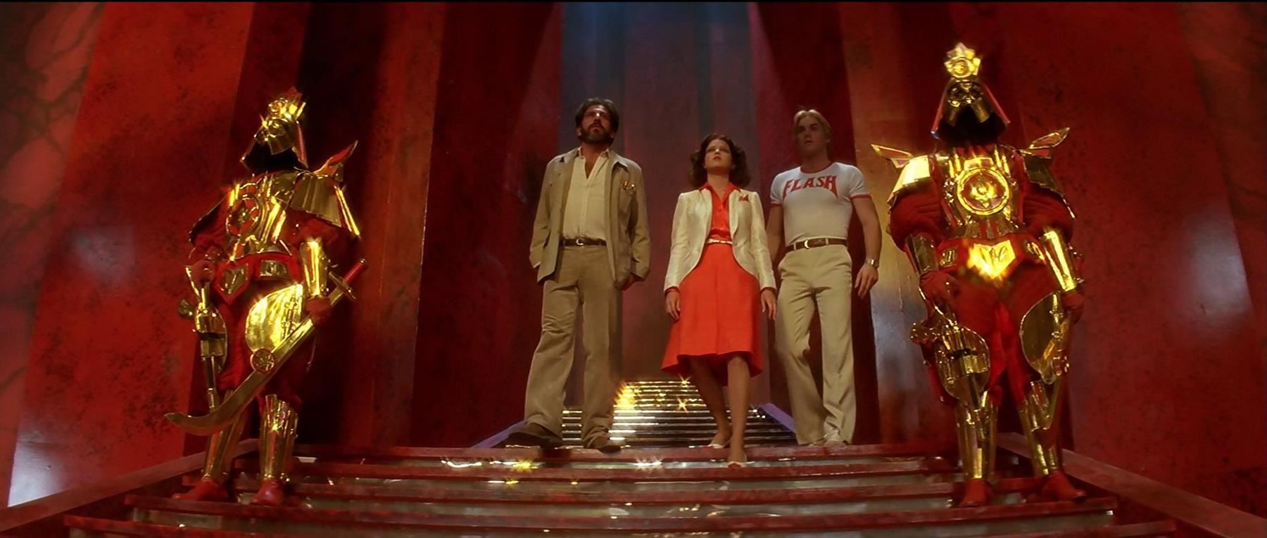 A Ming's (Max Von Sydow) soldier's mask from Mike Hodges' sci-fi adventure Flash Gordon. Football player Flash Gordon (Sam J. Jones) and his friends were shot into space, and landed on the planet Mongo where they were captured by armored mask-wearing soldiers of the evil Emperor Ming, ruler of the universe.