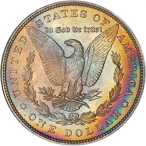 1887 Morgan Dollar. Light sky blue and gold mainly, with a splash of iridescent purple and deeper royal blue, but light sky blue and gold mainly. (#7172)<p><i>from The Battle Creek Collection, Part III</i>