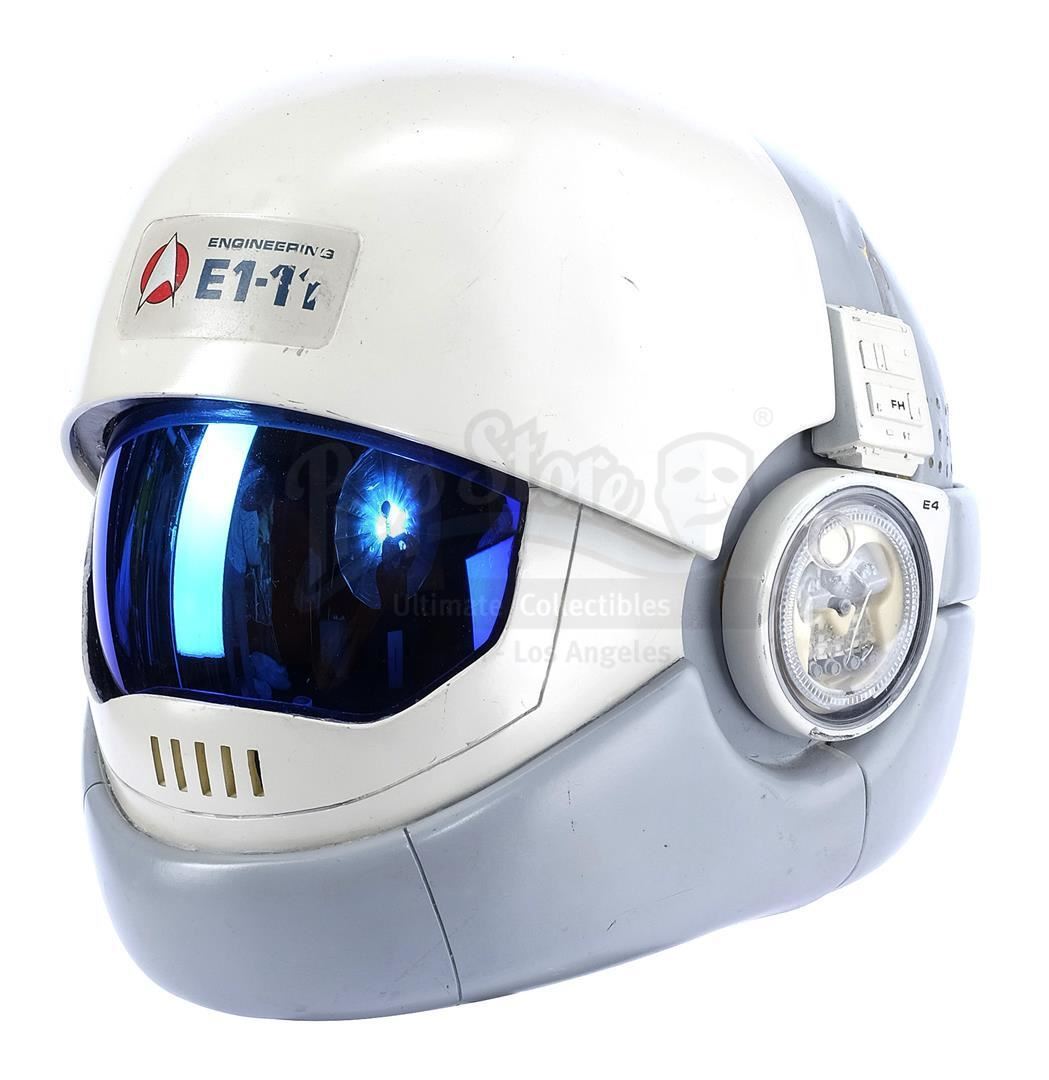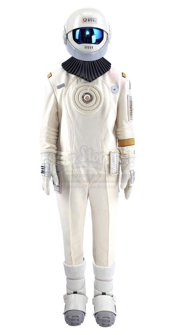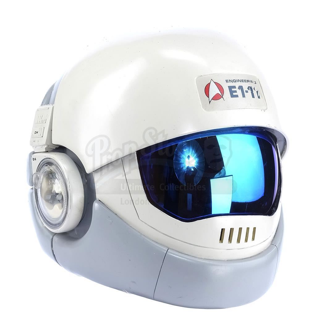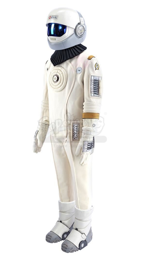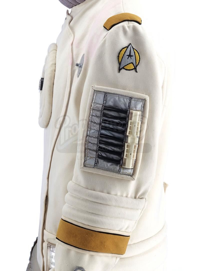 This lot will be auctioned on Tuesday, June 29th. The auction will begin at 9:00am PDT and lots are sold sequentially via live auctioneer; tune in to the live streaming broadcast on auction day to follow the pace. Note other lots in the auction may close on June 30th or July 1st. Samno's (Alan Marcus) assassin EV suit from Nicholas Meyer's sci-fi film Star Trek VI: The Undiscovered Country. Samno and Yeoman Burke (B.J. Davis) donned Starfleet environmental suits to infiltrate the Klingon vessel Kronos One. This lot consists of a white fiberglass helmet with a blue reflective visor, a forehead Starfleet insignia, and the designation "Engineering E1-11"; a black foam rubber collar; a white ribbed leather and cotton jumpsuit with gold-color details and circular patterns at center; a metal pin on the chest; white leather gloves with silver-color patches and black rubber tubing; matching leather and rubber gravity boots; and a silver-color resin buckle. The "E1-11" designation identifies this suit as Samno's, as the other suit seen in the sequence, Burke's, was designated "E1-02." The lot is in good overall condition with some wear from production and age, including cracking to the leather, foam, and rubber elements as well as some scuffing to the helmet including its lettering. Estimate: $10,000 - 15,000