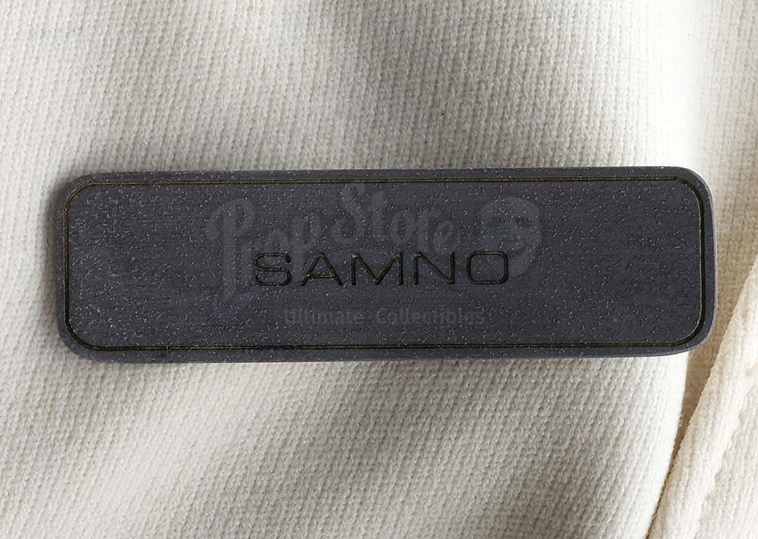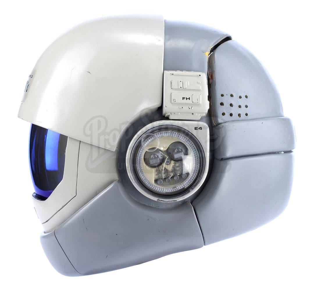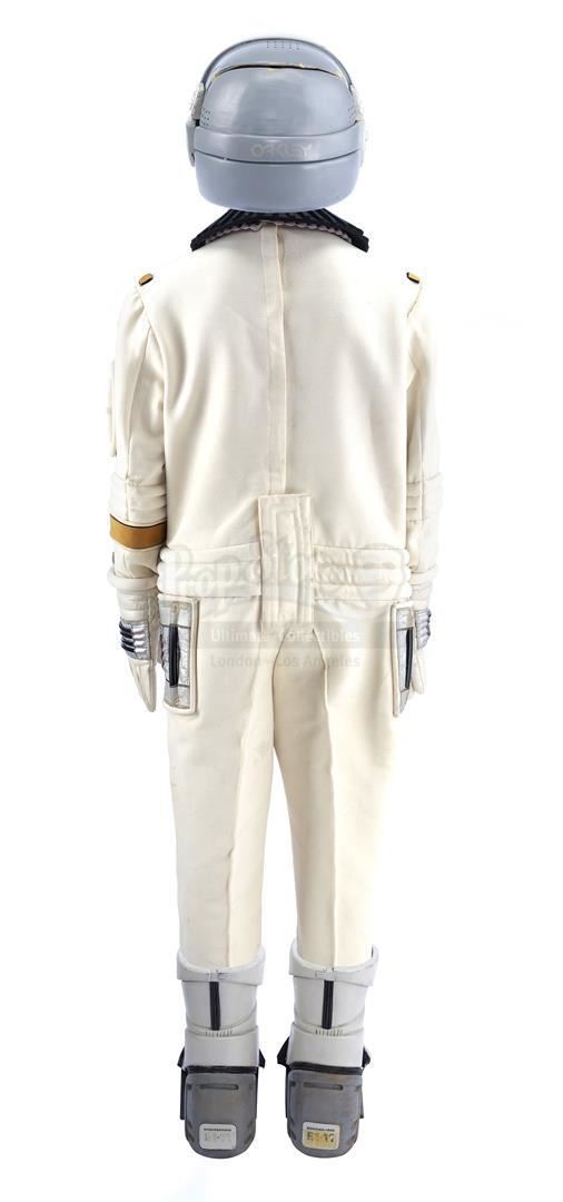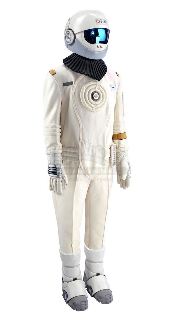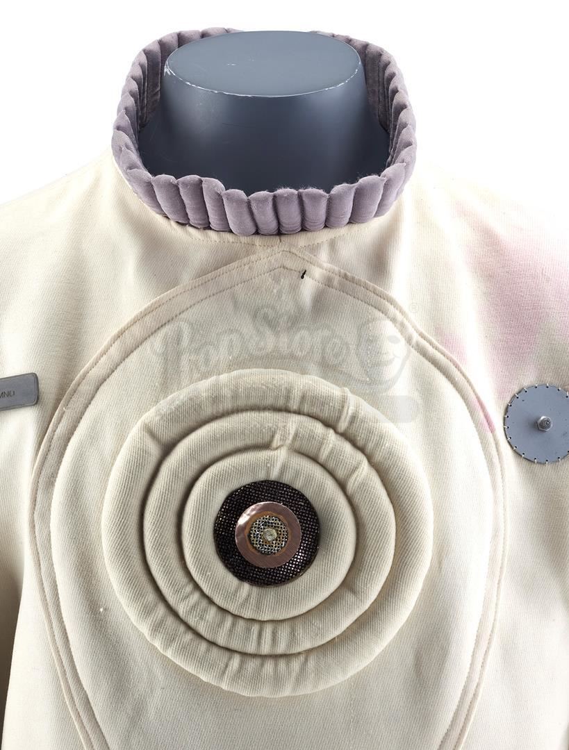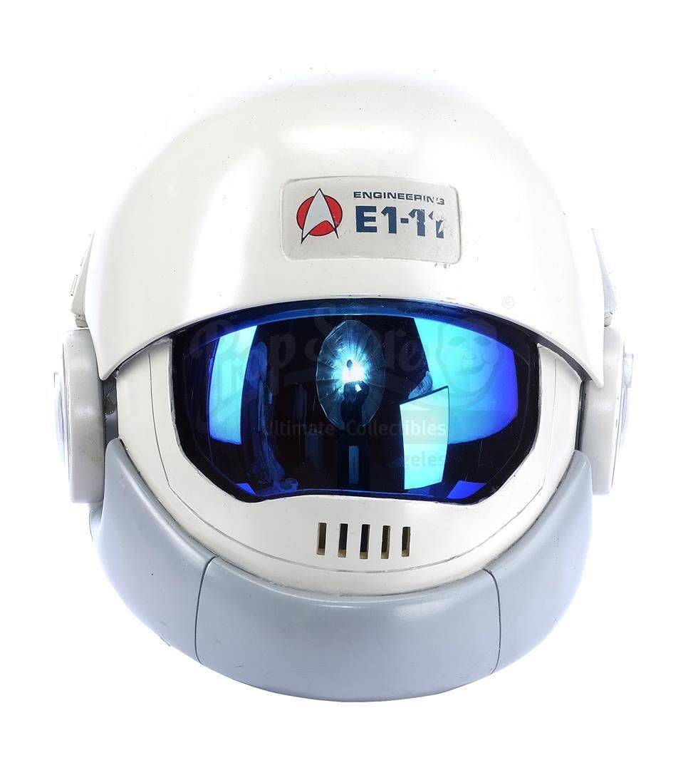 This lot will be auctioned on Tuesday, June 29th. The auction will begin at 9:00am PDT and lots are sold sequentially via live auctioneer; tune in to the live streaming broadcast on auction day to follow the pace. Note other lots in the auction may close on June 30th or July 1st. Samno's (Alan Marcus) assassin EV suit from Nicholas Meyer's sci-fi film Star Trek VI: The Undiscovered Country. Samno and Yeoman Burke (B.J. Davis) donned Starfleet environmental suits to infiltrate the Klingon vessel Kronos One. This lot consists of a white fiberglass helmet with a blue reflective visor, a forehead Starfleet insignia, and the designation "Engineering E1-11"; a black foam rubber collar; a white ribbed leather and cotton jumpsuit with gold-color details and circular patterns at center; a metal pin on the chest; white leather gloves with silver-color patches and black rubber tubing; matching leather and rubber gravity boots; and a silver-color resin buckle. The "E1-11" designation identifies this suit as Samno's, as the other suit seen in the sequence, Burke's, was designated "E1-02." The lot is in good overall condition with some wear from production and age, including cracking to the leather, foam, and rubber elements as well as some scuffing to the helmet including its lettering. Estimate: $10,000 - 15,000