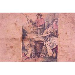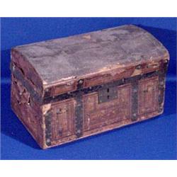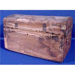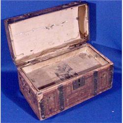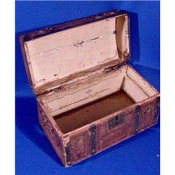 This Jenny Lind doll trunk has water damage and some paper loss. Has original brass studs and insert. The bottom is inscribed "Presented to Miss Annie Wright By Cousin Mark Jan'y 1st 1873". 14"l x 8"w x 8.25"h. American. Ca. 1870. Est. $40 - $60.