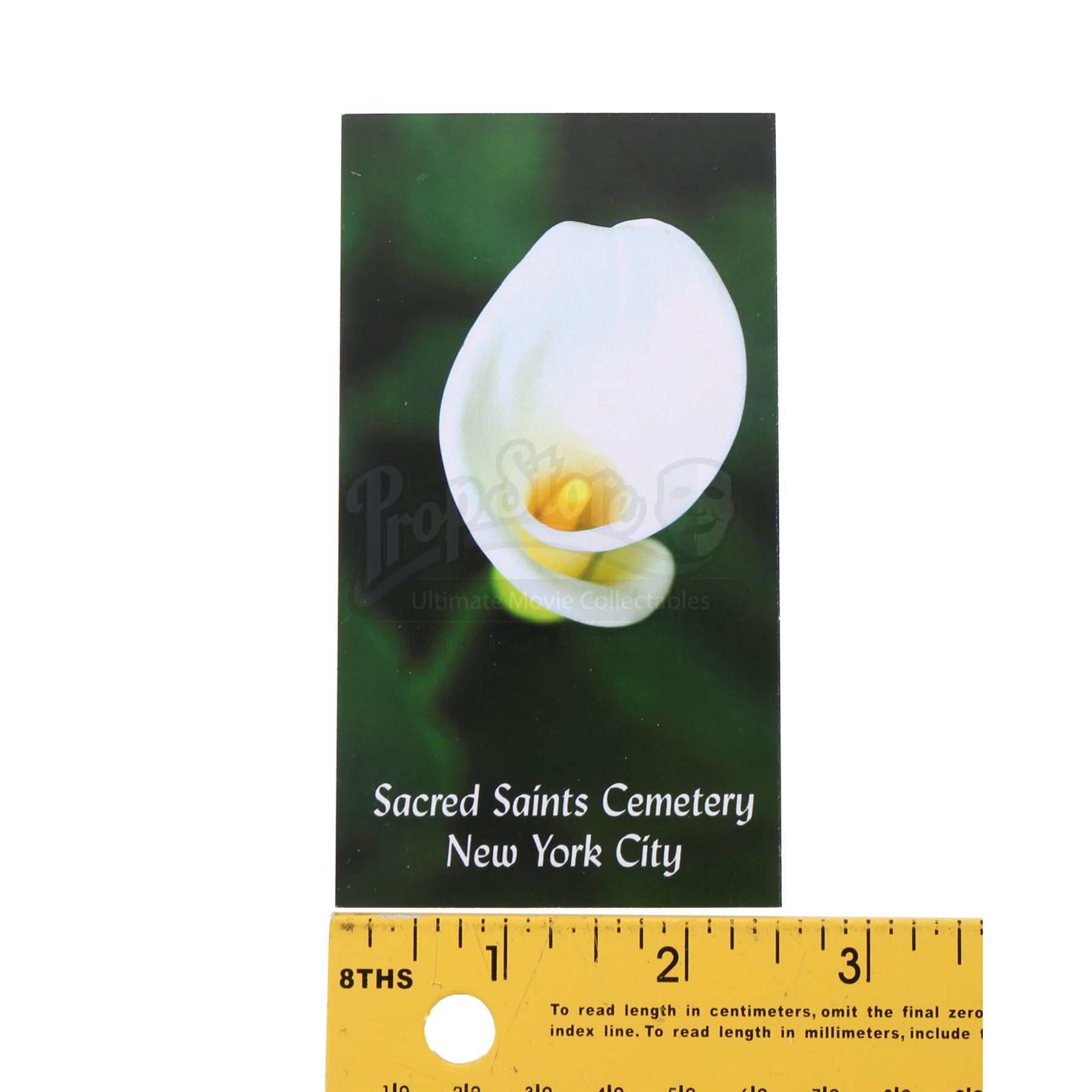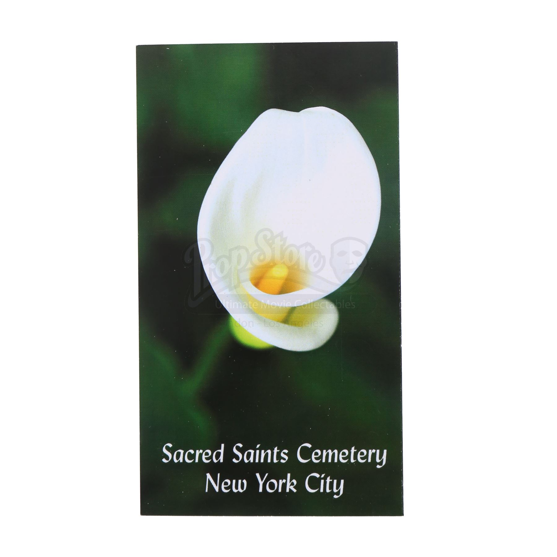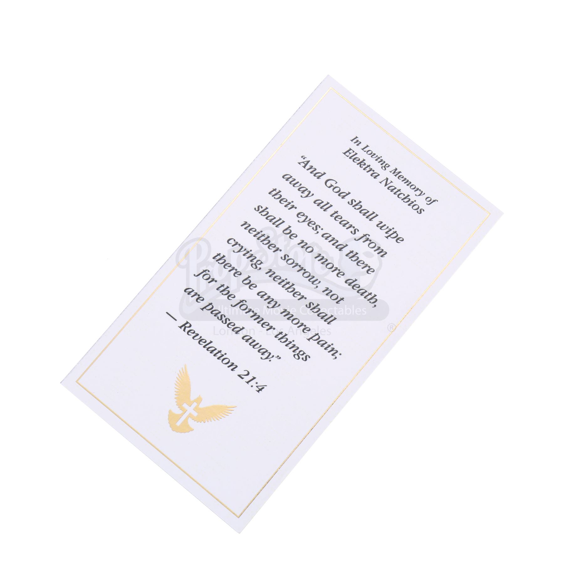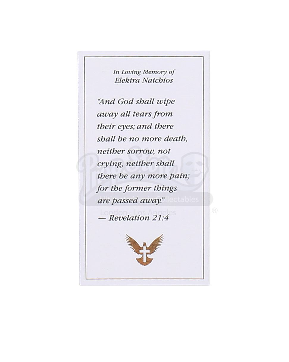 A program for Elektra Natchios' funeral from the episode ‘A Cold Day in Hell’s Kitchen’ (213) of Marvel's Daredevil. In the episode, Natchios is buried in Sacred Saints Cemetery by Matt Murdock and Stick after her funeral. This high-quality printed paper program with a satin finish is in good overall condition, with some scuffing from production.