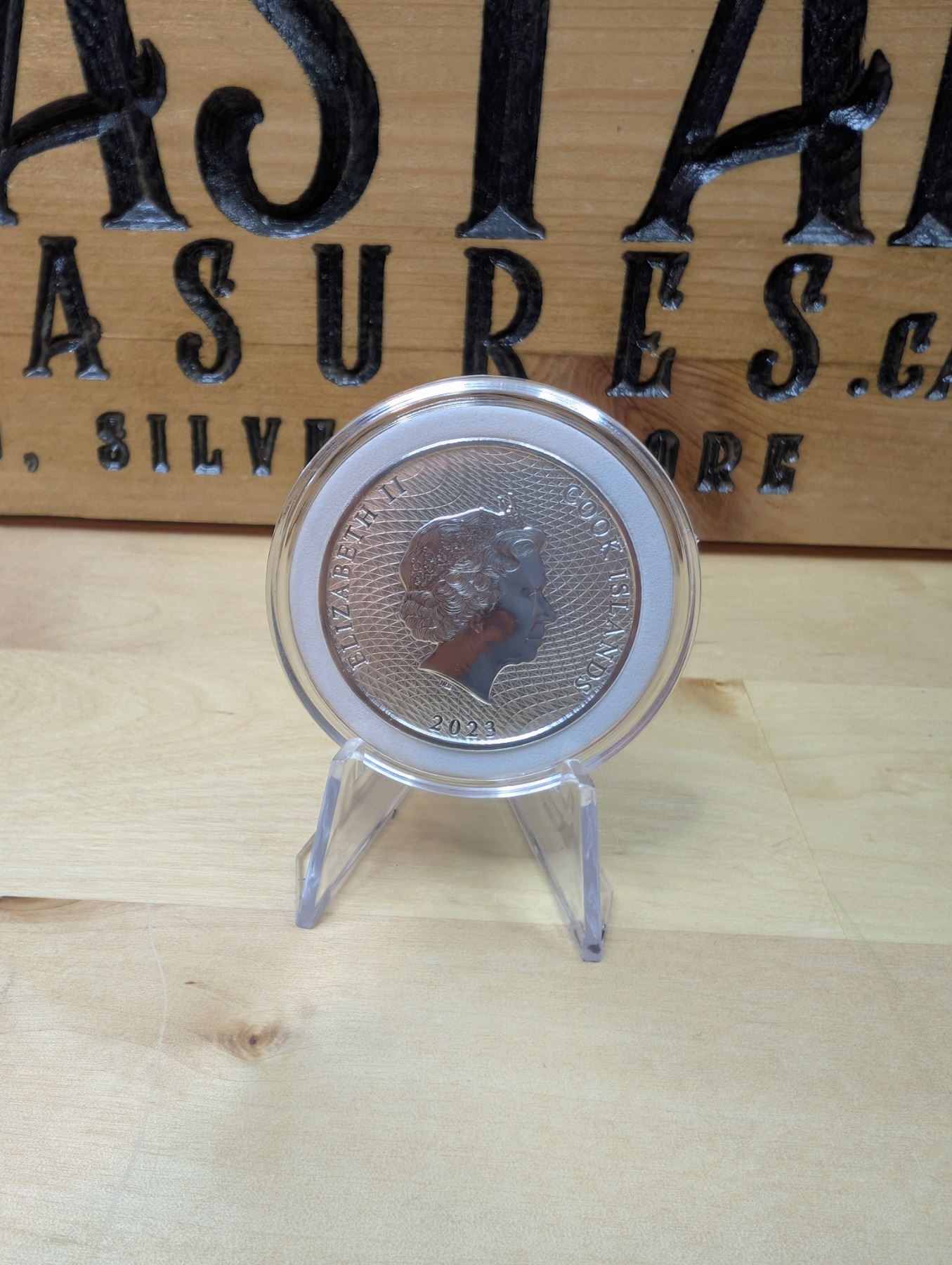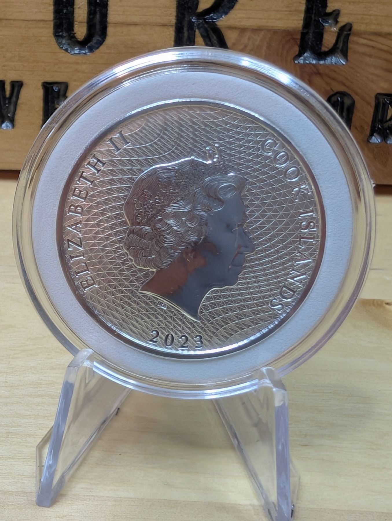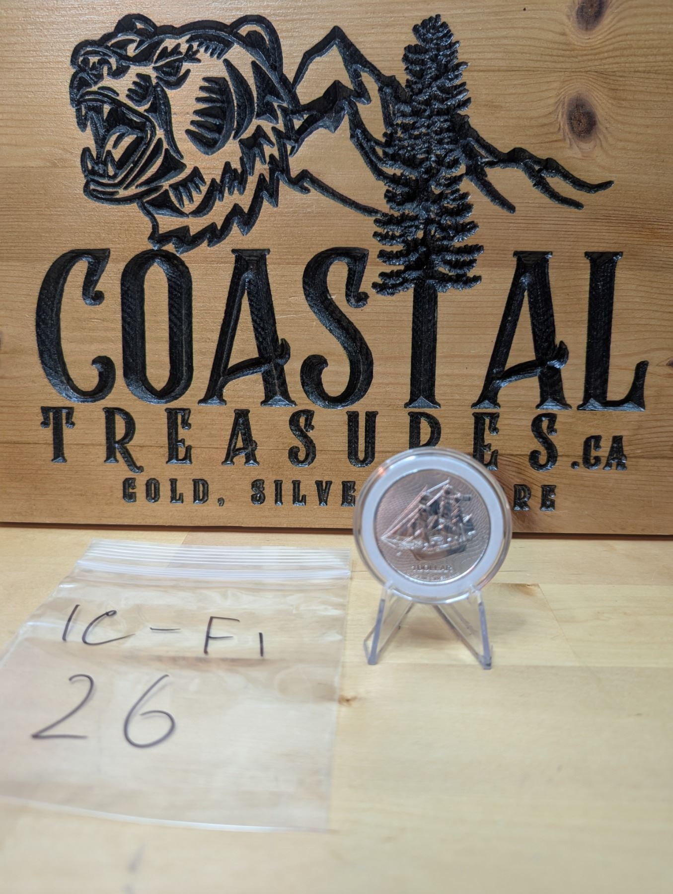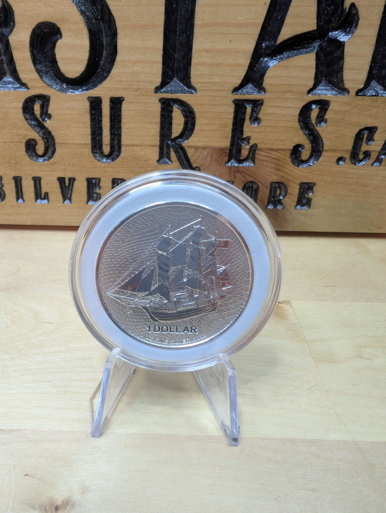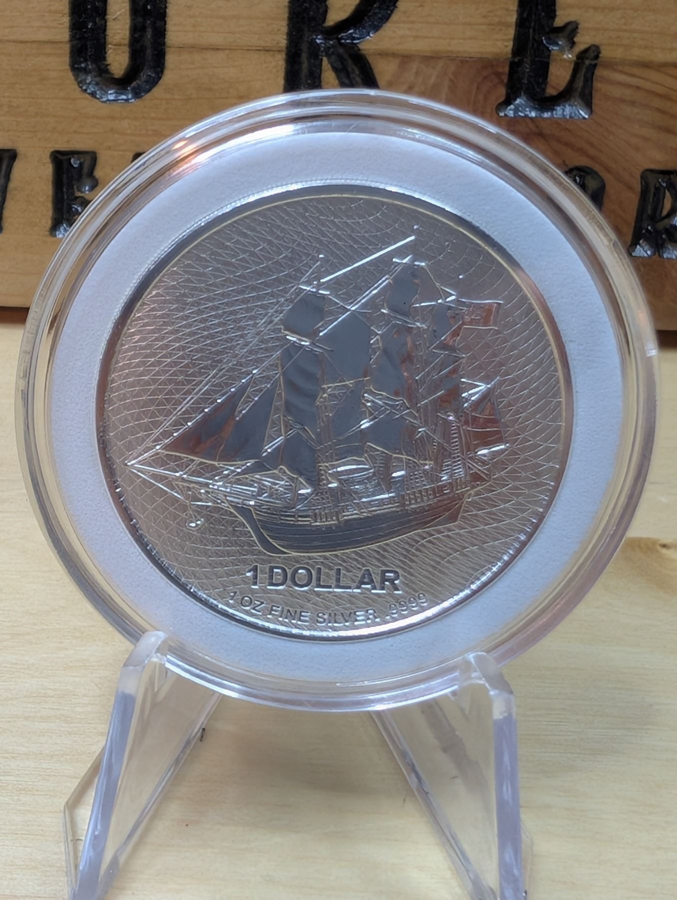 The 1 oz Cook Island Bounty Ship Silver Coin is a bullion coin made of 99.9% pure silver. It features a detailed image of the HMAV Bounty, a famous British ship, on the reverse. The coin's design typically includes the ship in full sail, along with a depiction of the Cook Islands' coat of arms and the year of issue. The obverse usually features the effigy of Queen Elizabeth II. This coin is popular among collectors for its historical theme and fine silver content.