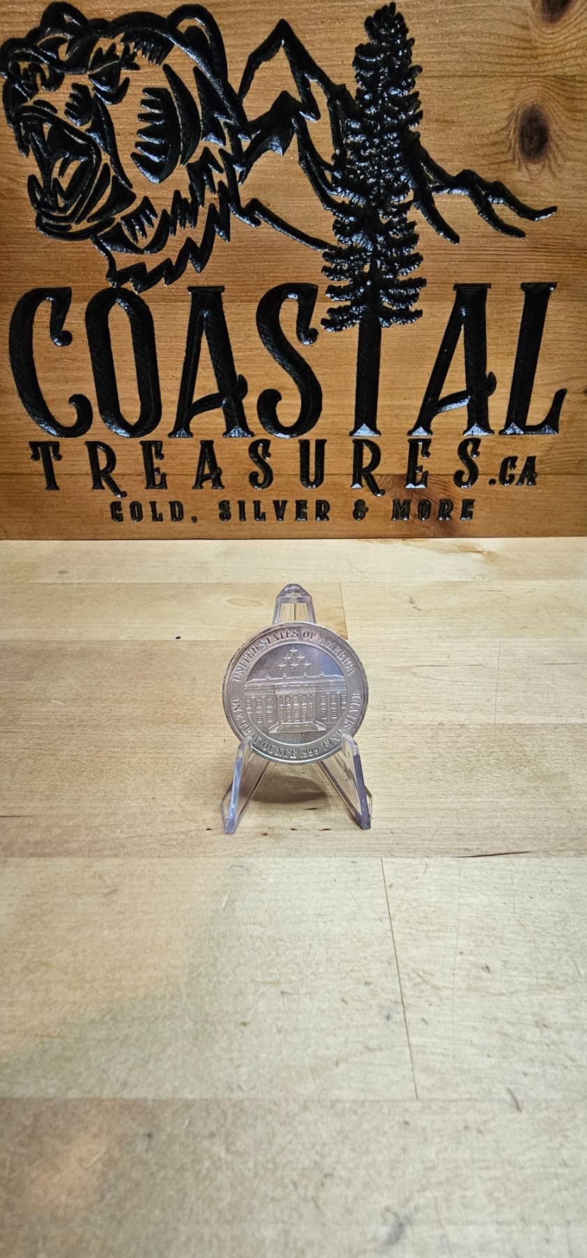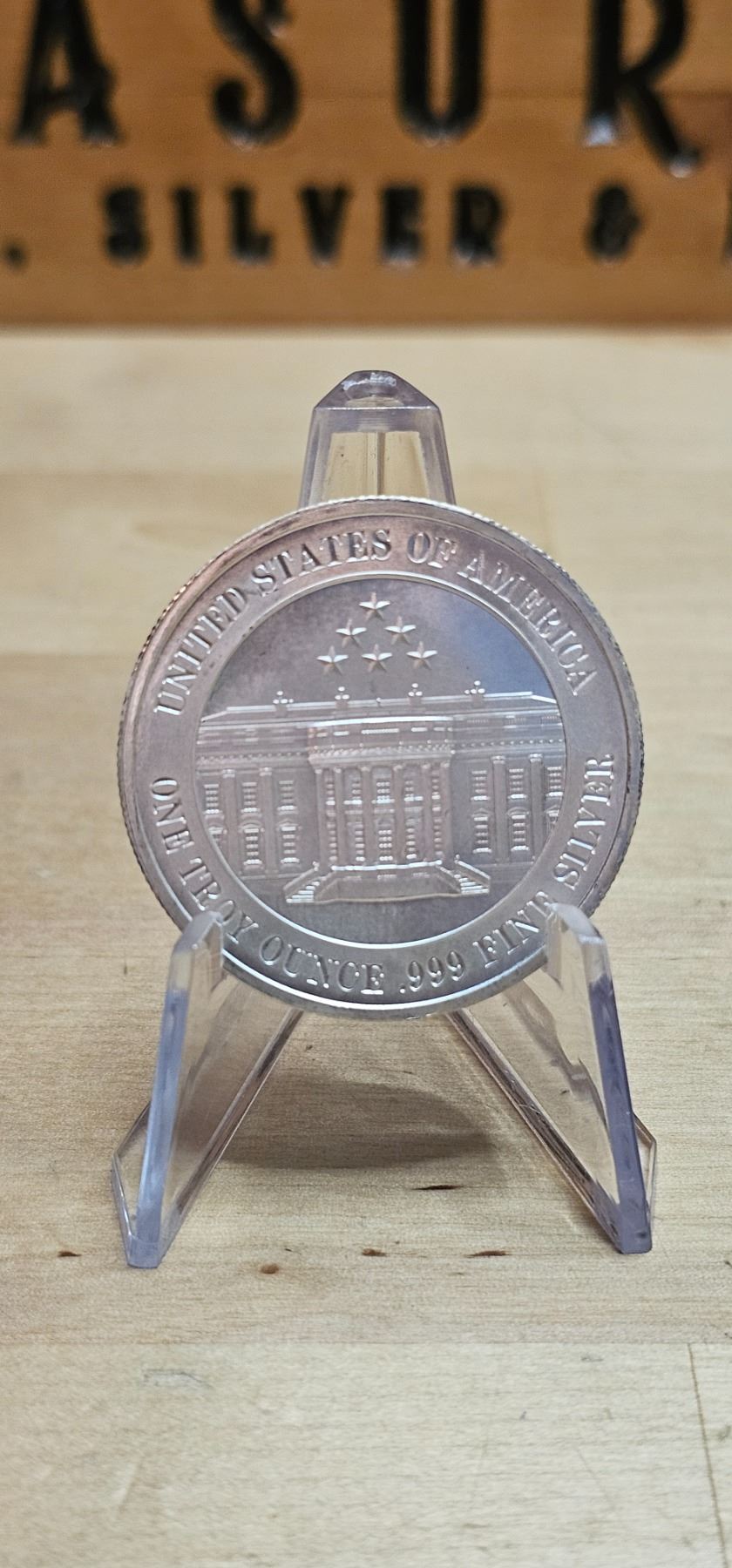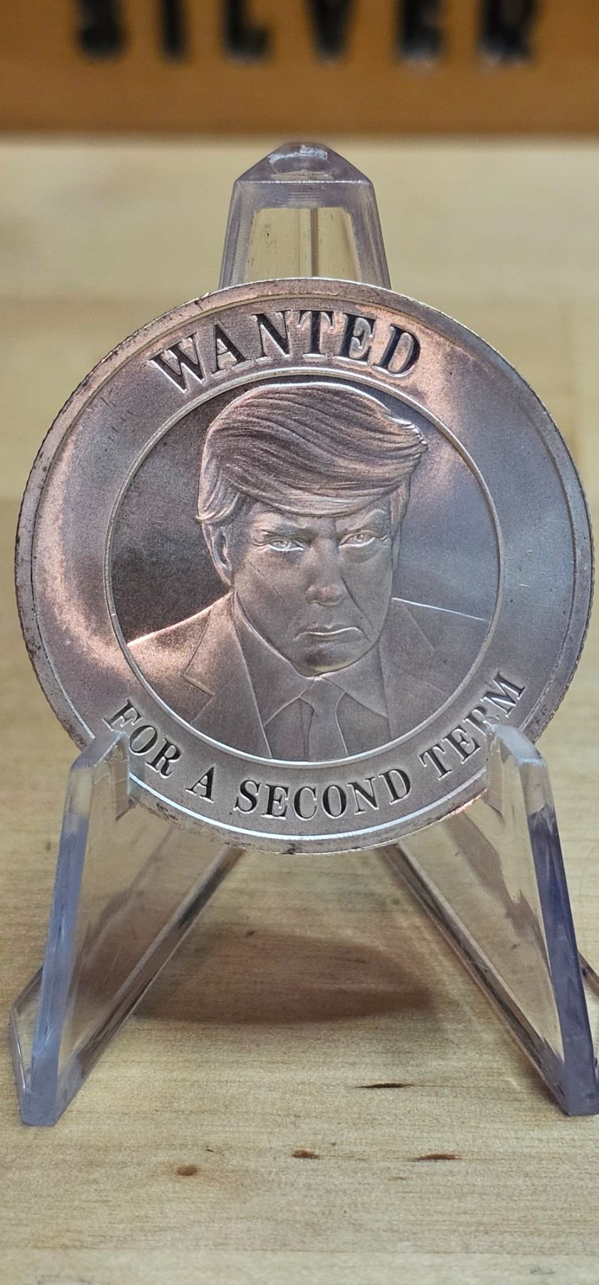 The 1 oz Trump Wanted Second Term silver round features a bold design celebrating former President Donald Trump’s bid for a second term. Struck from 99.9% pure silver, this round showcases striking imagery and memorable slogans, appealing to political collectors and supporters alike. With its unique theme and intrinsic value, it offers a distinctive addition to any collection, blending artistry with a piece of contemporary political history.