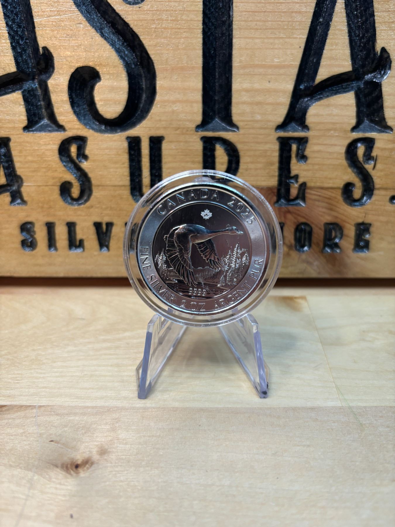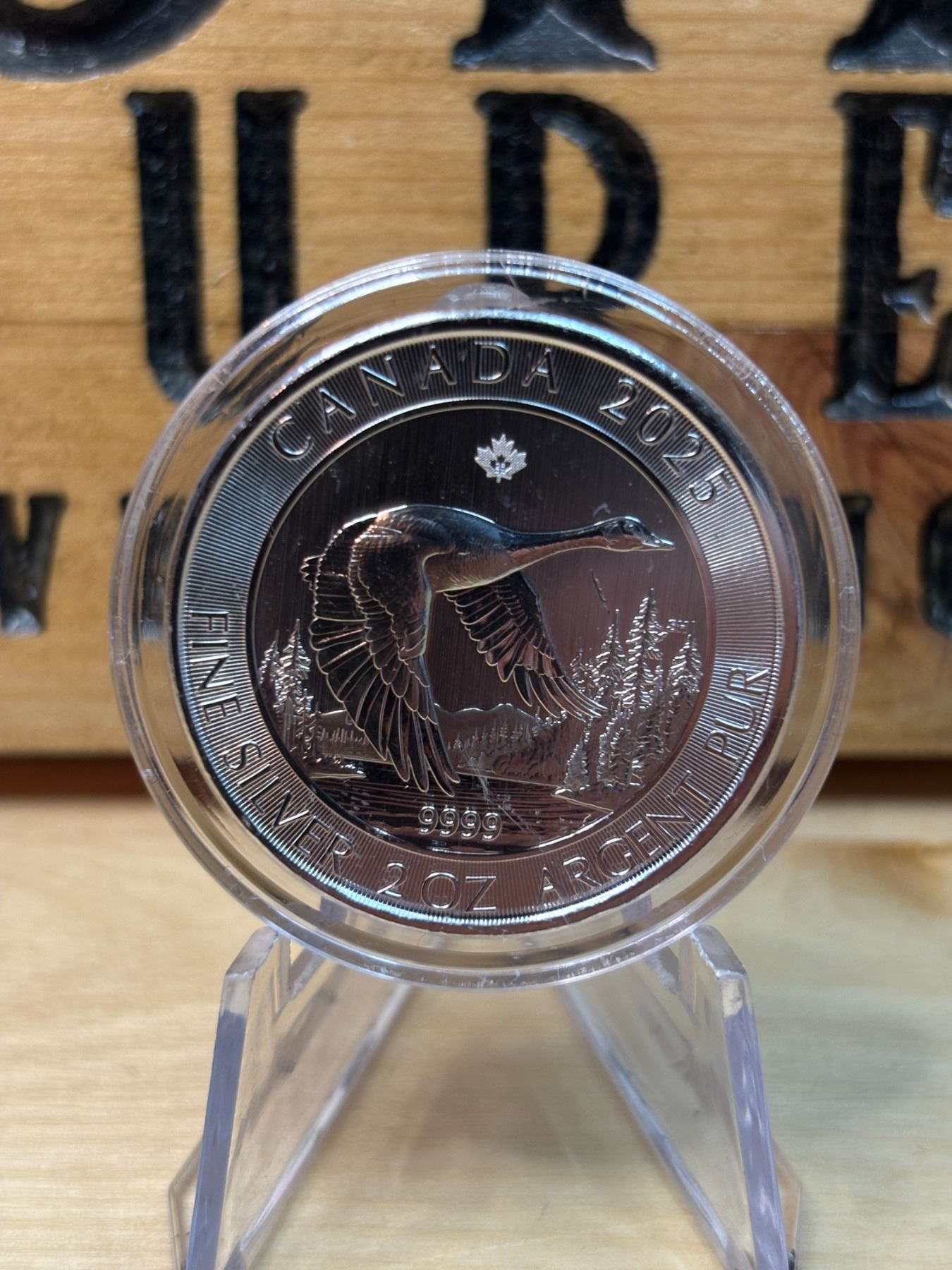 The 2 oz Goose in Flight Silver Coin is a 2-ounce coin made from 99.9% pure silver. It typically features a beautifully detailed design of a goose in flight, capturing the elegance and freedom of the bird in mid-air. The coin may be part of a wildlife or nature-themed series, and its size and design make it highly collectible. The coin is valued both for its silver content and the striking imagery of the goose, which symbolizes migration, nature, and the beauty of wildlife.