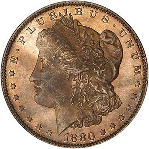 1880 Morgan Dollar. Naturally toned frosty to satin luster is boldly displayed on this fresh-appearing 1880. Struck with exactitude by the dies. (#7096)