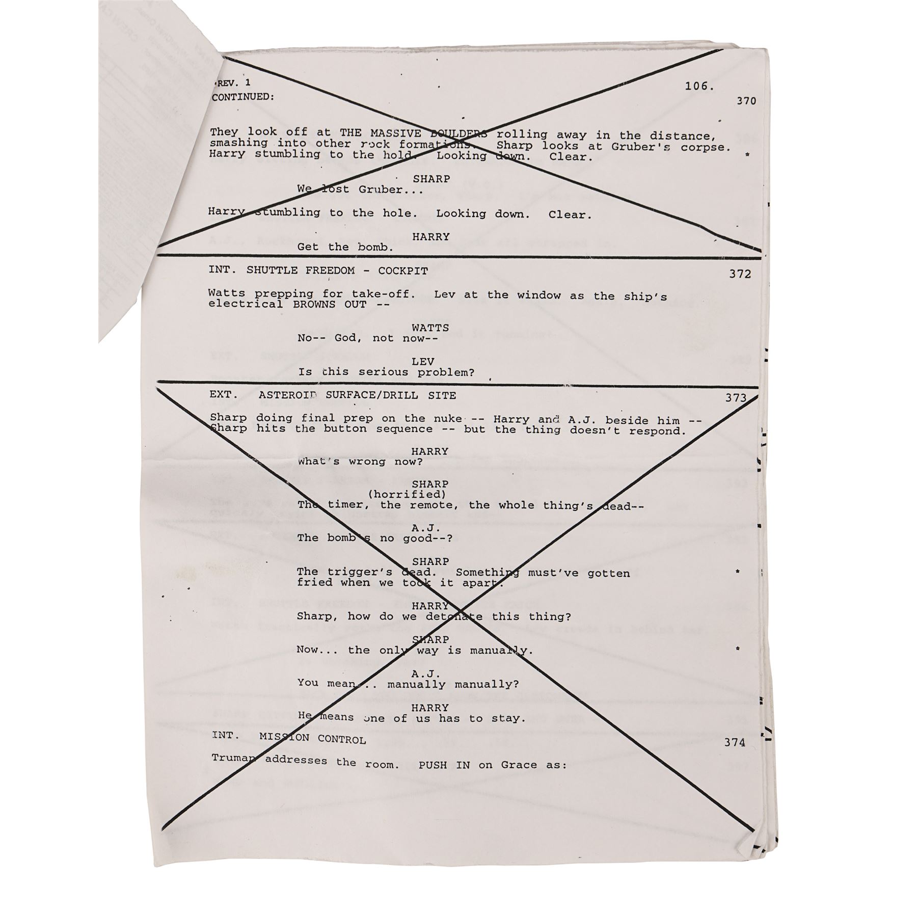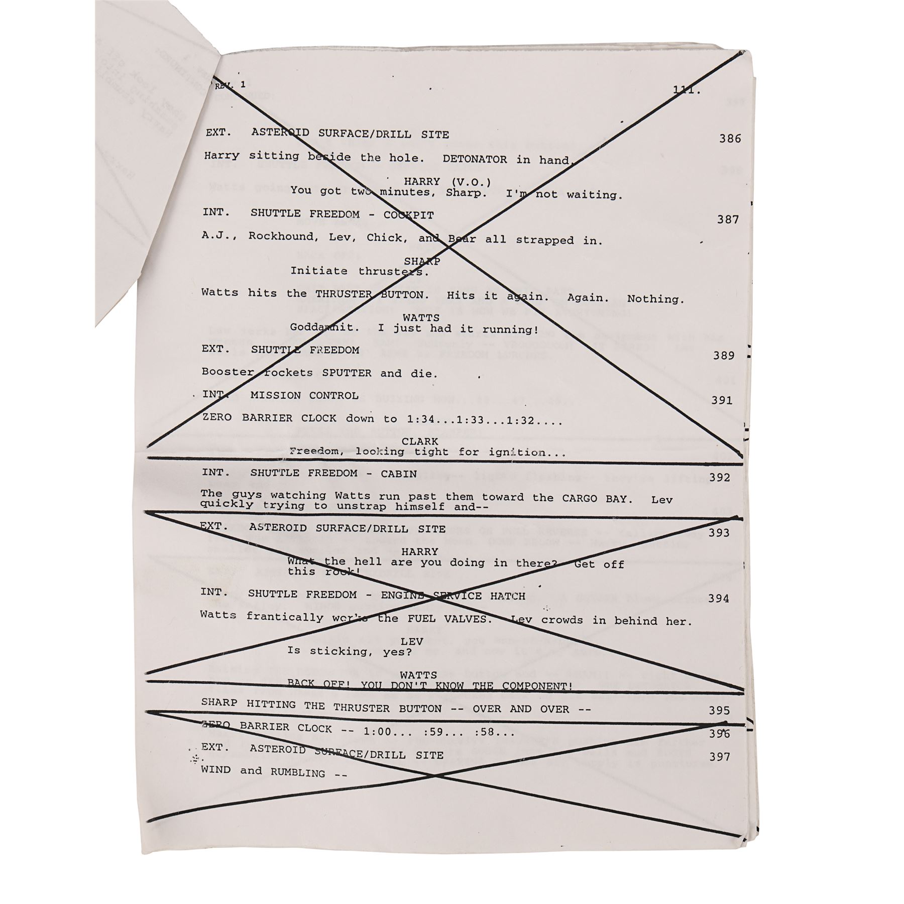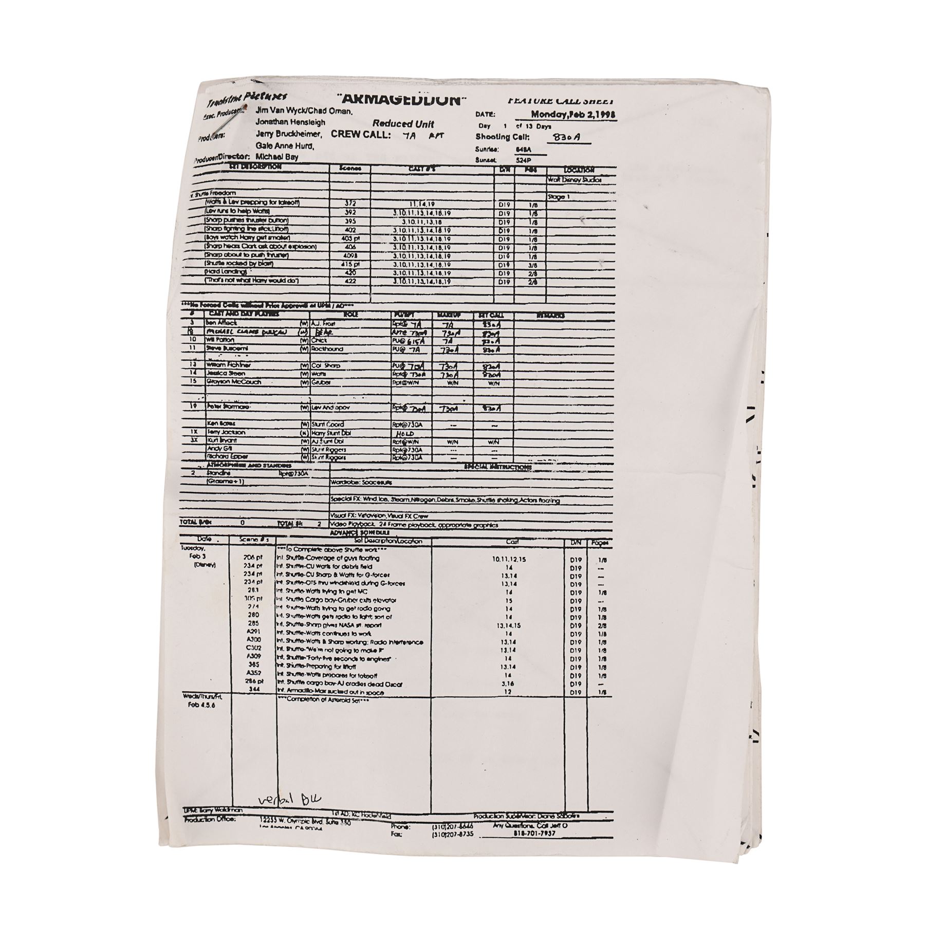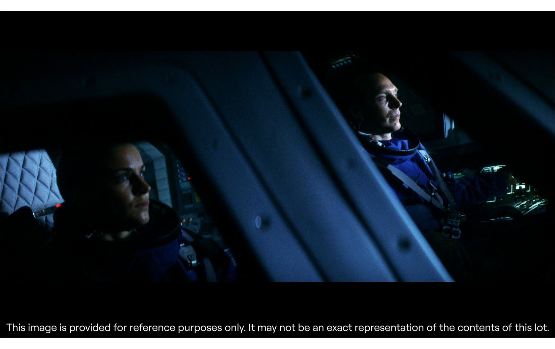 "Sharp" is written in black marker on the inside of the suit near the ring, and the costume exhibits minor scratches on the visor and several marks on the suit, while the suits lining is split at the bottom of the zip. There are also glue remnants near the components, and on the left sleeve where patches were once stuck. The helmet comes with an original production protective fabric bag. The lot is accompanied by a mini printed call sheet dated "Monday, Feb 2, 1998" and six script pages from the day of the shoot, all of which are stapled together.