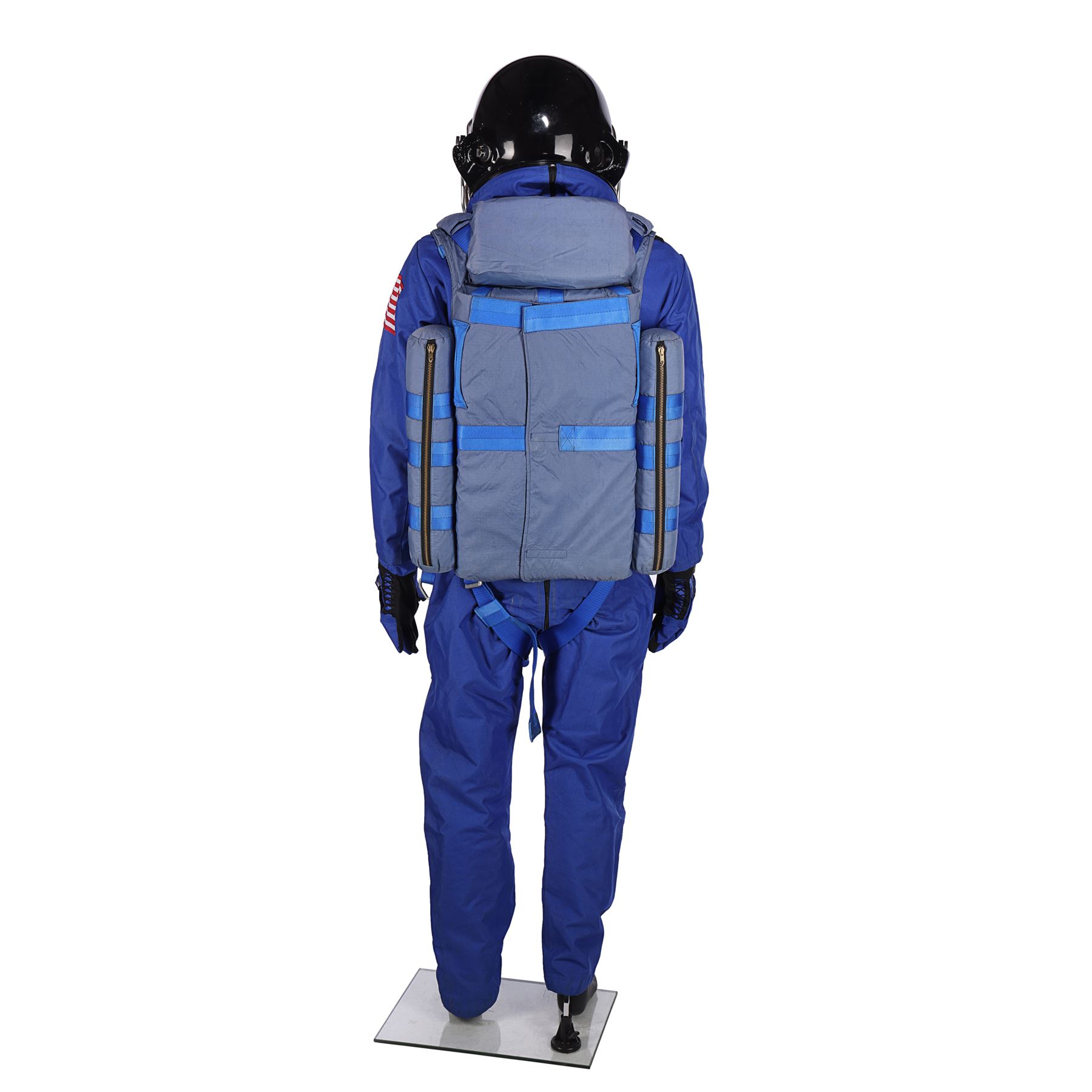The costume comprises a black fibreglass helmet featuring a wide, moveable acrylic visor; a blue canvas suit featuring multiple pockets and an attached black webbing harness; a separate plastic-and-metal cable with a pulley mechanism which goes around the neck; a pair of matching blue gloves; and a padded backpack.