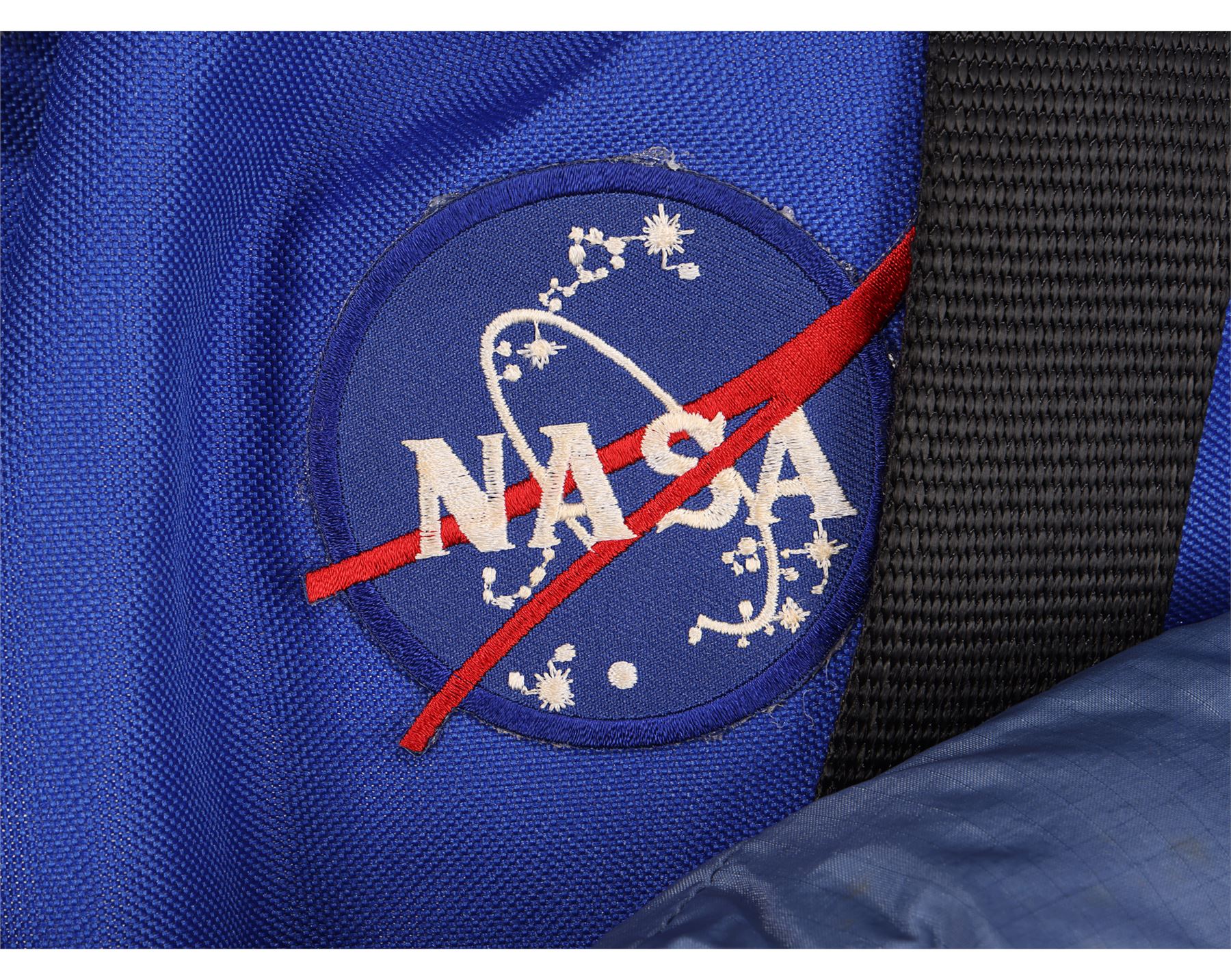 The front of the suit features a variety of intricate connector components, with an embroidered NASA patch on the chest and an American flag patch on one sleeve. A zip fastening runs down the back of the suit and around the front of the crotch, and a metal locking ring is incorporated around the neck, though the helmet does not lock into place on it. The backpack consists of internal foam pieces covered in Nylon fabric, with an additional attached harness.