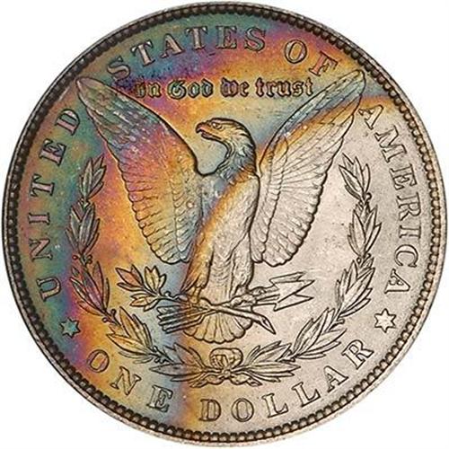 1887 Morgan Dollar. A small mark by Liberty's eyebrow. The reverse has wonderful rainbow crescent colors that are a real treat for the connoisseur of toned Morgan silver dollars. To say the least, this is a special coin! (#7172)<p><i>from The Battle Creek Collection, Part III</i>