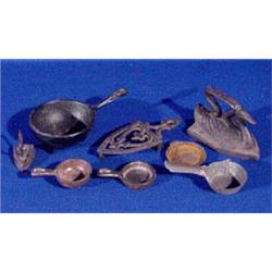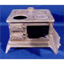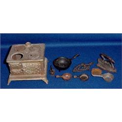 The store is embossed "Pearl" on the door. One of the covers is missing. Comes with goose shaped iron and trivet, a rare miniature sad iron and five misc. pans. American. Ca. 1880. Est. $40 - $60.