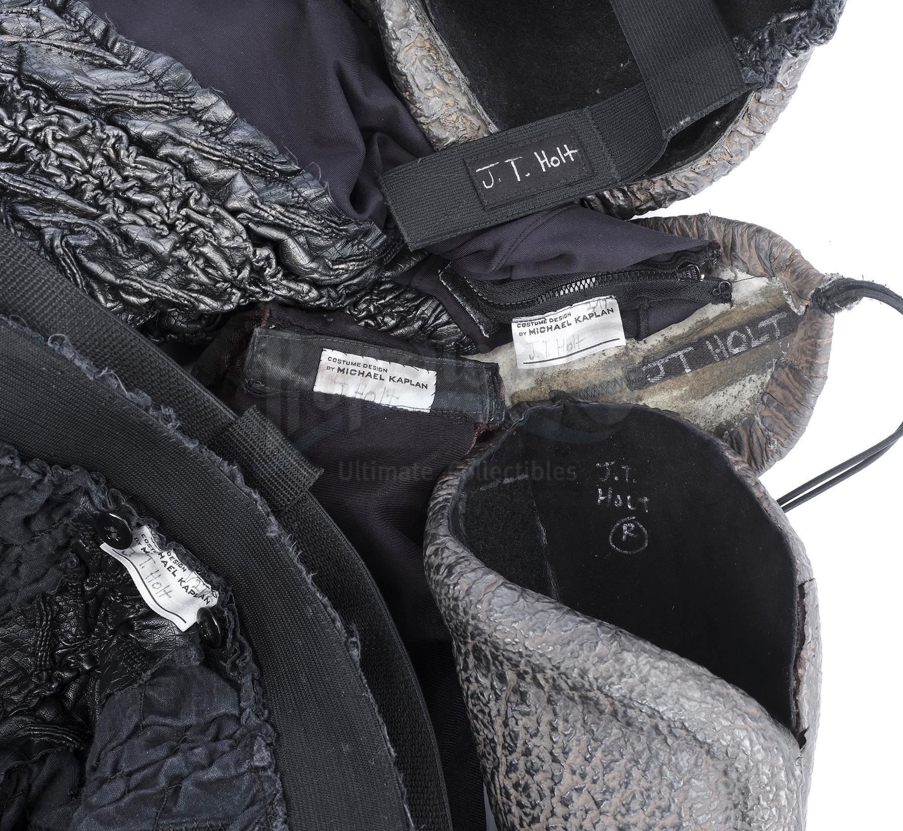 This lot will be auctioned on Tuesday, June 29th. The auction will begin at 9:00am PDT and lots are sold sequentially via live auctioneer; tune in to the live streaming broadcast on auction day to follow the pace. Note other lots in the auction may close on June 30th or July 1st. A Klingon guard uniform with a disruptor from JJ Abrams' sci-fi sequel Star Trek Into Darkness. Uniformed Klingon guards carried their disruptors when Khan (Benedict Cumberbatch) ambushed them on Kronos. This lot consists of a hand-painted silver and gray dense urethane Klingon helmet; scaled foam chest armor affixed with a Heart of Virtue; two gray foam shoulder guards; two matching thigh guards; two matching knee guards; two matching arm bracers, a matching codpiece; an elastic harness; a dark gray scarf; a long-sleeve leatherette and spandex shirt; a black spandex undershirt; leatherette and spandex pants; two black leather and suede gloves; and a ridged, gray Klingon disruptor hand-painted to appear metallic. It exhibits signs of use and wear throughout including some staining, but remains in good overall condition. Estimate: $7,000 - 9,000