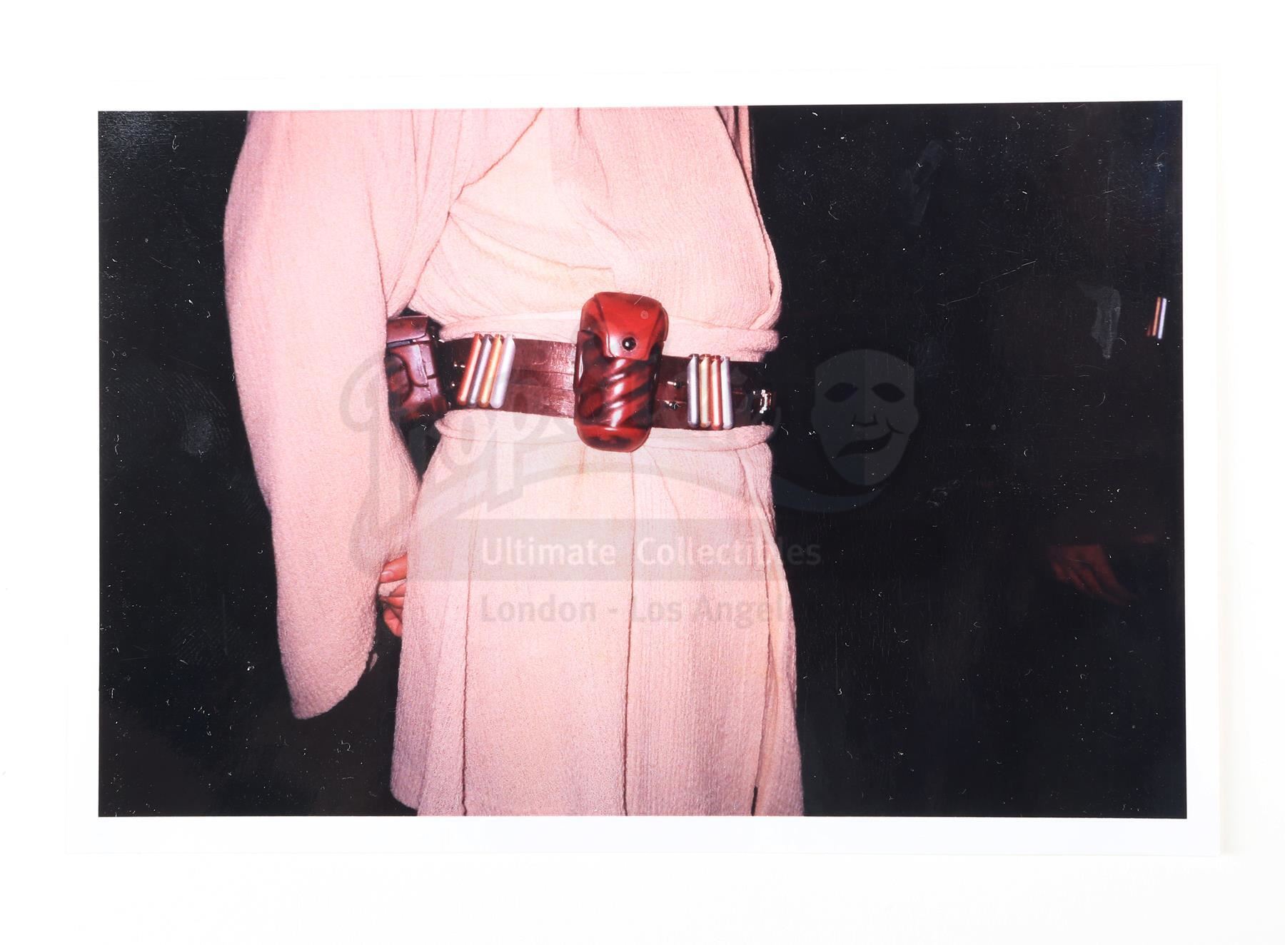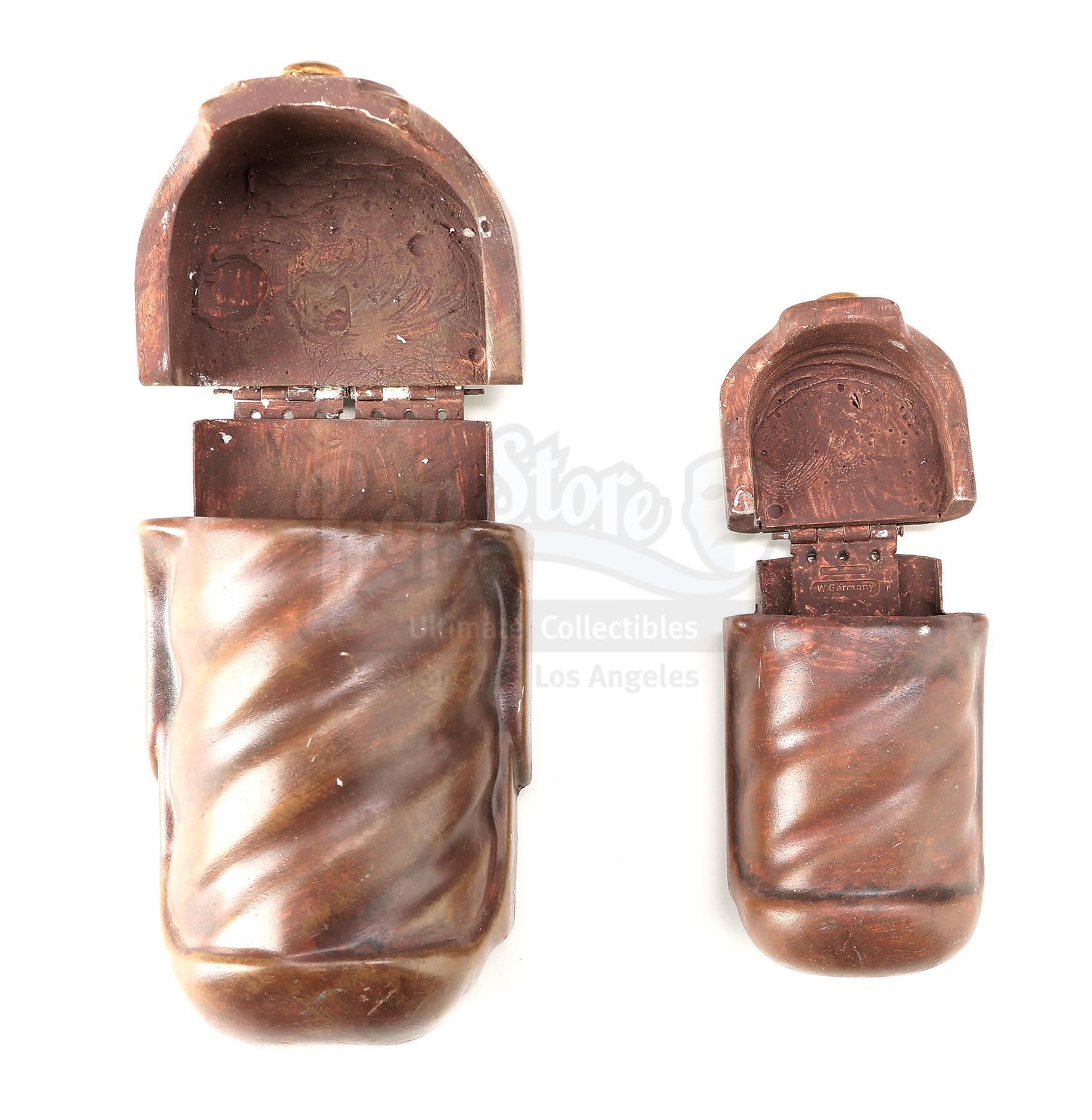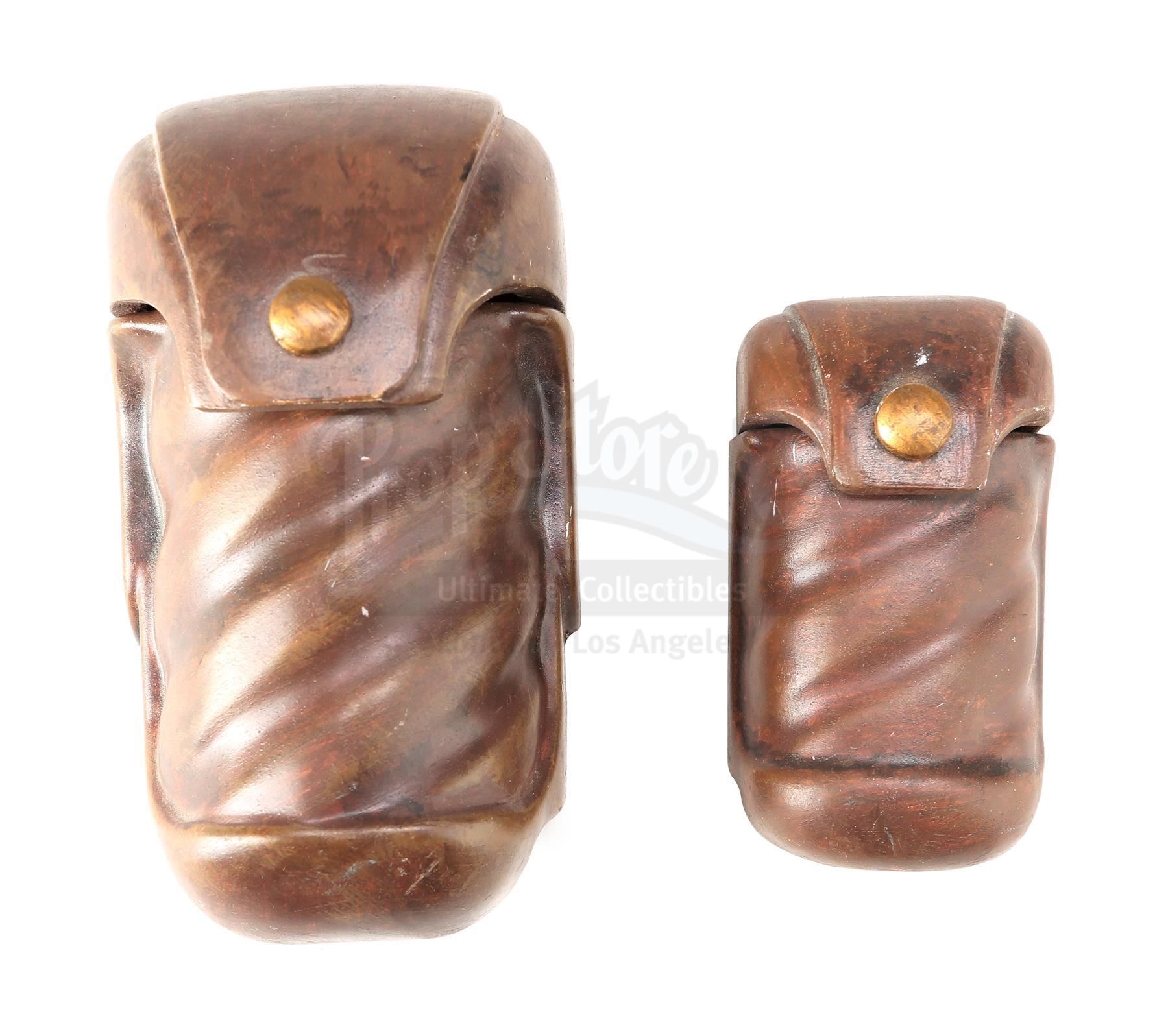 This lot will be auctioned on Tuesday, June 29th. The auction will begin at 9:00am PDT and lots are sold sequentially via live auctioneer; tune in to the live streaming broadcast on auction day to follow the pace. Note other lots in the auction may close on June 30th or July 1st. Obi-Wan Kenobi's (Ewan McGregor) opening belt pouches with a continuity photo from George Lucas' Star Wars: The Phantom Menace. Padawan Kenobi carried pouches containing food and accessories on his Jedi utility belt throughout the film. These belt pouches are made of resin with metal hinges and are hand-painted brown to resemble leather. The pouches also have a hole on the reverse side where a clip was attached to mount them on the belt. Included with the set is an original production photo featuring Kenobi's belt. The lot is in excellent overall condition with minor scuffs and paint wear throughout. Dimensions (pouches, each): 5" x 4" x 2" (12.75 cm x 10.25 cm x 5.25 cm); (photo): 5" x 3" (12.75 cm x 7.75 cm) Estimate: $2,000 - 3,000