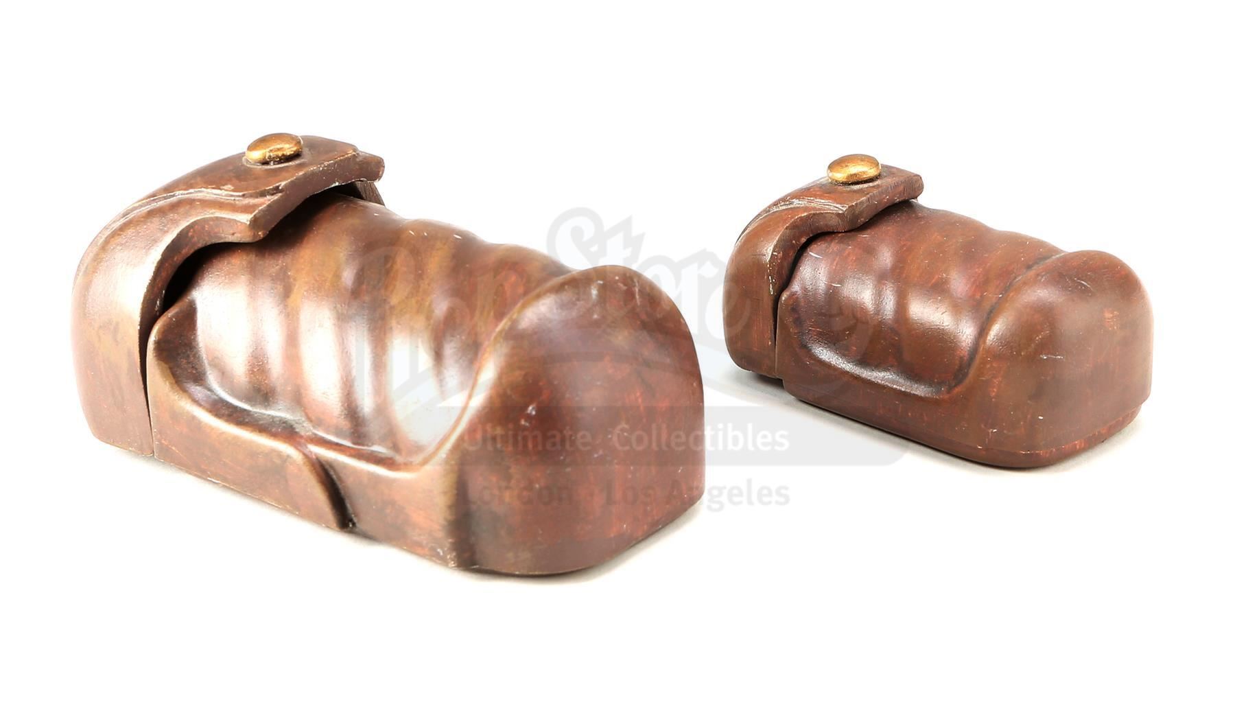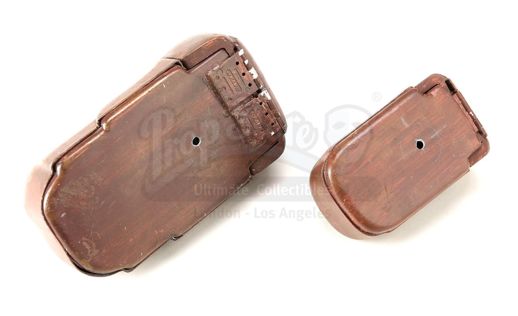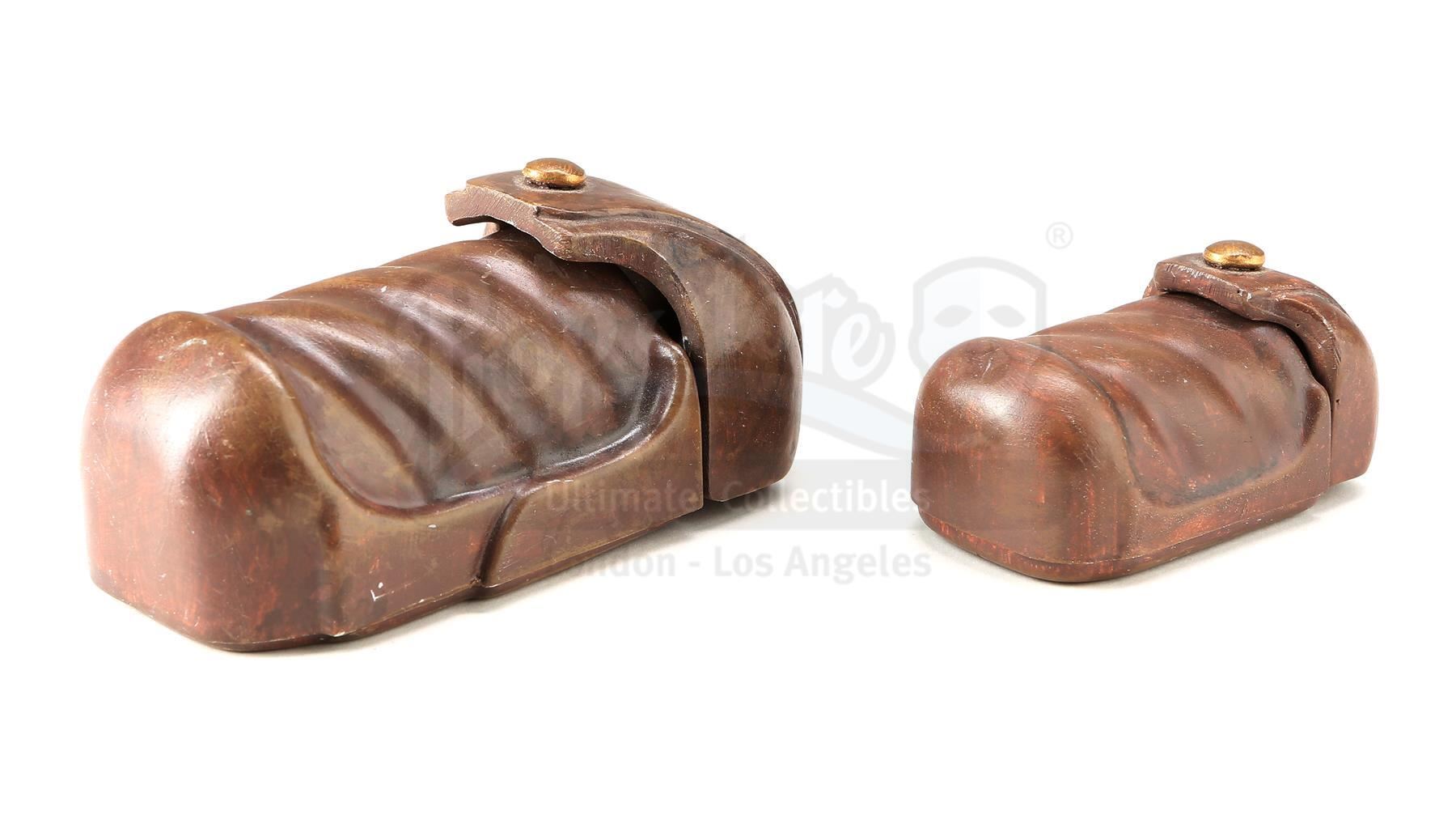 This lot will be auctioned on Tuesday, June 29th. The auction will begin at 9:00am PDT and lots are sold sequentially via live auctioneer; tune in to the live streaming broadcast on auction day to follow the pace. Note other lots in the auction may close on June 30th or July 1st. Obi-Wan Kenobi's (Ewan McGregor) opening belt pouches with a continuity photo from George Lucas' Star Wars: The Phantom Menace. Padawan Kenobi carried pouches containing food and accessories on his Jedi utility belt throughout the film. These belt pouches are made of resin with metal hinges and are hand-painted brown to resemble leather. The pouches also have a hole on the reverse side where a clip was attached to mount them on the belt. Included with the set is an original production photo featuring Kenobi's belt. The lot is in excellent overall condition with minor scuffs and paint wear throughout. Dimensions (pouches, each): 5" x 4" x 2" (12.75 cm x 10.25 cm x 5.25 cm); (photo): 5" x 3" (12.75 cm x 7.75 cm) Estimate: $2,000 - 3,000
