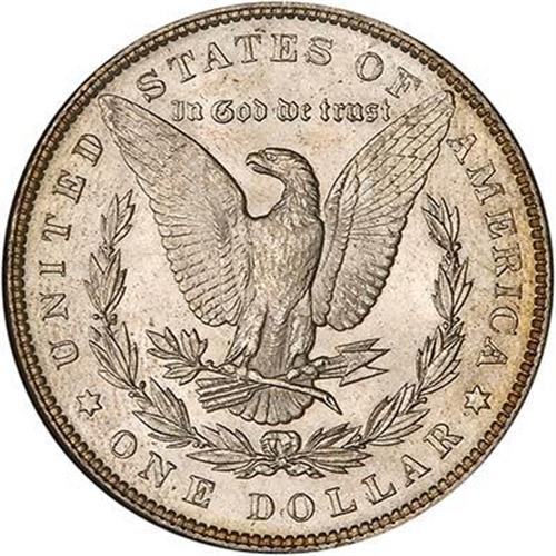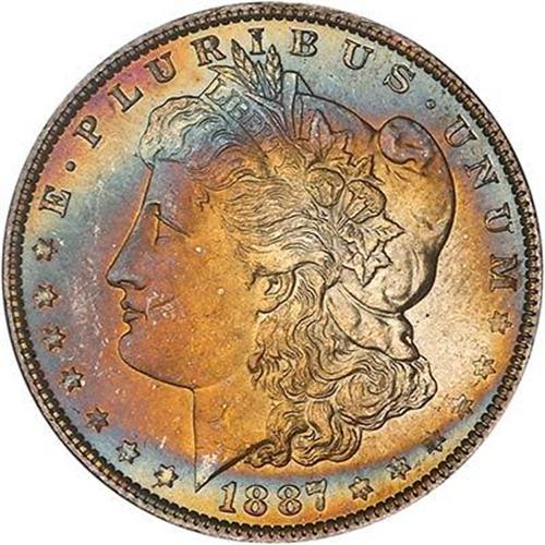 1887 Morgan Dollar. Annular, that is, rings of toning, from the loveliest baby blue iridescence to rose and then gold, with an area left silvery white somewhat off-center. A diminished impact was left by the blow of the (possibly worn) dies that struck this 1887, but only on the few fused hair strands over the ear; elsewhere, the devices are bold. (#7172)<p><i>from The Battle Creek Collection, Part III</i>