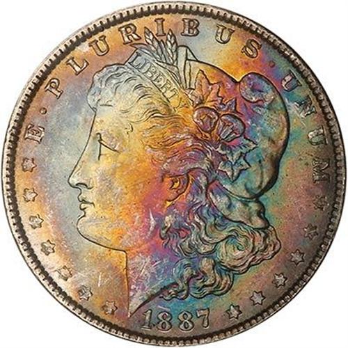 1887 Morgan Dollar. This coin, too, is graced with extremely beautiful, deep shades of toning, all of them shimmering under incandescent lighting, all of them coming together in a balanced way. (#7172)<p><i>from The Battle Creek Collection, Part III</i>