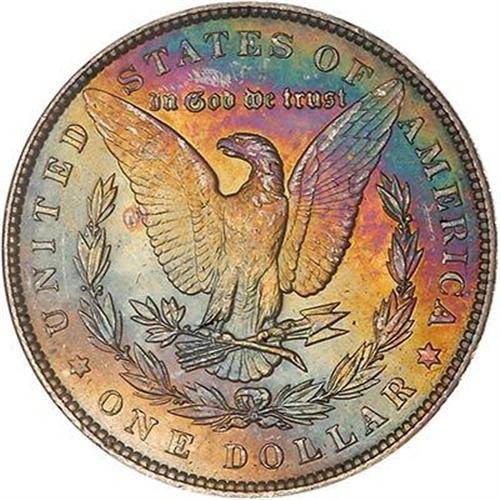 1887 Morgan Dollar. Magnificent bands of iridescent color across the reverse on the diagonal, with each hue resplendent and thoroughly original, as on all these marvelous Battle Creek coins! (#7172)<p><i>from The Battle Creek Collection, Part III</i>