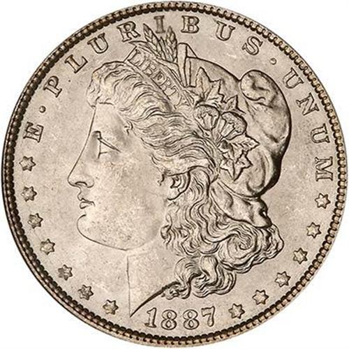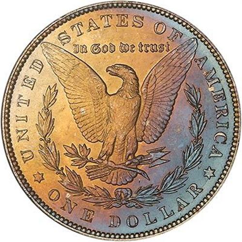 1887 Morgan Dollar. Warm gold and amber deepens to sunset purple then the loveliest sky blue sheen of late dusk. As marvelous to describe as it is to view. (#7172)<p><i>from The Battle Creek Collection, Part III</i>