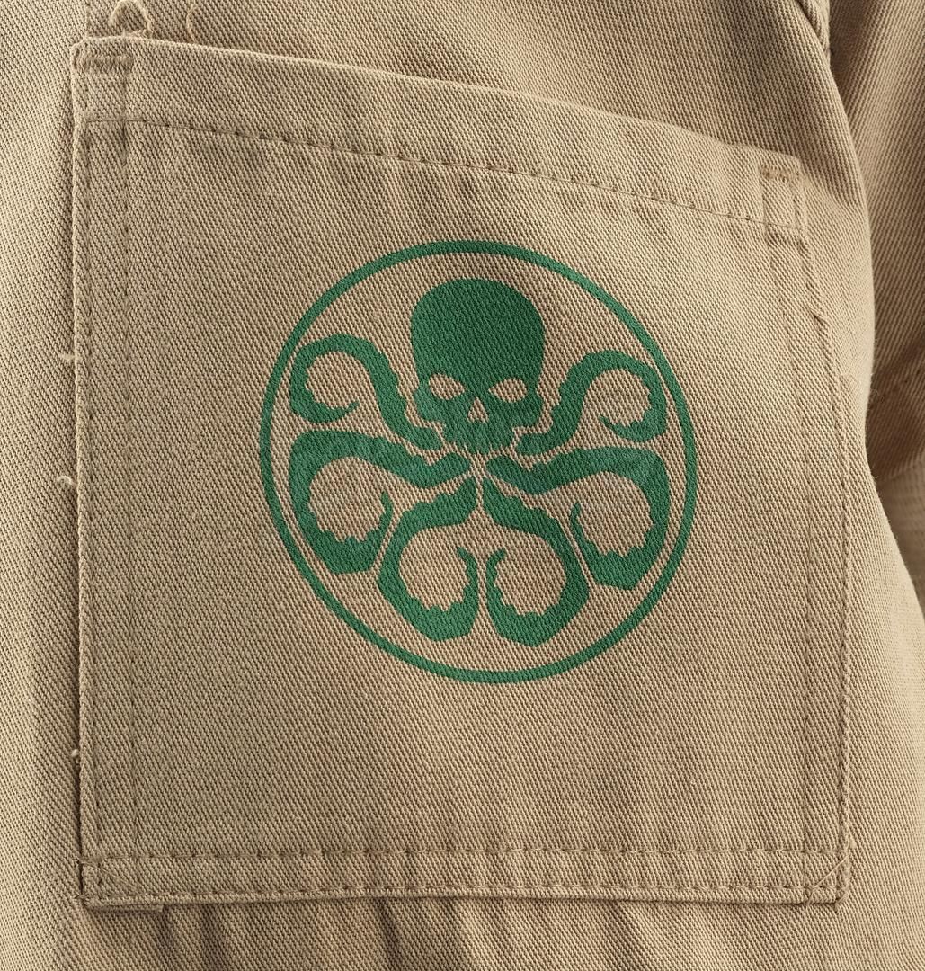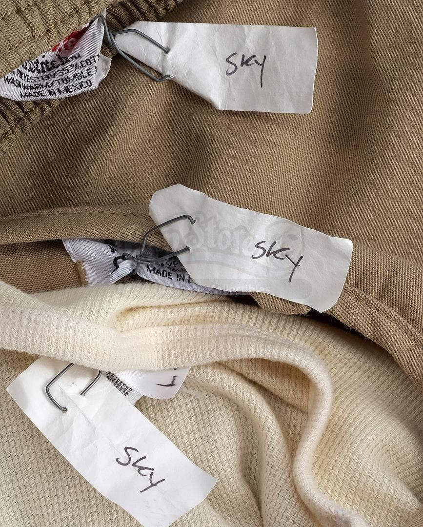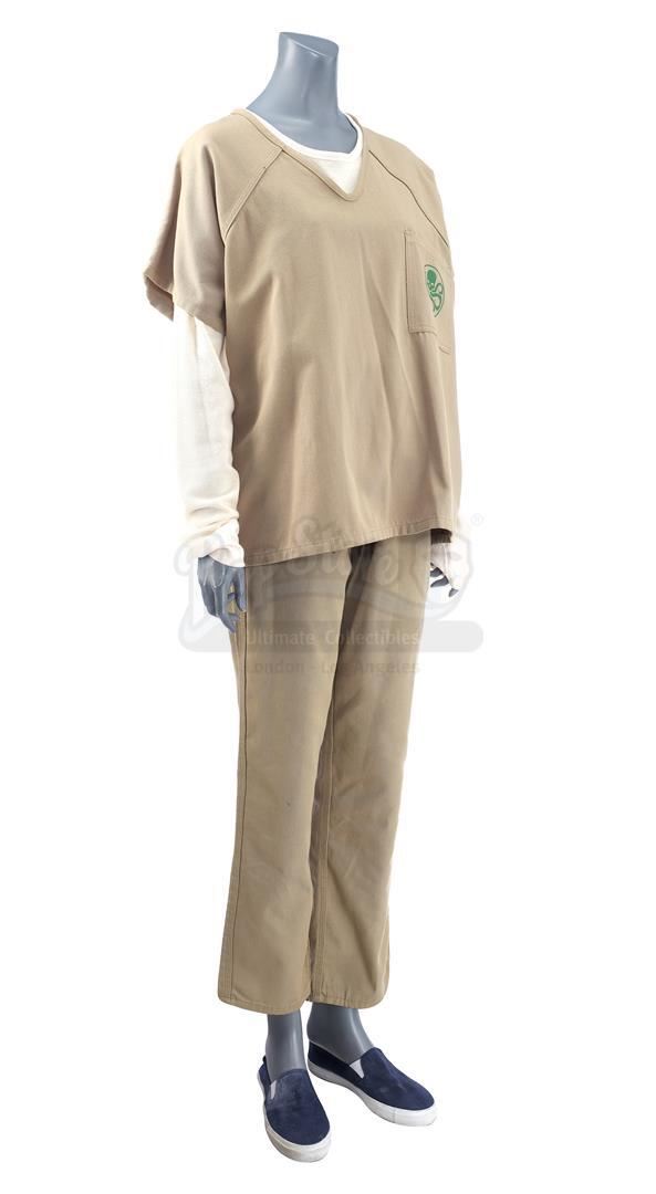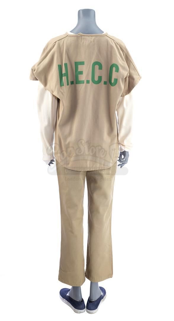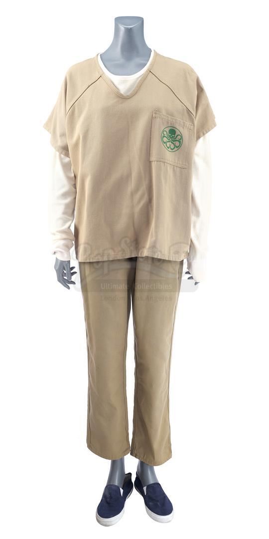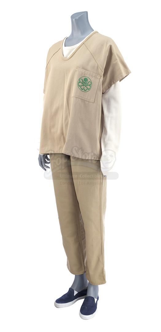 Daisy Johnson's partial Hydra prisoner costume from the episode 'No Regrets' (418) of Marvel's Agents of S.H.I.E.L.D. In the episode, Johnson, known in the press as Quake, is captured as a traitor and held in a 'Hydra Enlightenment Cultivation Center' during a Framework simulation. This costume, created by production but ultimately unused on-screen, consists of a light beige cotton uniform shirt with a green Hydra logo and 'H.E.C.C.' emblazoned on the back, a matching pair of pants, and a cream-color cotton long-sleeved undershirt. The costume is in excellent overall condition with minor signs of wear from production.