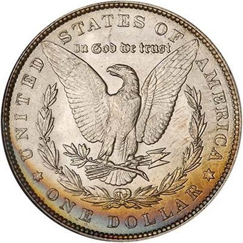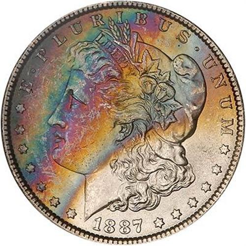 1887 Morgan Dollar. The advantage of seeing so many remarkable rainbow coins close-up is that one gets a full apprecation of their variability and impact on the eye. This has diagonal bands of color across the obverse, leaving the reverse snowy white except along the lower margin where gold and pale blue seem to have played hookey and sneaked out of the classroom to the "forbidden side." (#7172)<p><i>from The Battle Creek Collection, Part III</i>