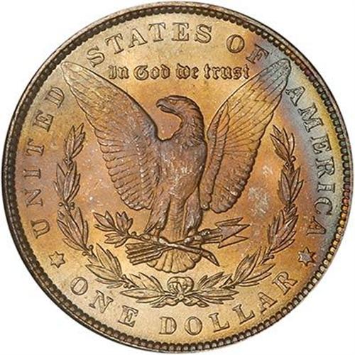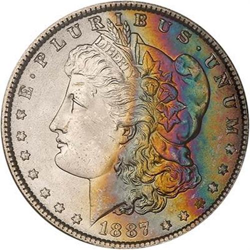 1887 Morgan Dollar. The toning is tastefully confined to the right half of the obverse in varying shades of bright colors, while the left side is mostly silvery to pale blue. (#7172)<p><i>from The Battle Creek Collection, Part III</i>