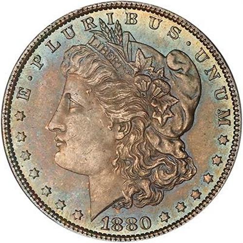 1880 Morgan Dollar. The hallmark of a well struck coin is this handsome toned MS64 with its full mint frost underlying original surfaces. (#7096)