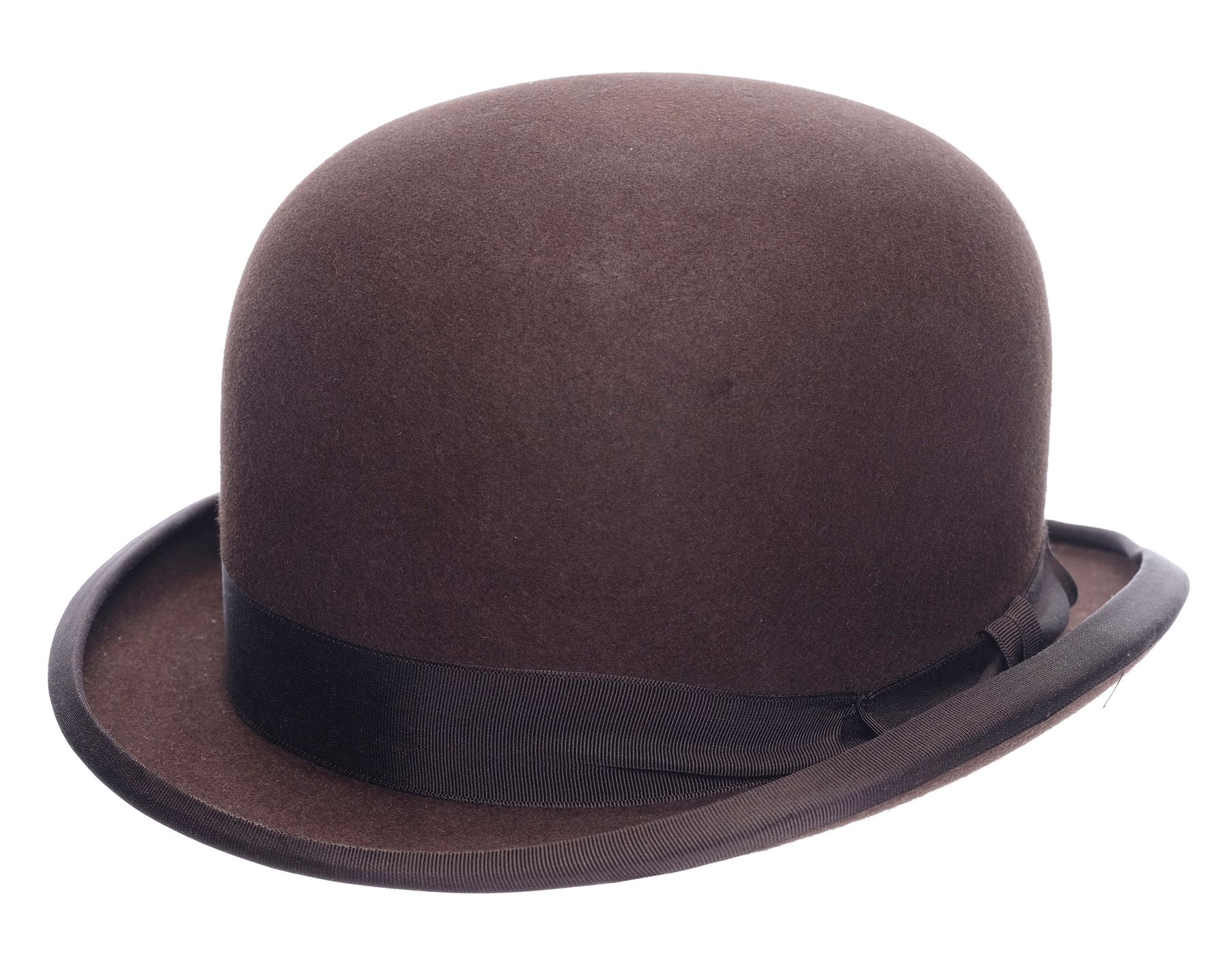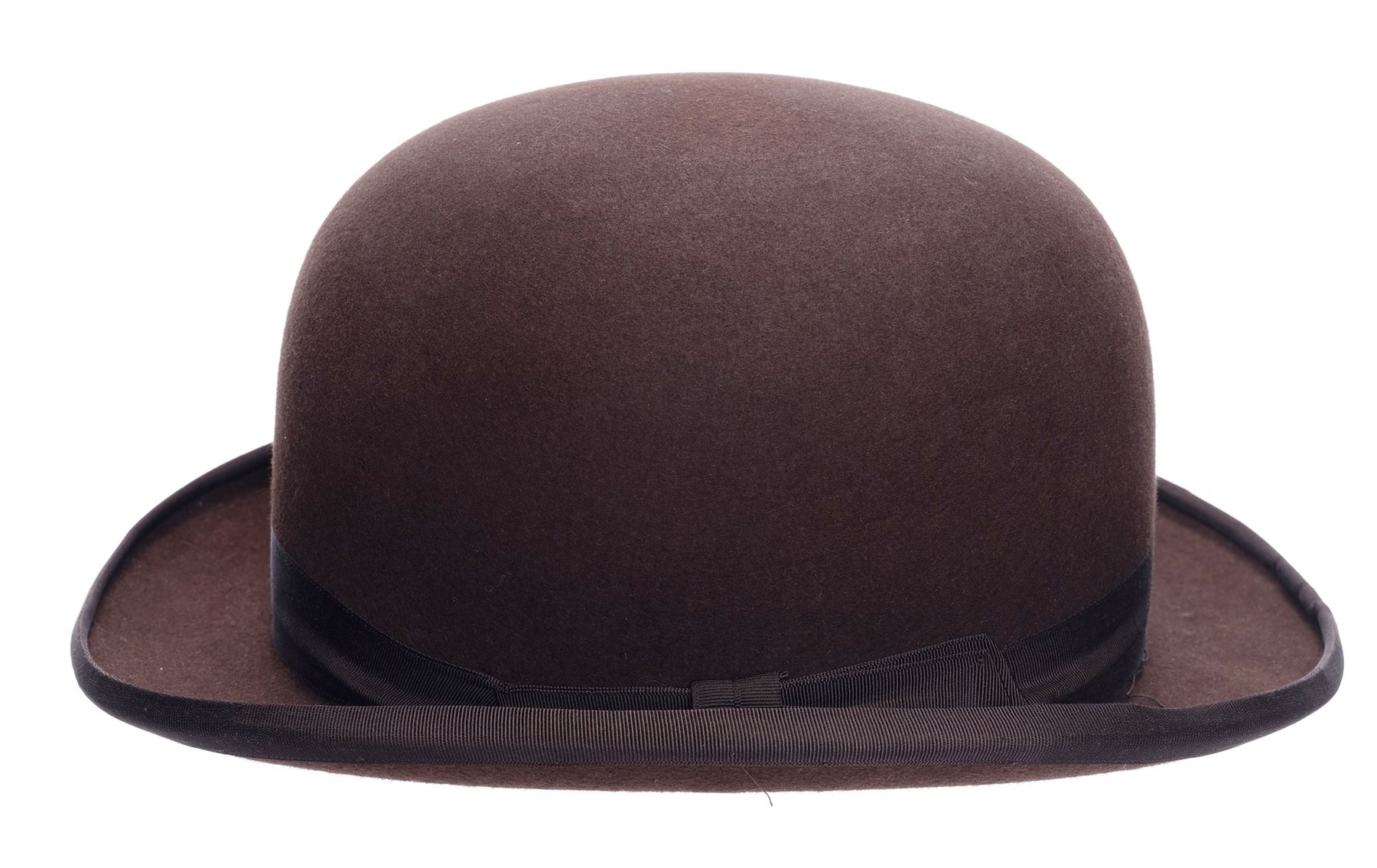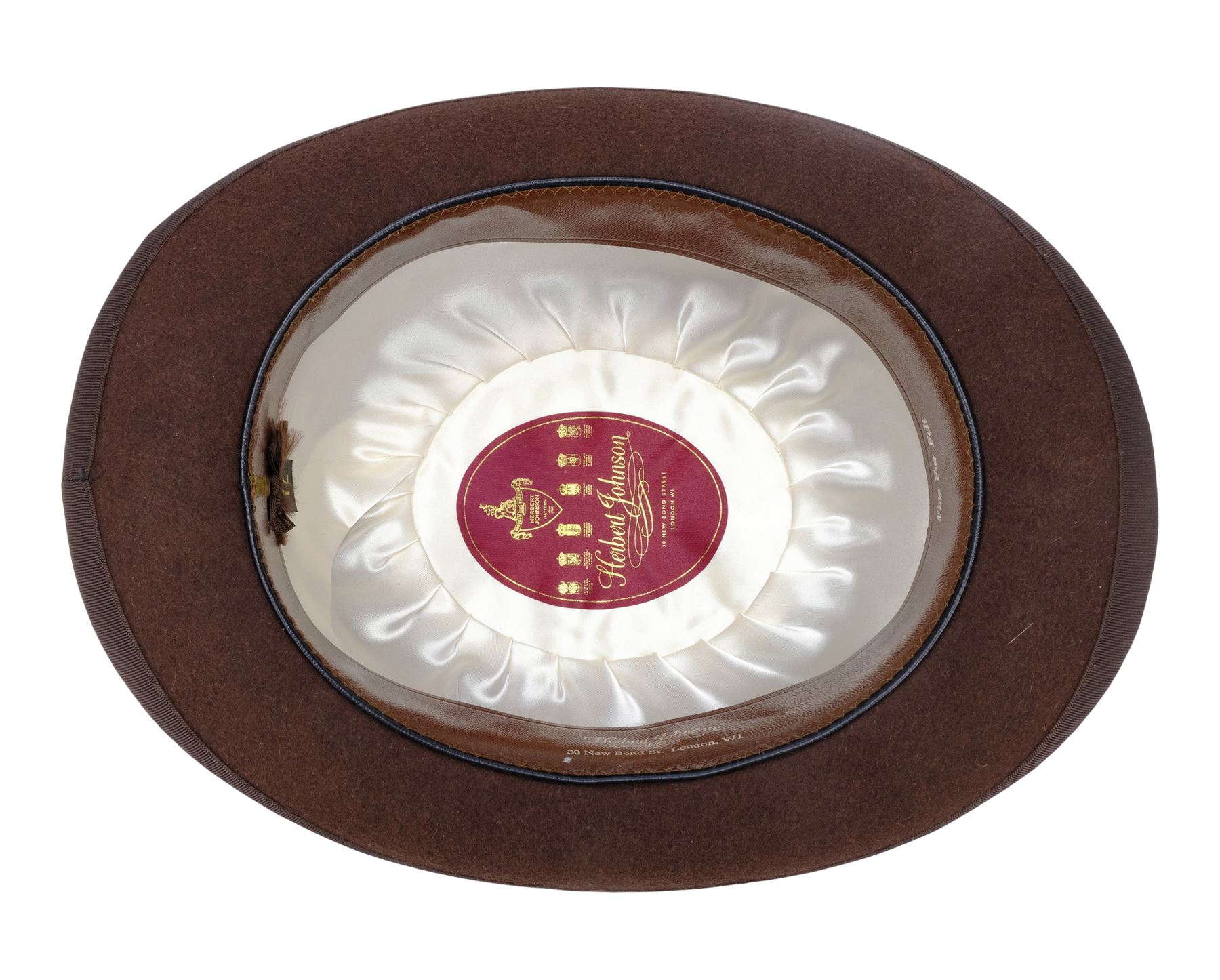 This brown fine fur felt bowler hat custom-made by Herbert Johnson Hatters of London was originally given by Macnee to the Michael Bolton Foundation for a charity auction, and features a brown ribbon band, white silk lining, and a brown leather sweatband along with Herbert Johnson labels and a size tag labelled "7 1/8 58." Also included is a black-and-white photograph of Macnee autographed by the actor in blue ink and inscribed with a note to the Michael Bolton Foundation. The sweatband bow exhibits fraying. Dimensions: (photograph) 40.75 cm x 28 cm (16" x 11")