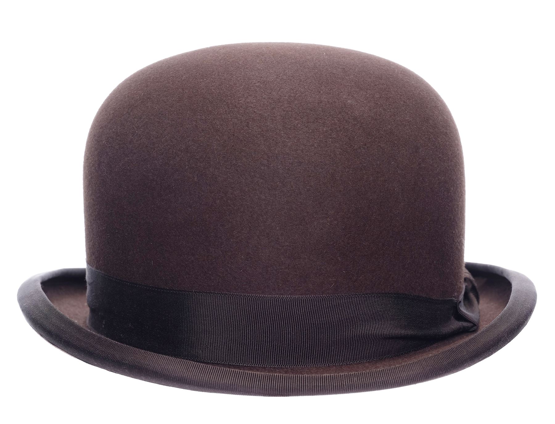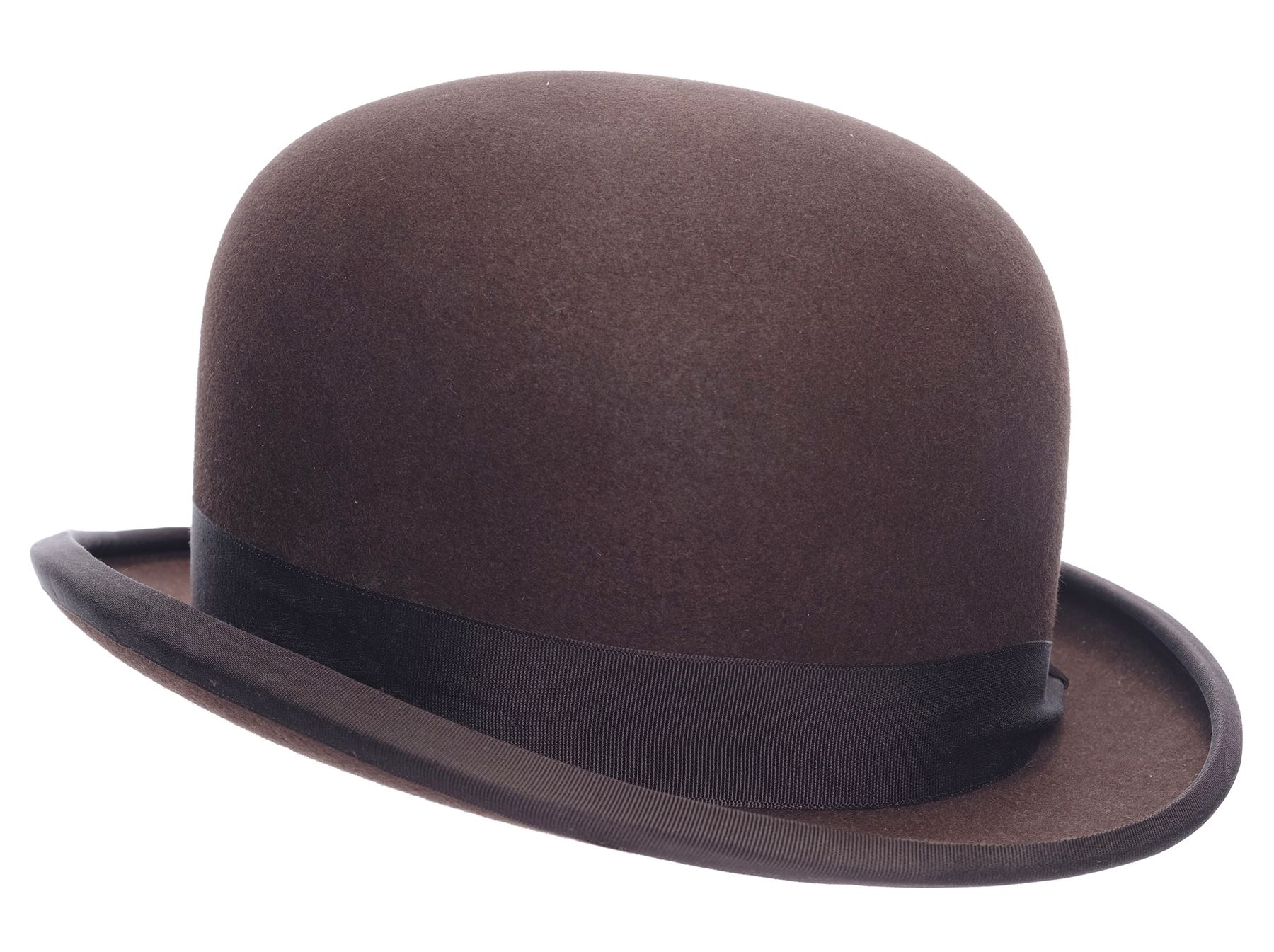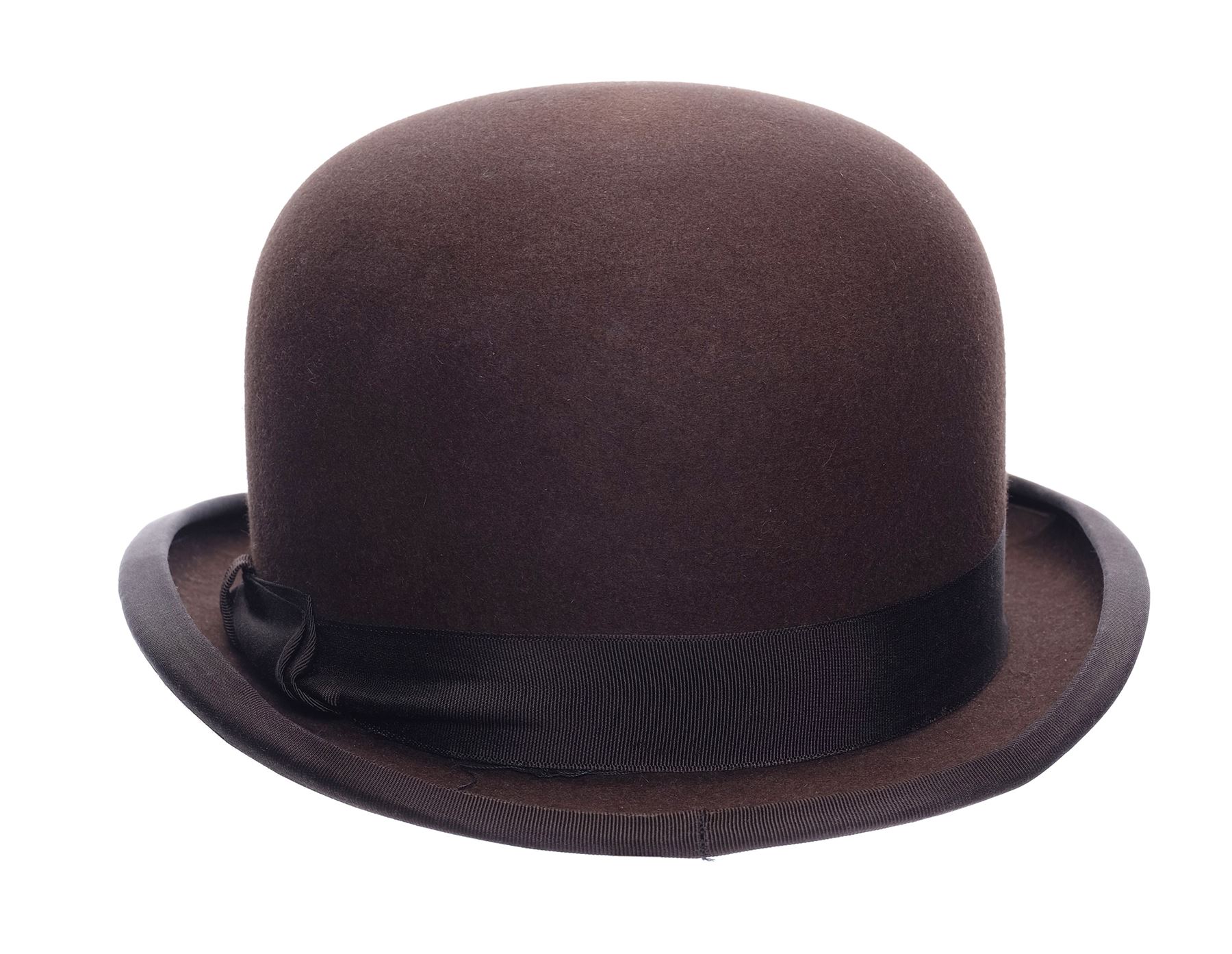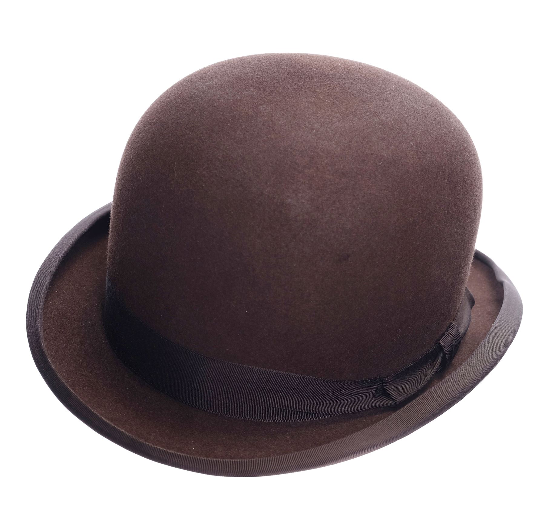 This brown fine fur felt bowler hat custom-made by Herbert Johnson Hatters of London was originally given by Macnee to the Michael Bolton Foundation for a charity auction, and features a brown ribbon band, white silk lining, and a brown leather sweatband along with Herbert Johnson labels and a size tag labelled "7 1/8 58." Also included is a black-and-white photograph of Macnee autographed by the actor in blue ink and inscribed with a note to the Michael Bolton Foundation. The sweatband bow exhibits fraying. Dimensions: (photograph) 40.75 cm x 28 cm (16" x 11")