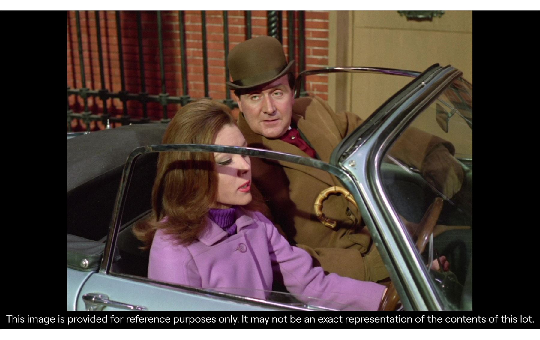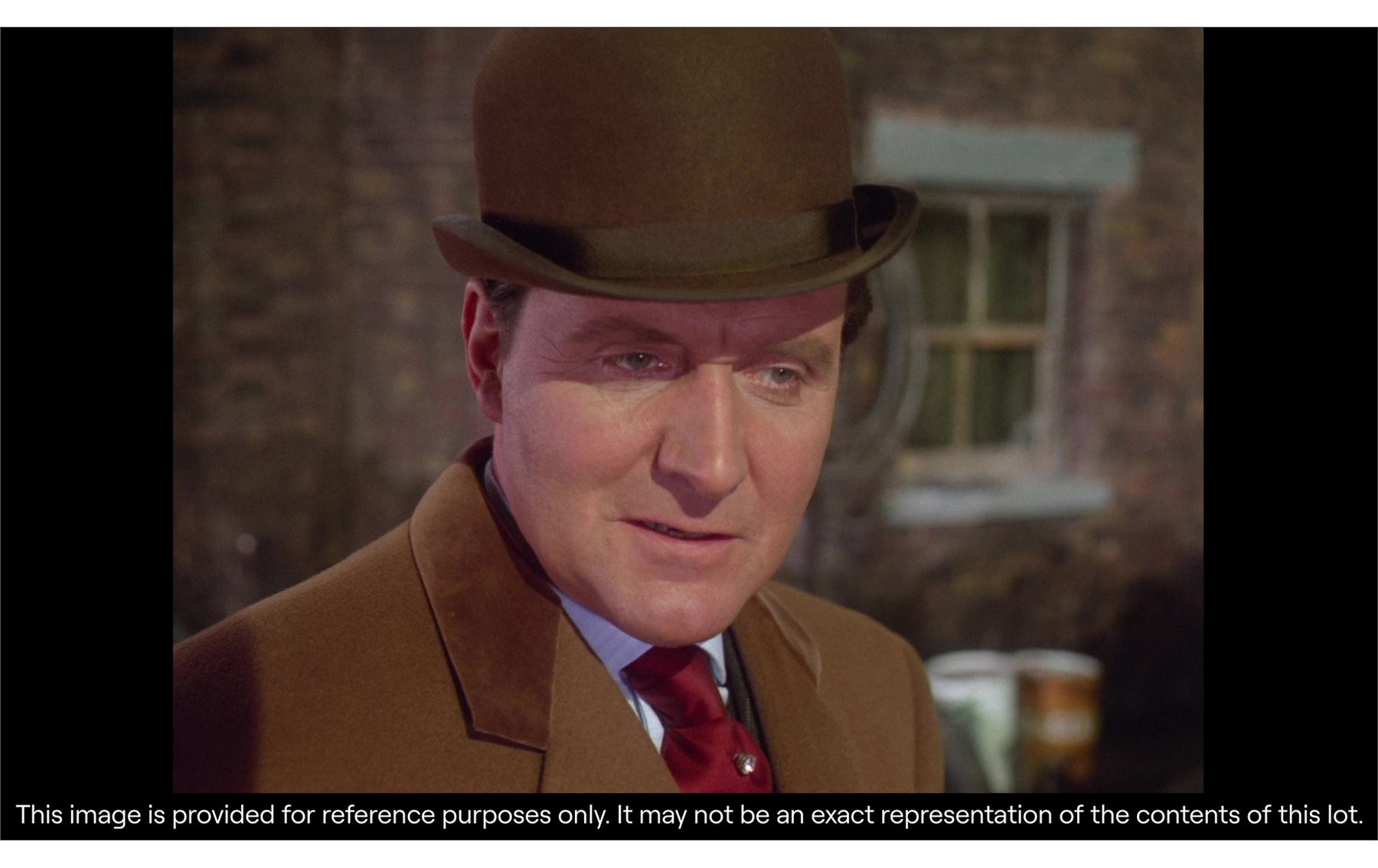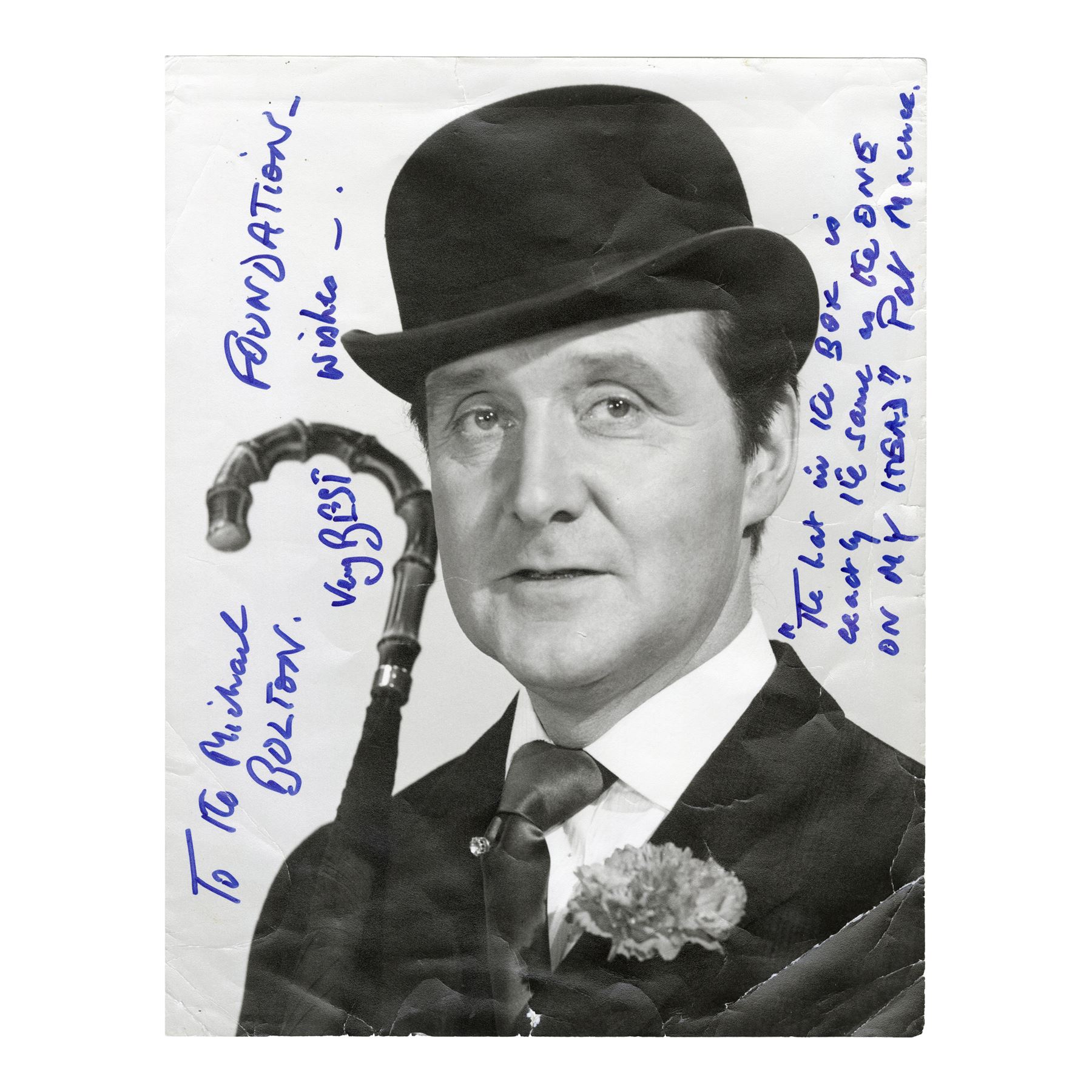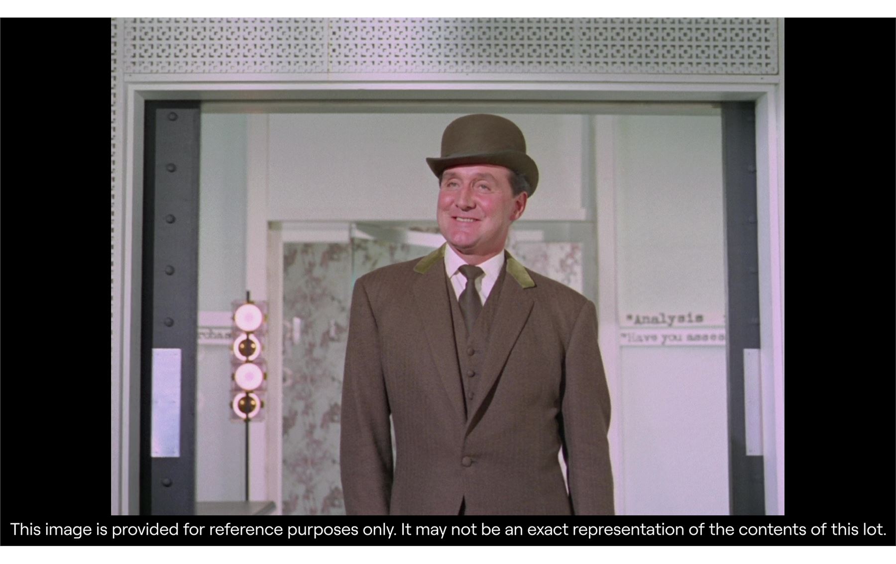 John Steed's (Patrick Macnee) bowler hat from Sydney Newman's series The Avengers with a photo autographed by Macnee. Secret agent Steed wore his signature bowler hat in various colours throughout the series as part of his signature suit. The series gained a cult following, airing in over 90 countries by the end of its run, and launched a sequel series, a radio series, novels, comics, and more.