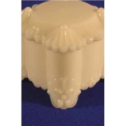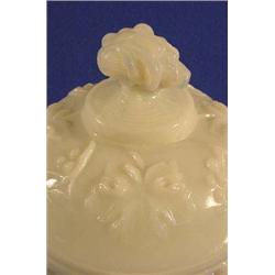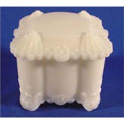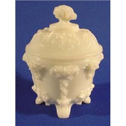 Two (2) Milk Glass Covered Jars. The first in a vintage pattern with raised grapes, vines, and leaves. In opaque grayish/white. Marked "Portieux". 5.5"t x 4"dia. Along with a white milk glass covered jar of square form with shell corners. 3.5"sq. 3"t. Both 20th c. Est. $100 - $200.