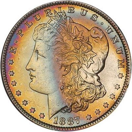 1887 Morgan Dollar. Whether you are a big man with a big neanderthal lower jaw or one whose facial features are more subtle, your lower jaw will drop away all the same at the sight of this handsomely toned specimen of the 1887 issue. Not that it upstages the others in the collection, but because it is so nicely balanced in its composition, so well made and preserved. (#7172)<p><i>from The Battle Creek Collection, Part III</i>