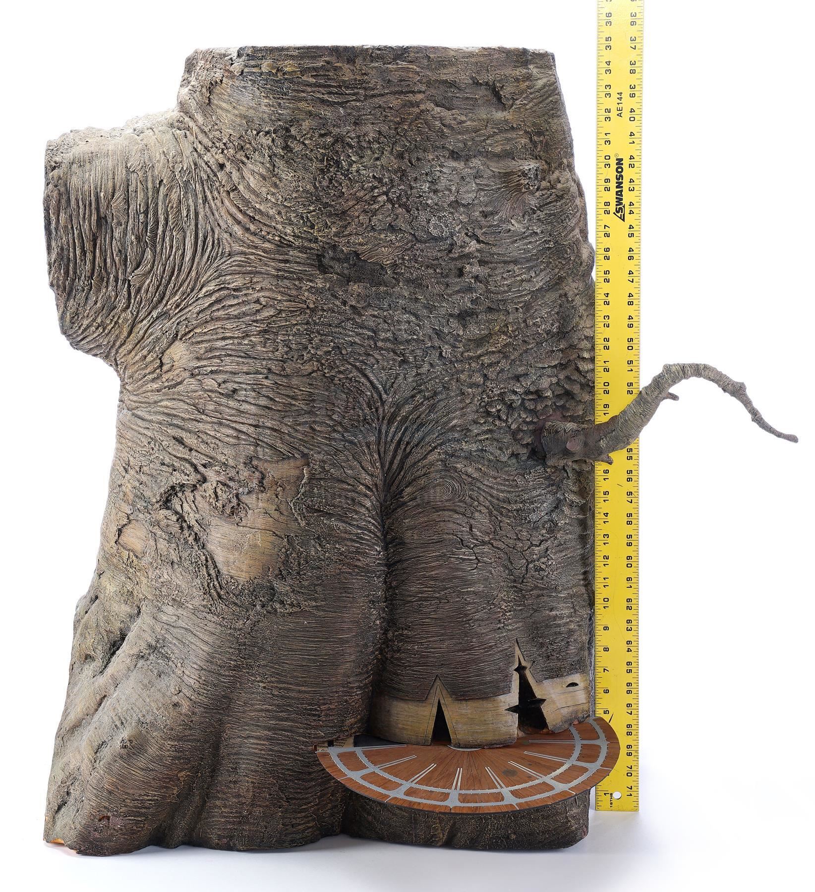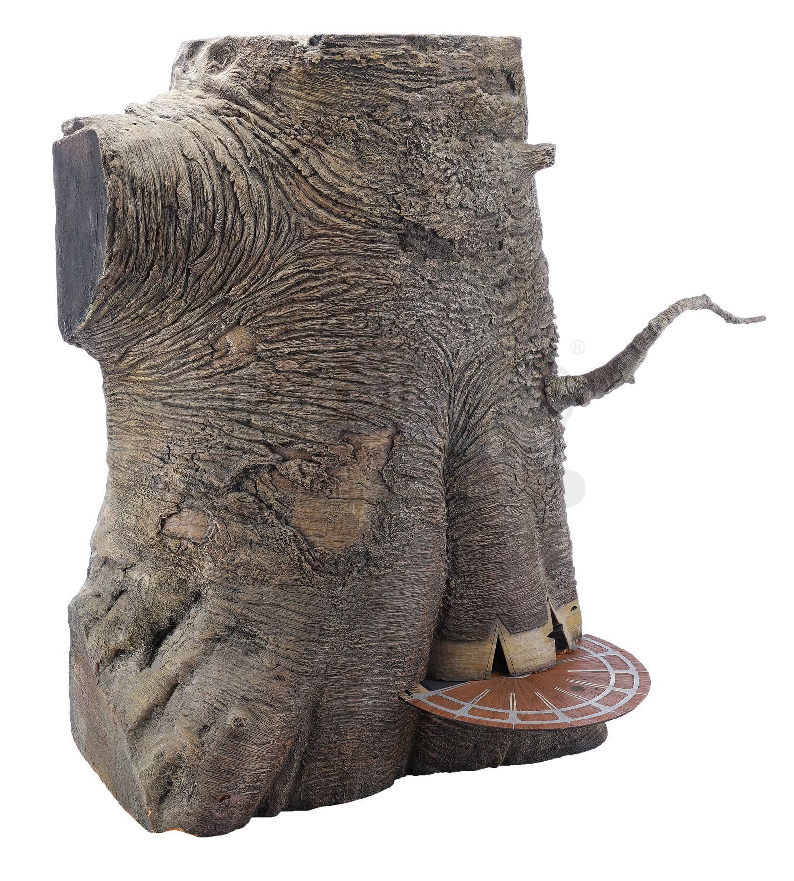 This lot will be auctioned on Tuesday, June 29th. The auction will begin at 9:00am PDT and lots are sold sequentially via live auctioneer; tune in to the live streaming broadcast on auction day to follow the pace. Note other lots in the auction may close on June 30th or July 1st. A Kashyyyk tree landing pad texture model miniature from George Lucas' Star Wars: Revenge of the Sith. Yoda (Frank Oz) flew to Kashyyyk-a forest planet with landing pads in giant trees-to help the Wookiees fend off invading Separatist forces. This model miniature was created by Industrial Light & Magic (ILM) to help the visual effects teams establish the palimpsested look of the sacred trees, with a focus on their unique bark texture. The invasion sequence was then created with a combination of live-action photography, computer effects, and additional models. This ornate miniature is constructed of hand-painted and textured foam composite with wood and metal components, including a thin landing pad partially painted to appear wooden. The back of the tree is also unpainted. It remains in good overall condition with a slash on the back and various scuffs and chips to the foam from production and age. Dimensions: 25" x 19" x 36" (63.5 cm x 48.5 cm x 91.5 cm) Estimate: $5,000 - 7,000