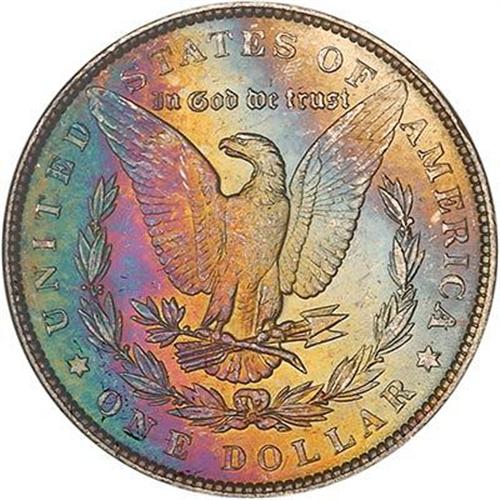 1887 Morgan Dollar. A typical 1887 silver dollar? Don't you believe it. While the obverse is pretty much white save for a band of toning at the rim, the reverse is anything but typical with its gorgeous display of rainbow colors! If you hear murmuring in the background when bidding takes place, you'll want to refocus all concentration on the matter at hand, or the coin will be bid out from under you. (#7172)<p><i>from The Battle Creek Collection, Part III</i>