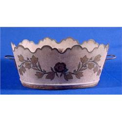 Paint Decorated French 2-Handled Metal Planter. Oval planter with deeply scalloped rim, wire handle applied at each end, cream colored body with brown spotting, decorated with flowers and vines. Marked on underside "Made in France", Ca. 1920. Paint loss to bottom with slight rust. 12"l w/handles x 7.25"w x 4.5"t. Est. $100 - $200.