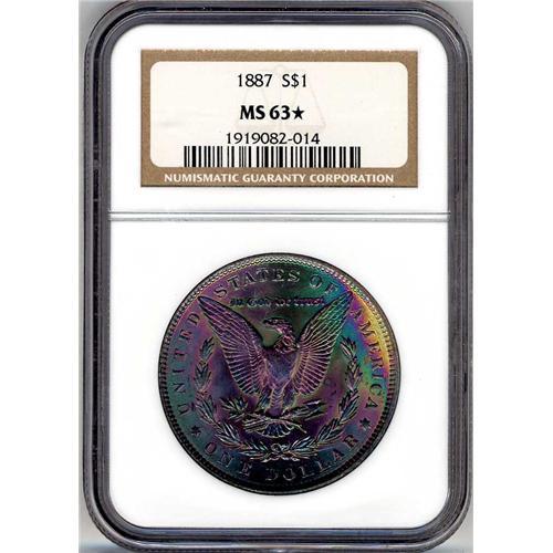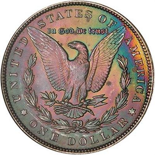 1887 Morgan Dollar. Magnificently toned reverse. Here we see purple blending into aquamarine, a radiant combination of colors -- woe to the collector whose vision is impaired and cannot make out pretty hues as Nature intended them to appear! (#7172)