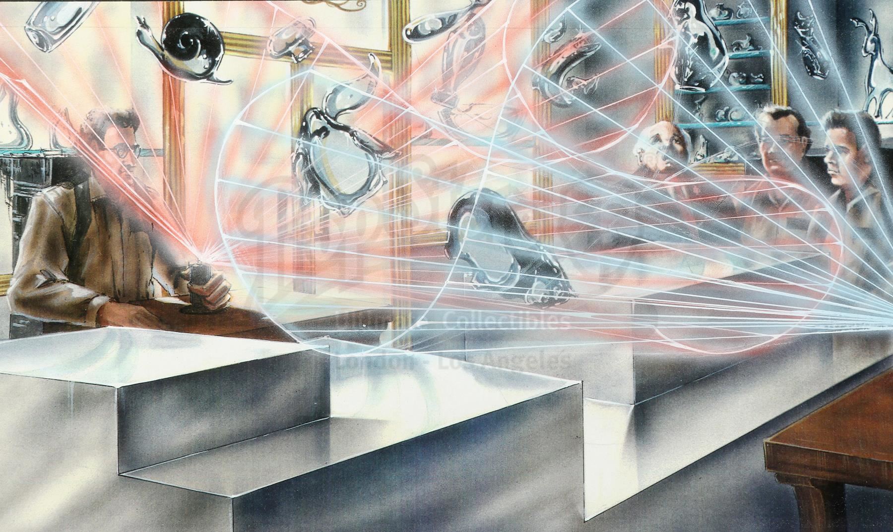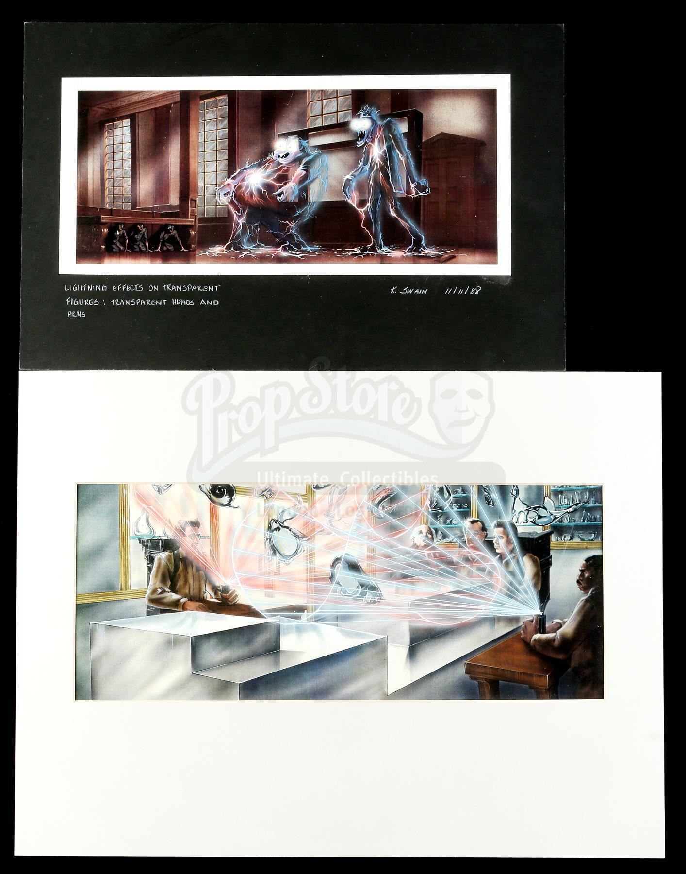 These concept illustrations were rendered in mixed media by Industrial Light & Magic (ILM) concept artist Kathleen Swain, then photocopied and the copies affixed to poster board. From there, the colorful energy beams, ghostly Scoleri brothers, and other special lighting effects were carefully hand-painted onto the prints. One is hand-labeled "LIGHTNING EFFECTS ON TRANSPARENT FIGURES: TRANSPARENT HEADS AND ARMS" and dated "11/11/88". The pair is in excellent overall condition with minor signs of age and handling. Â