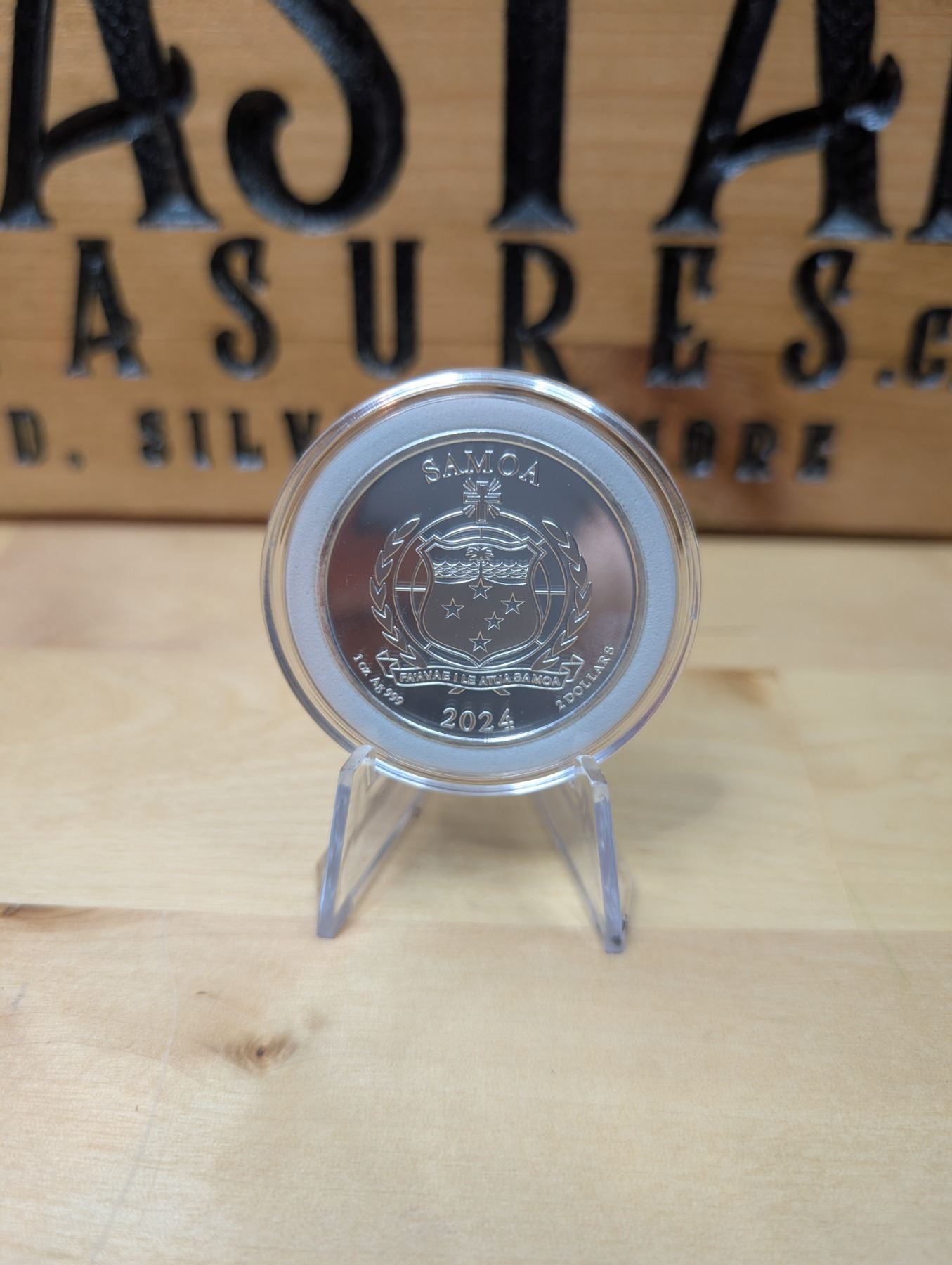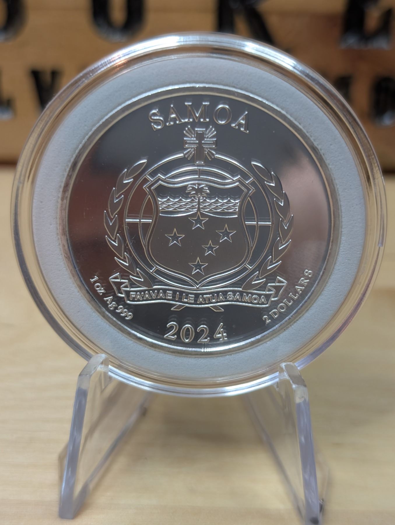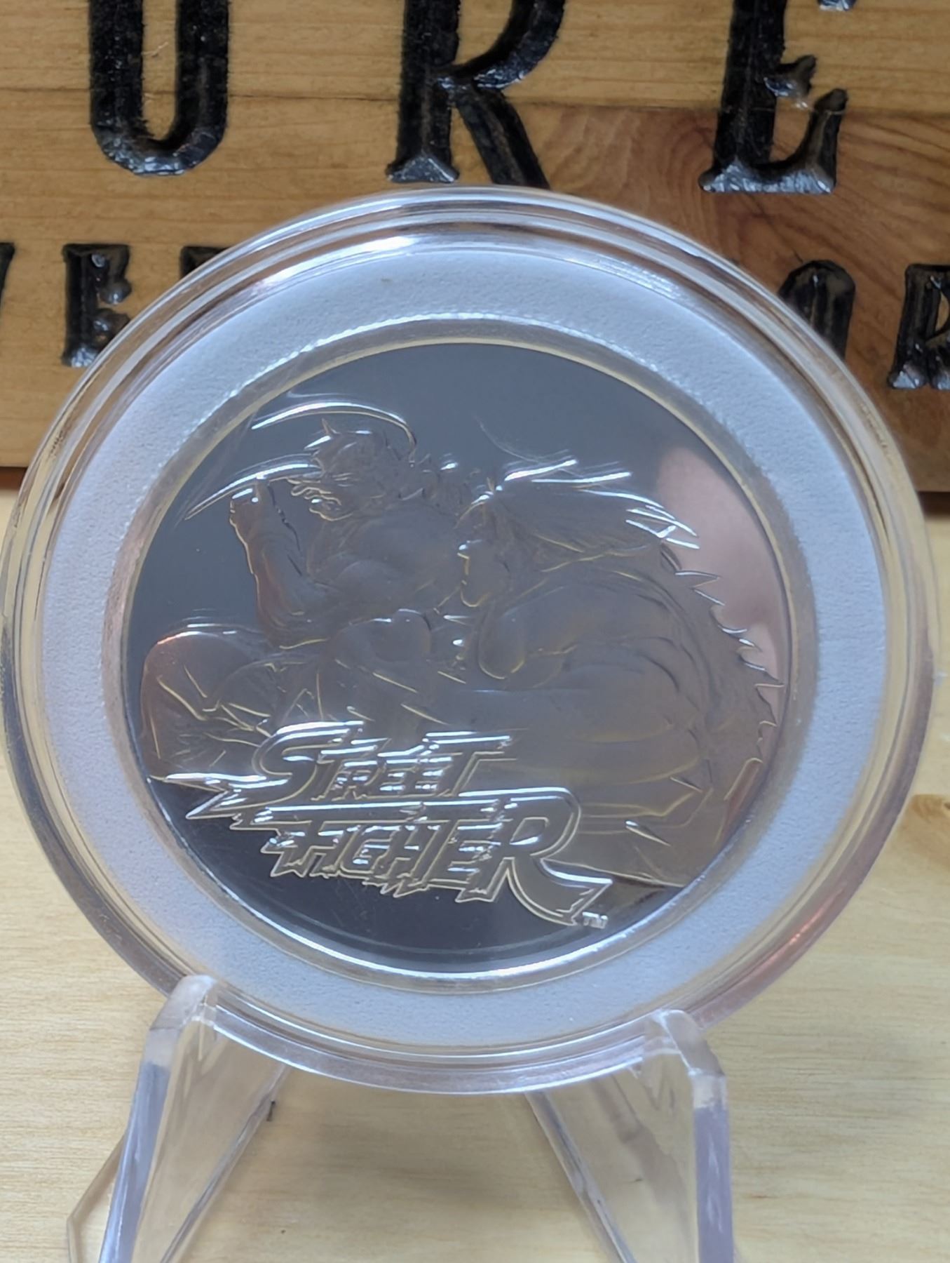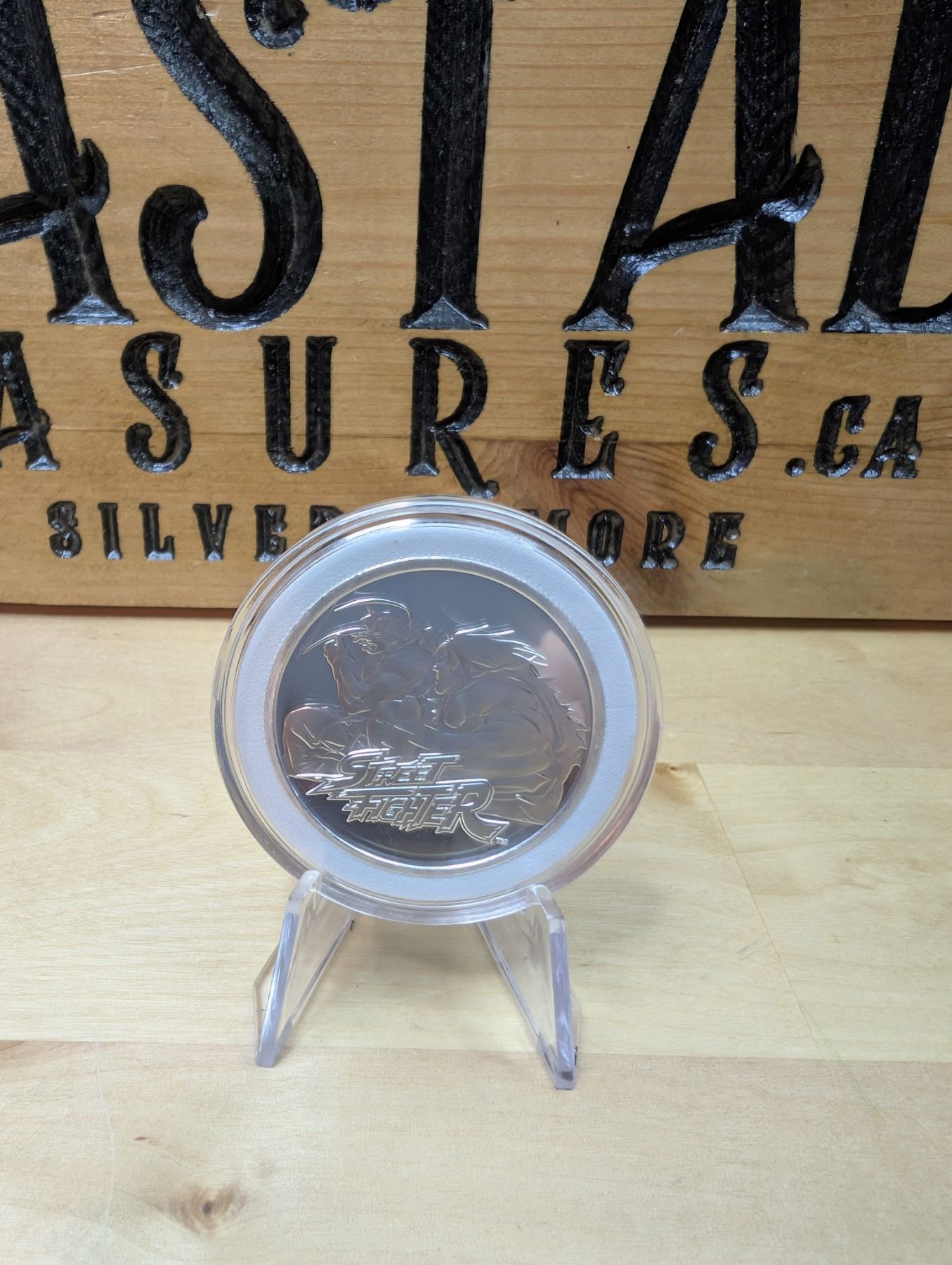 The 1 oz Samoa Street Fighter 2024 Silver Coin is a collectible silver coin issued by Samoa in 2024. It contains 1 ounce of .999 fine silver and features iconic characters from the popular Street Fighter video game series, such as Ryu, Chun-Li, or Ken. The design typically showcases dynamic action poses or scenes inspired by the game, celebrating the legacy of Street Fighter in both gaming and pop culture. As legal tender in Samoa, the coin is valued for its silver content and its appeal to both gaming fans and coin collectors.