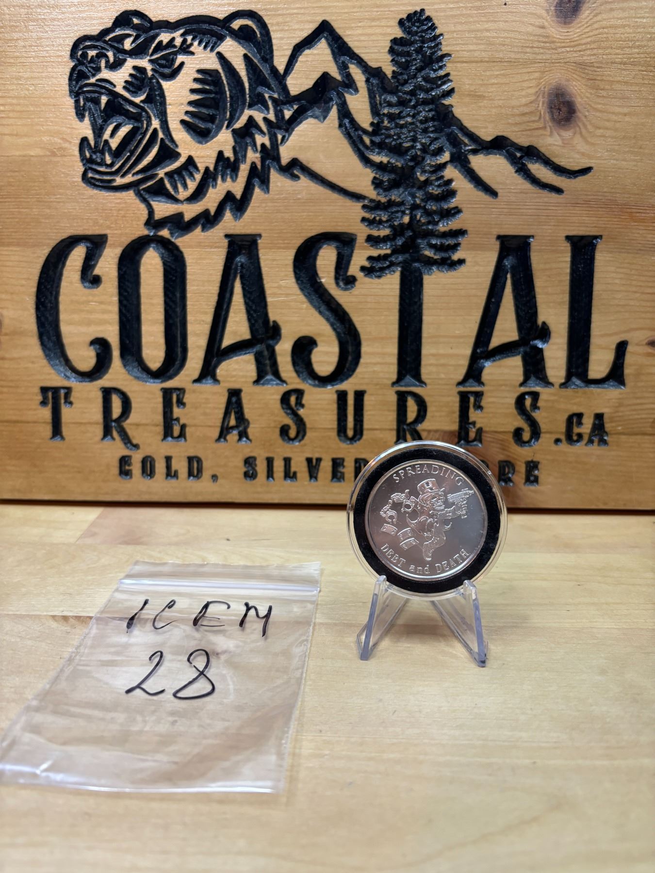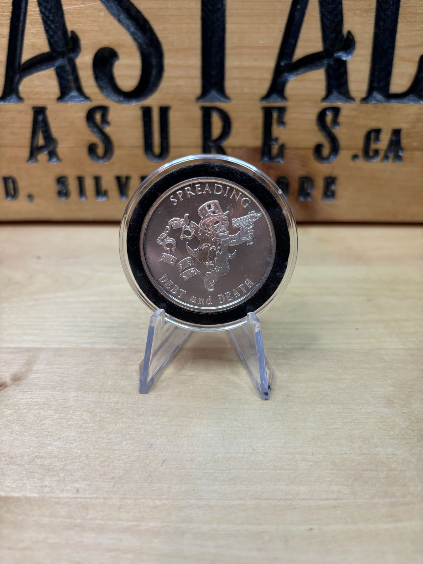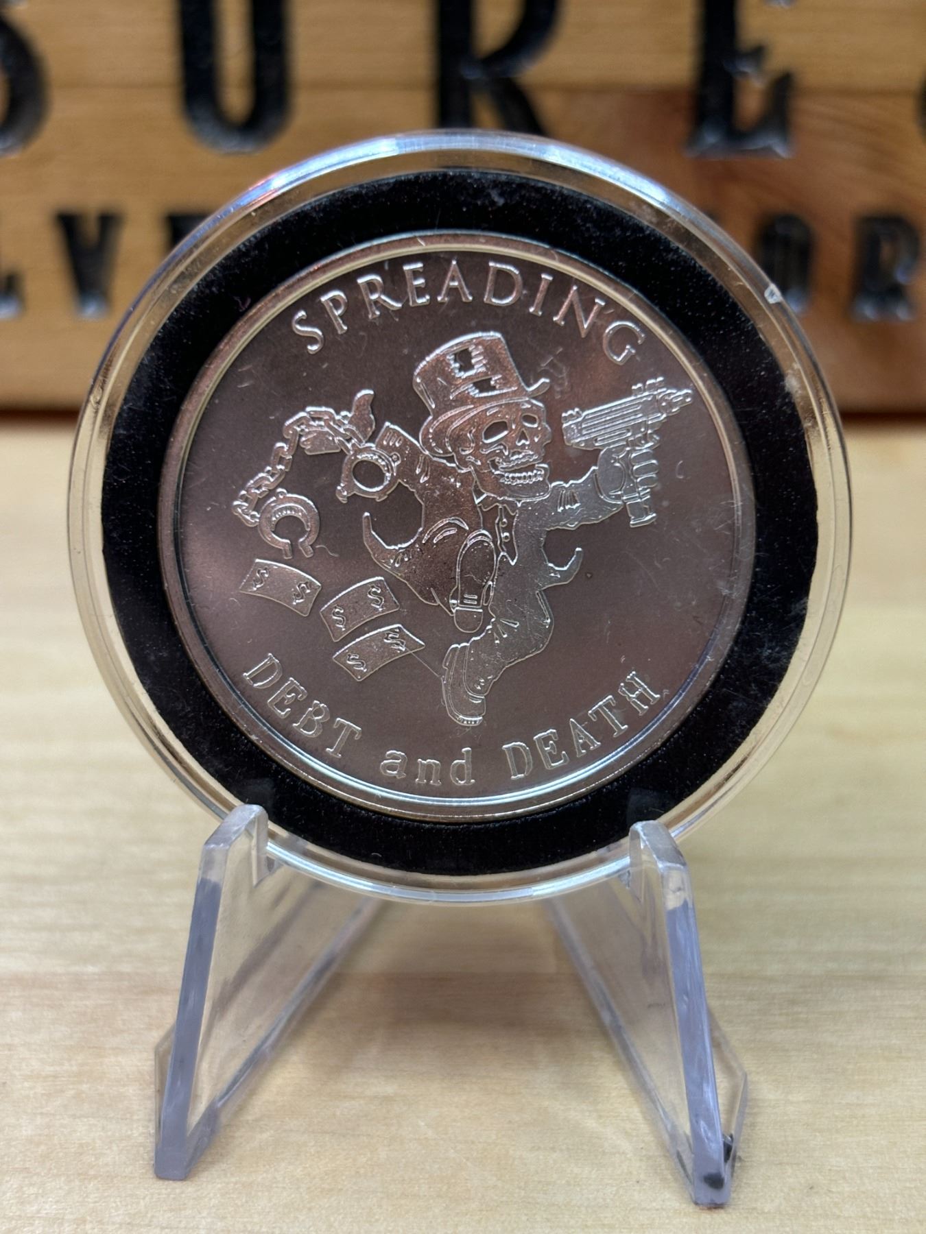 The 1 oz "Spreading Debt and Death" silver round is a striking, privately minted piece that typically features bold and thought-provoking designs. These rounds, often made of 1 ounce of 99.9% pure silver, are not legal tender but are highly sought after by collectors and those looking to invest in precious metals. The "Spreading Debt and Death" design typically features imagery related to economic instability, often highlighting themes like debt, collapse, and societal impacts. The design is both a commentary on financial issues and an artistic take on these serious topics, making it a unique addition to any collection or investment portfolio.