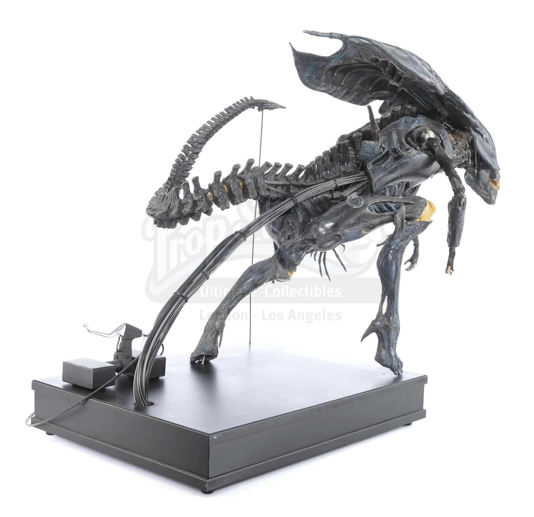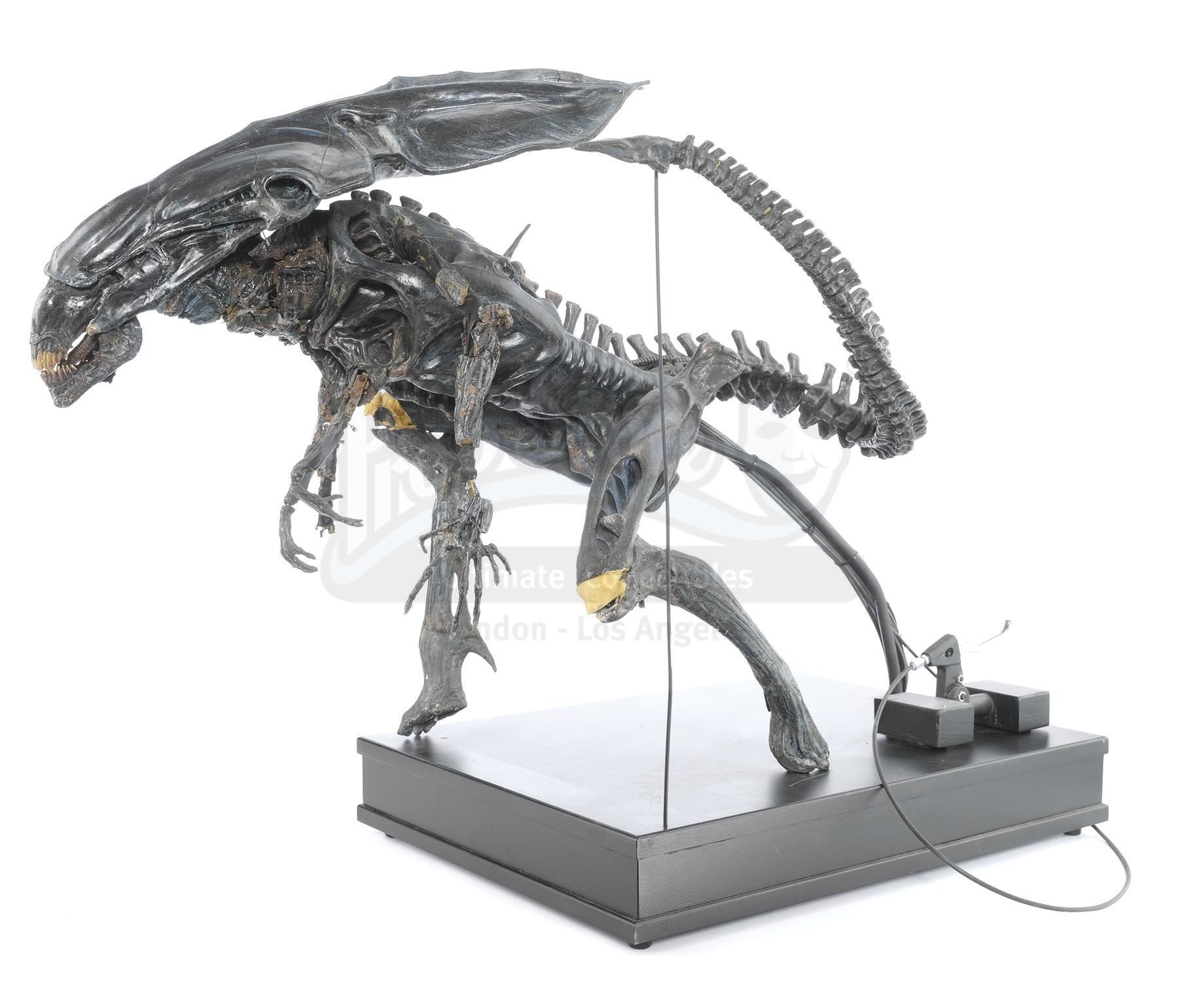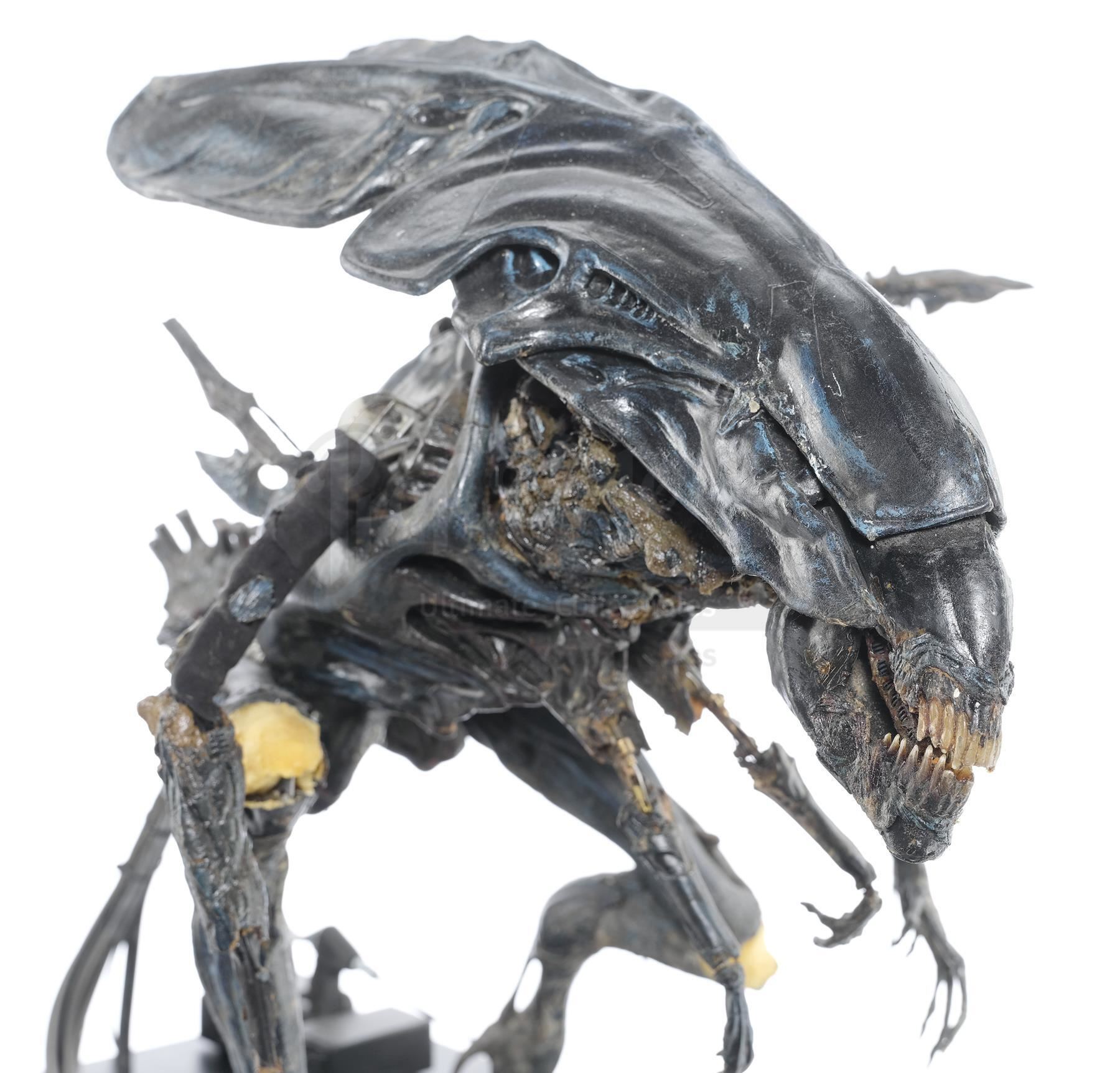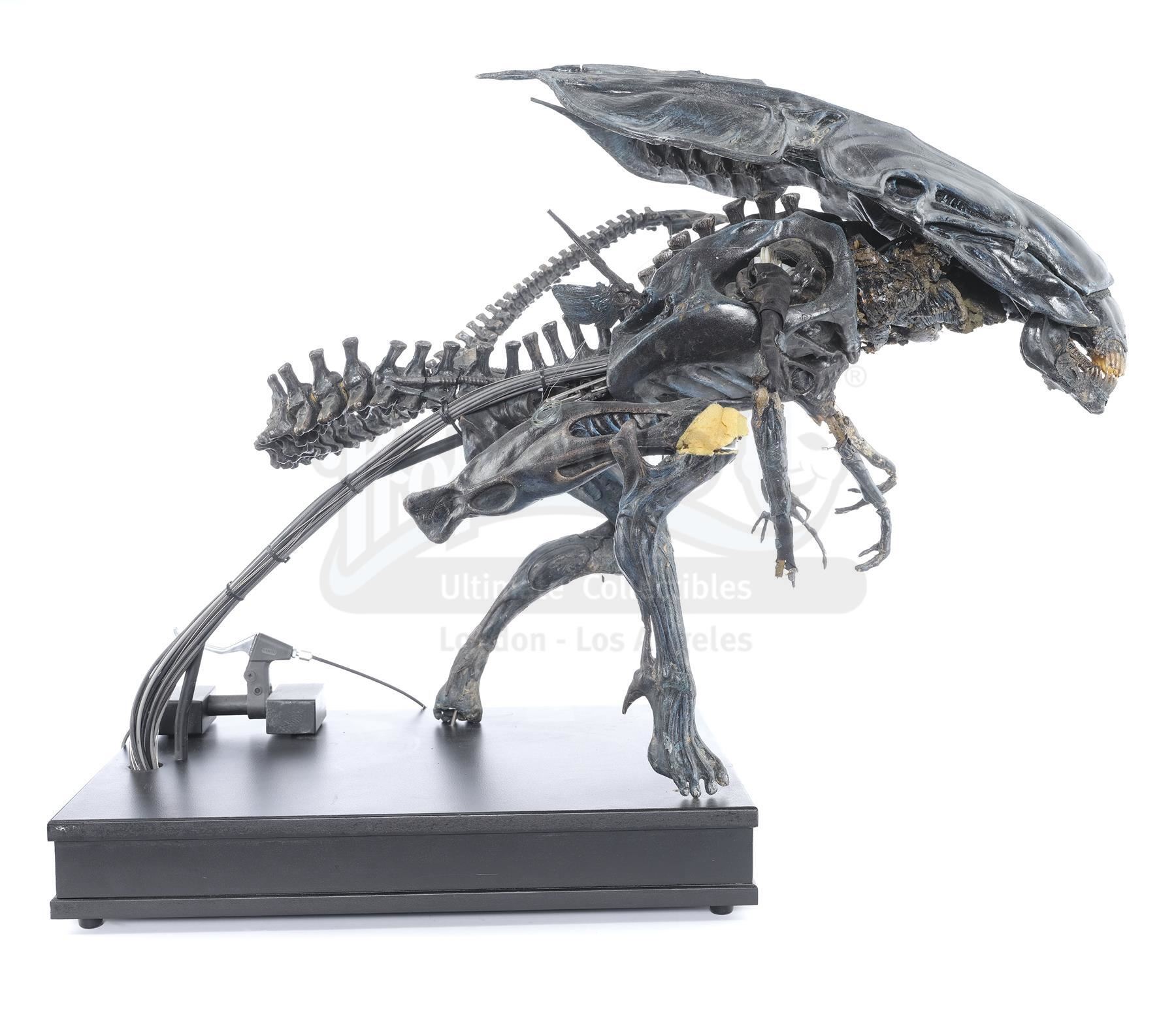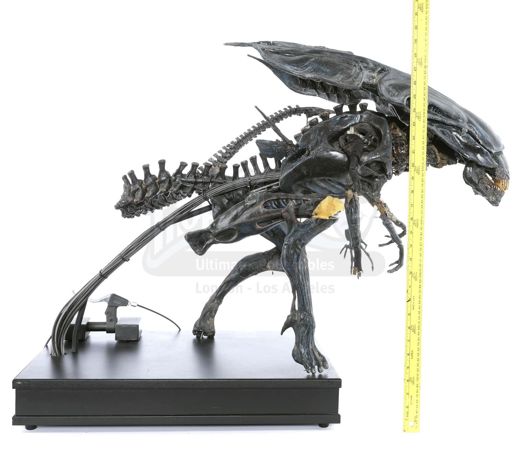This hulking, ornately detailed 1:4-scale miniature of the film's ultimate villain was conceived of by Cameron and constructed from foam latex, polyfoam, urethane, and resin components, all molded around a custom-made mechanical metal armature and painted black with the Queen's signature blue highlights by Stan Winston Studios. A cluster of cables is present in the characters back, which allowed the arms and head to be remotely puppeteered. The cables are primarily disconnected though one has been reconnected to a lever to operate the spring-loaded jaw.