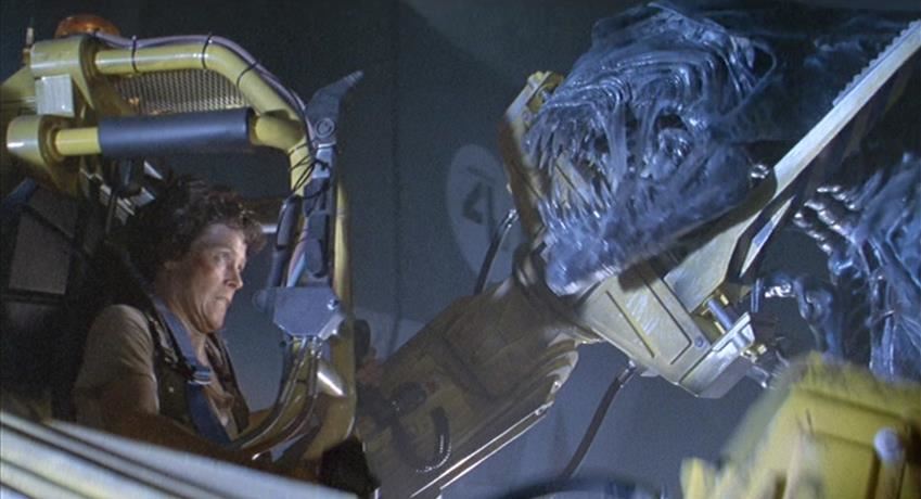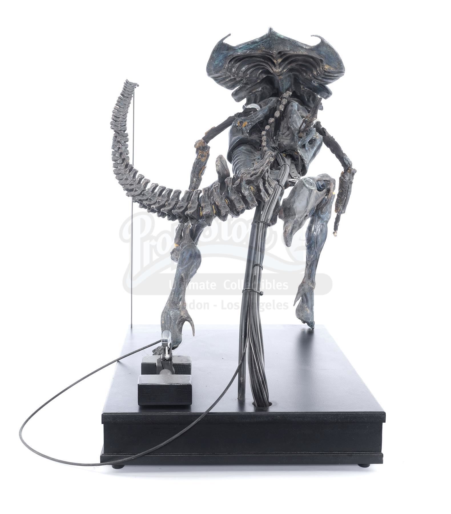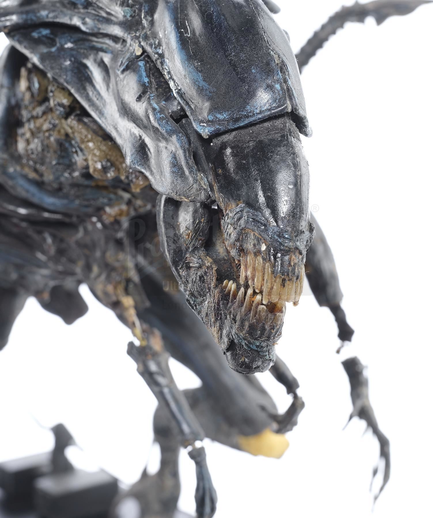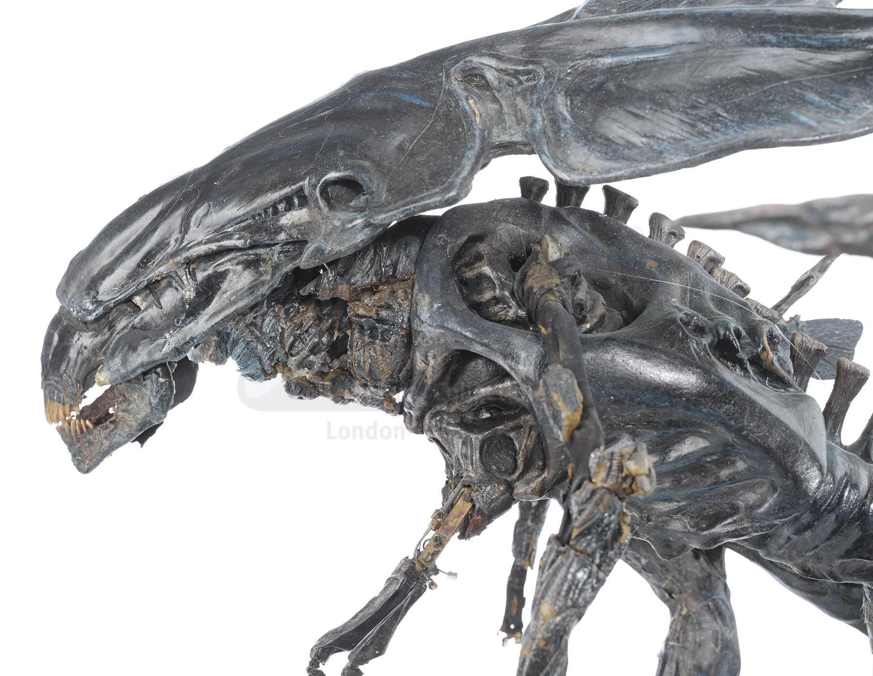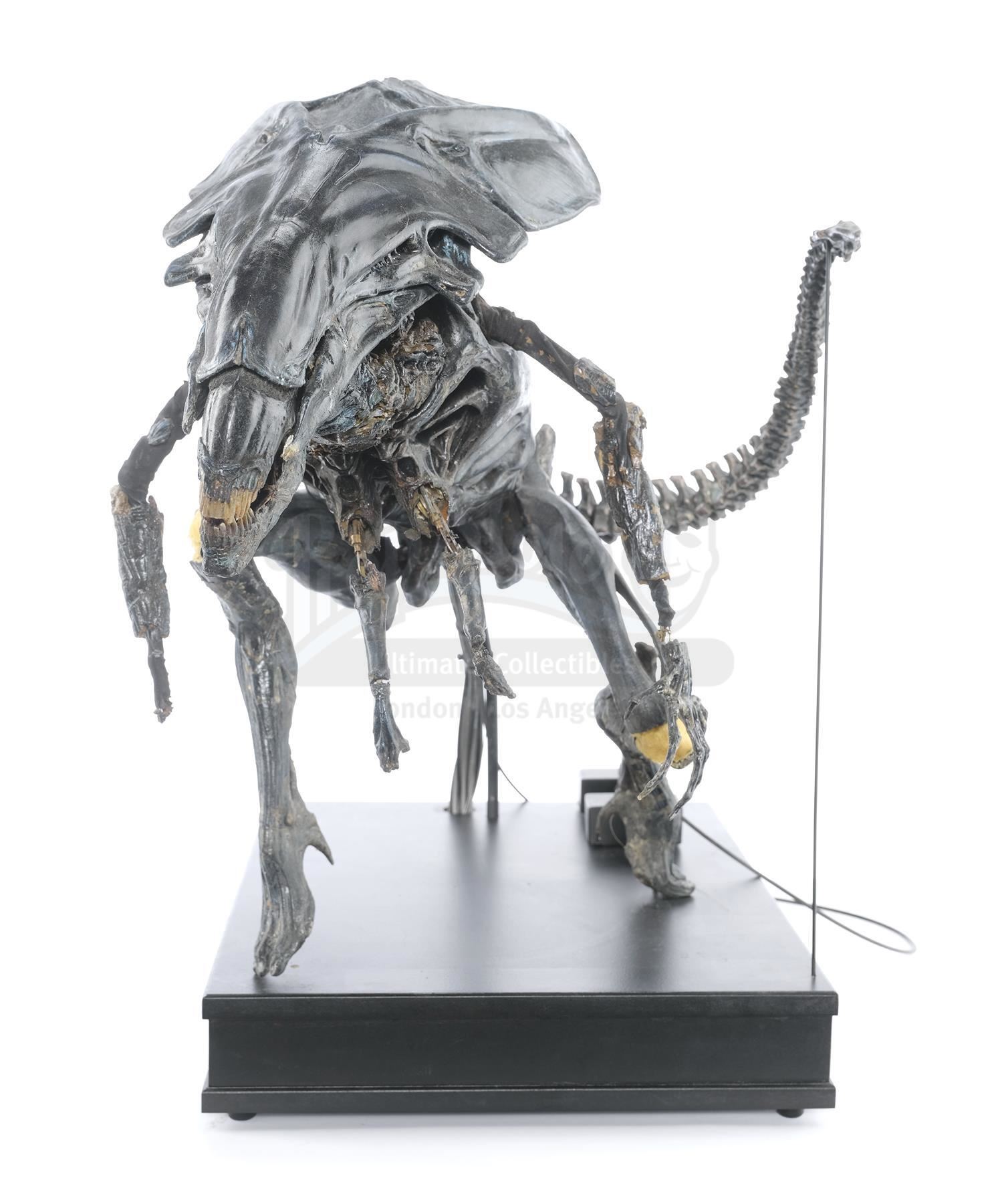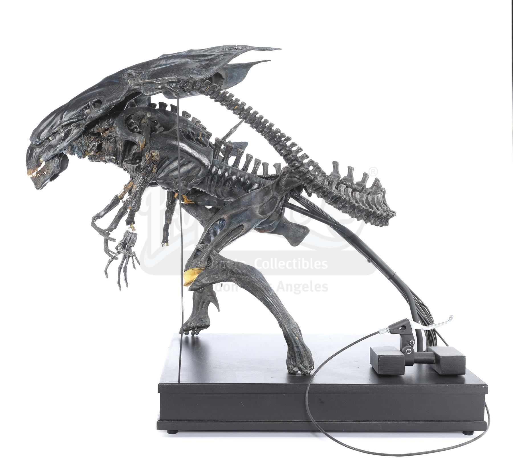 This hulking, ornately detailed 1:4-scale miniature of the film's ultimate villain was conceived of by Cameron and constructed from foam latex, polyfoam, urethane, and resin components, all molded around a custom-made mechanical metal armature and painted black with the Queen's signature blue highlights by Stan Winston Studios. A cluster of cables is present in the characters back, which allowed the arms and head to be remotely puppeteered. The cables are primarily disconnected though one has been reconnected to a lever to operate the spring-loaded jaw.