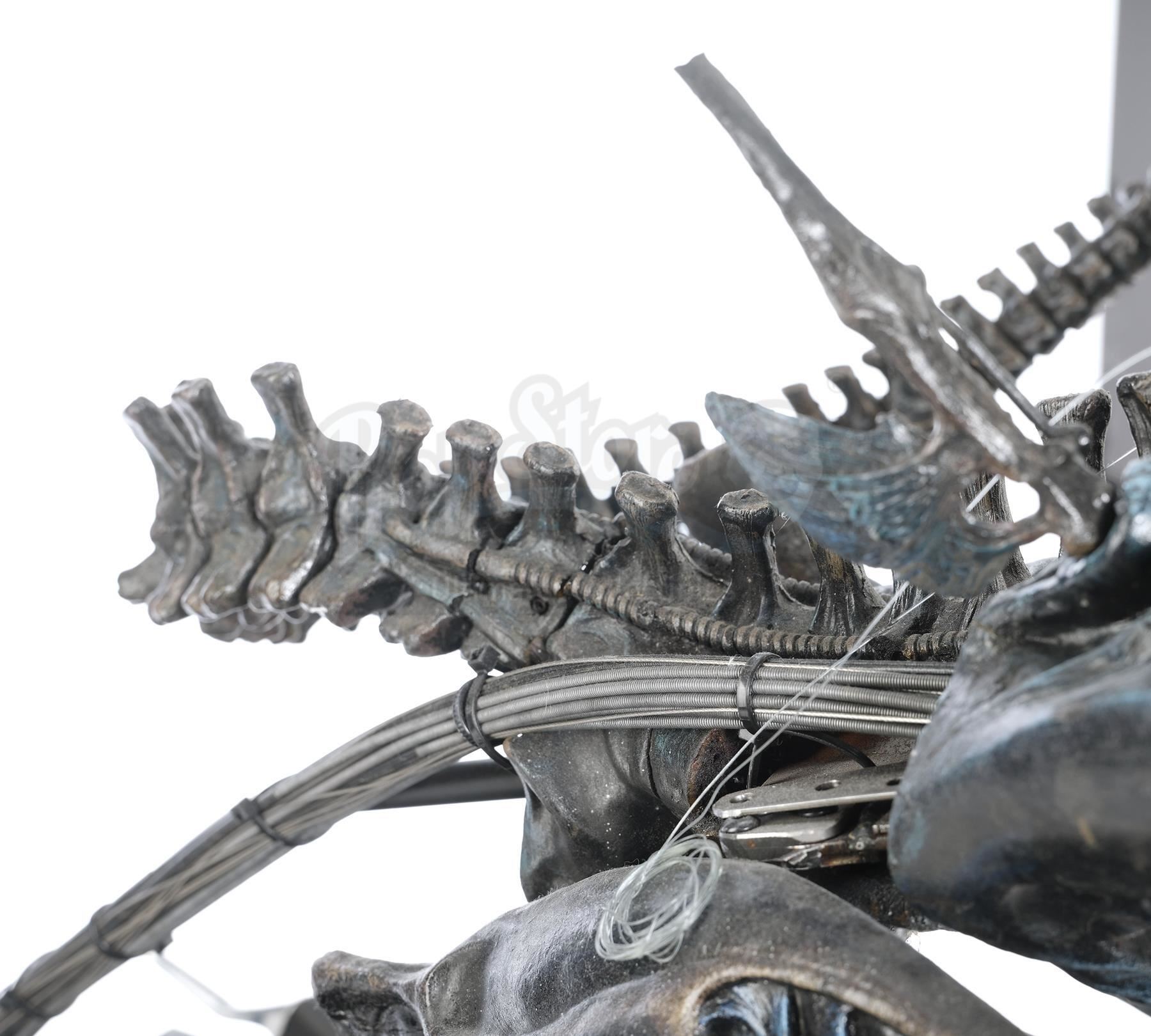 The piece is mounted to a wooden display base with metal rods, including a support for the flexible tail that holds it up in an aggressive position. While it retains its iconic finish and biomechanical details, this delicate puppet is in fair, fragile overall condition due to age and use, with deteriorated skin and missing components including the right hand. Sympathetic stabilization has been performed in order to secure the elements as they are.