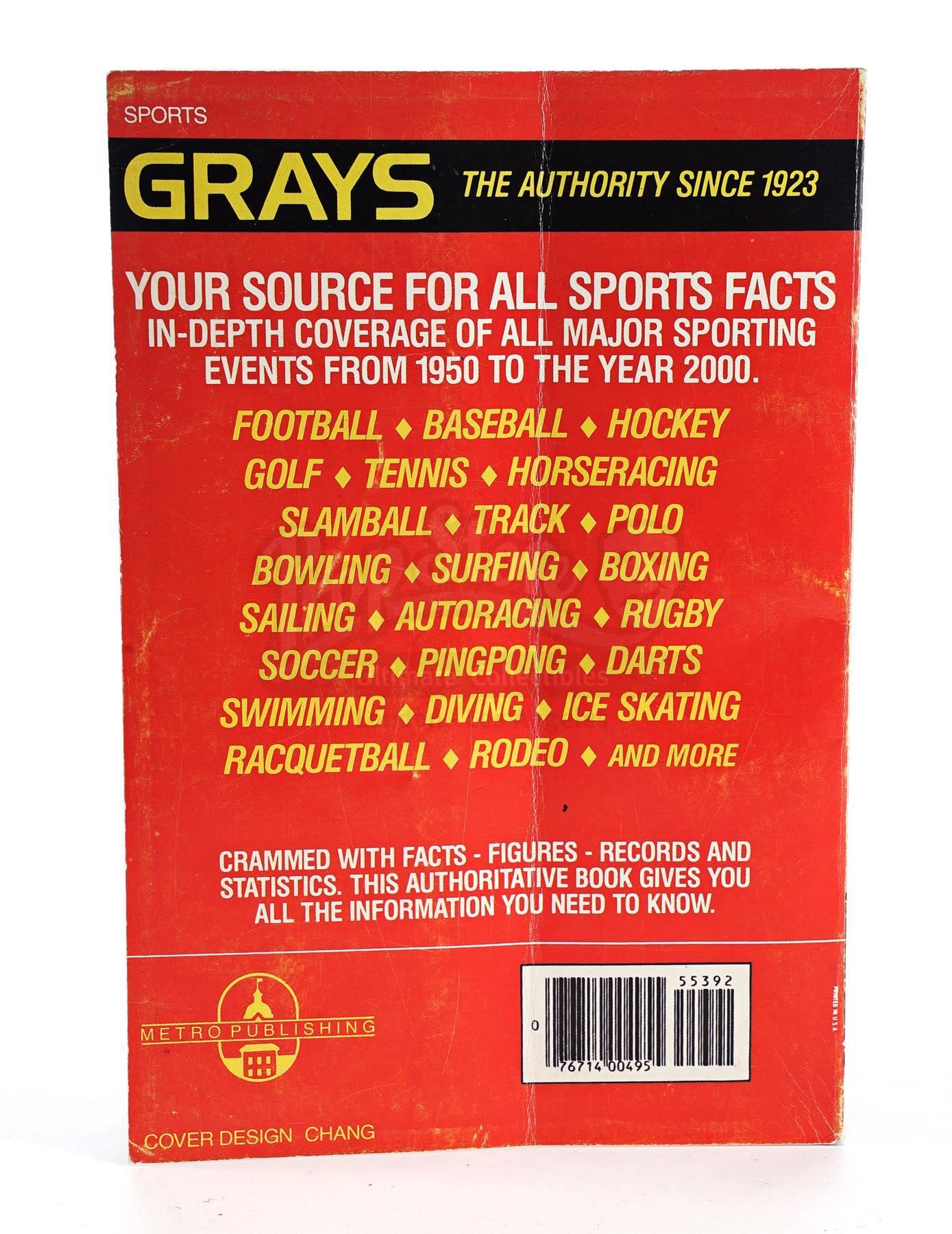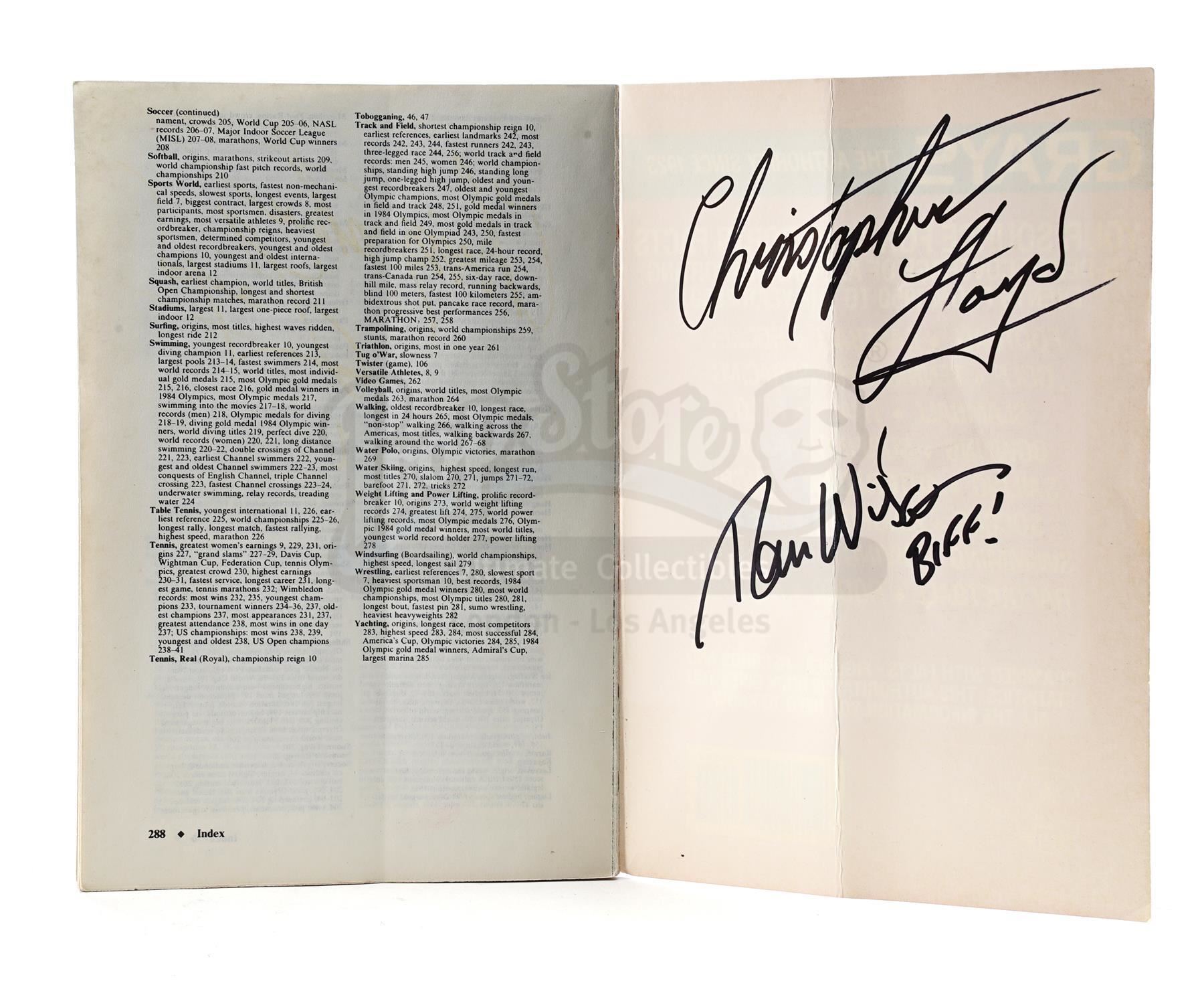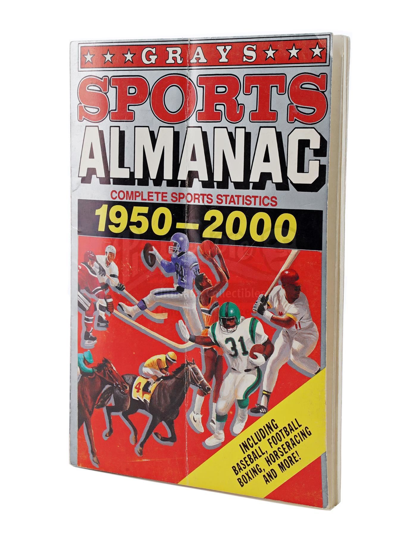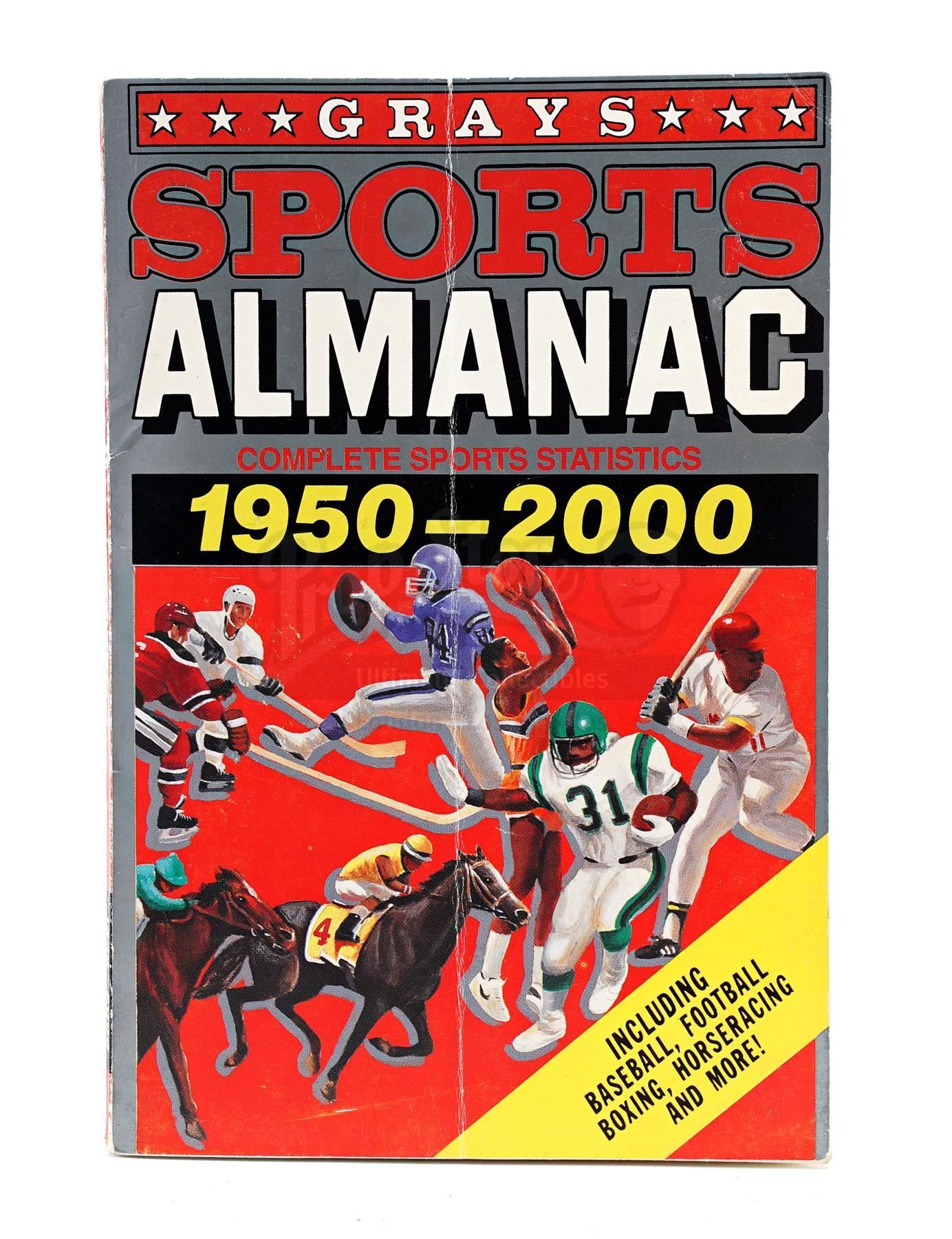 This lot will be auctioned on Tuesday, June 29th. The auction will begin at 9:00am PDT and lots are sold sequentially via live auctioneer; tune in to the live streaming broadcast on auction day to follow the pace. Note other lots in the auction may close on June 30th or July 1st. A Grays Sports Almanac from Robert Zemeckis' sci-fi sequel Back to the Future Part II signed by Christopher Lloyd and Thomas F. Wilson. Purchased by Marty McFly (Michael J. Fox) in 2015 Hill Valley, Grays Sports Almanac played a central role in the film when it was later discovered by Old Biff Tannen (Wilson), who changed the course of history by giving it to his younger self. This almanac consists of custom-made front and back covers and an interior cover page noting statistics between "1950 - 2000," all affixed to a separate real-world copy of an almanac noting statistics through 1984 and signed in black marker on the interior by Lloyd and Wilson. Also included are numerous repeating pages of statistics, including the "19 to 17" UCLA football score Biff references to demonstrate the almanac's accuracy. This almanac is in good overall condition with a prominent central crease and minor edge wear from production use. Dimensions: 9" x 6" x 1" (23 cm x 15.25 cm x 2.5 cm) Estimate: $6,000 - 8,000
