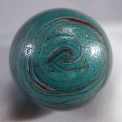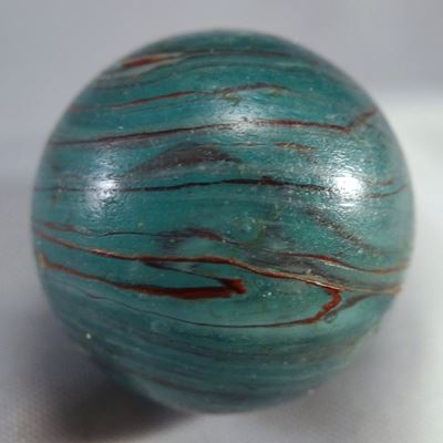 Handmade handgathered. single-pontil marble. Transparent aqua with swirls of opaque white and oxblood. Nicely faceted pontil. Some pocket wear, but no damage. Germany, circa 1850-1920. 13/16". Mint(-) (9.0).