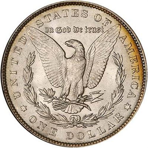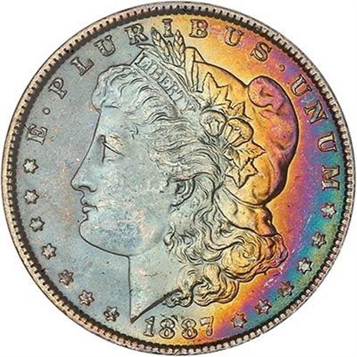 1887 Morgan Dollar. Again, we see the result of 120 years of careful storage in the obverse shadings which include 50% light or sky blue, and 50% deepening into gold, magenta, and glistening royal blue. (#7172)<p><i>from The Battle Creek Collection, Part III</i>